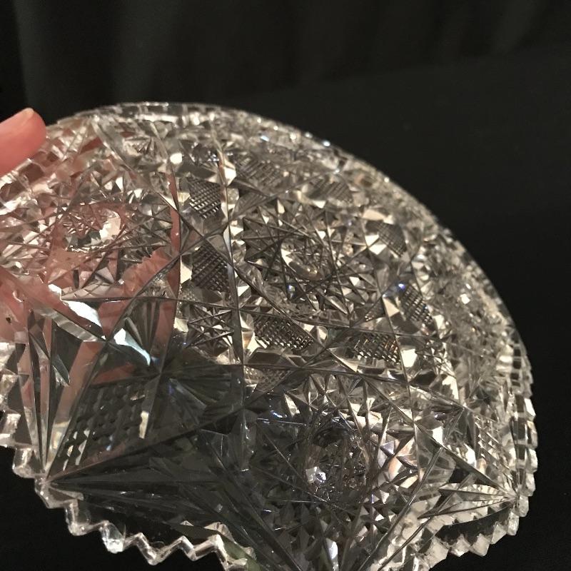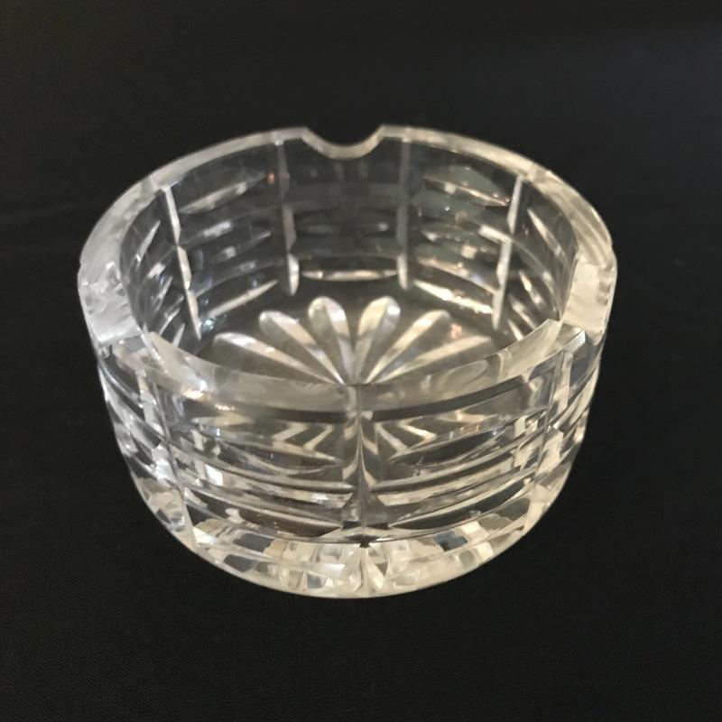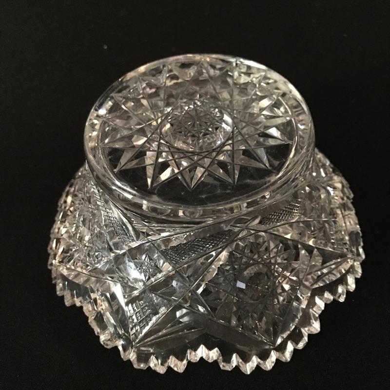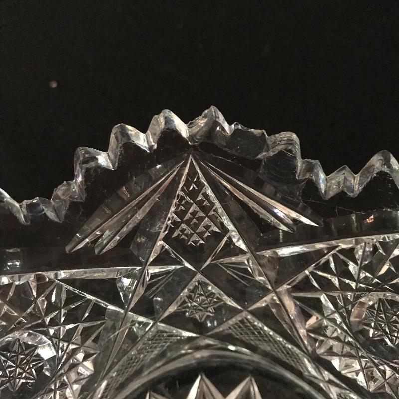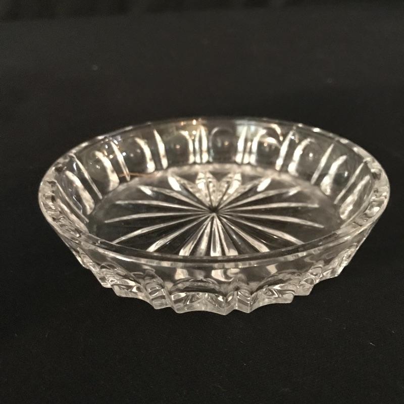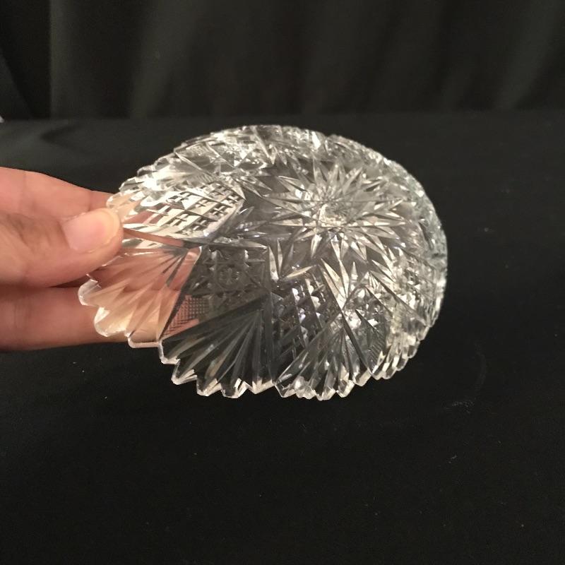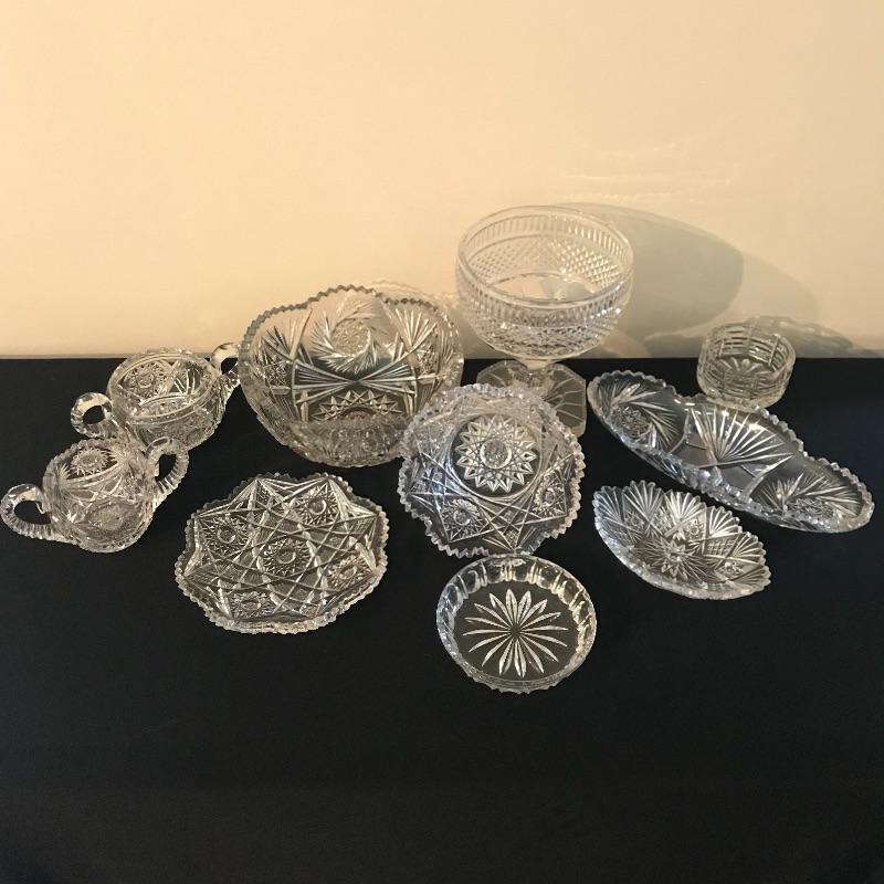 Large collection of sparkling glass. All glass pieces appear to be cut glass. From serving dishes to decor and even an ashtray can be found here. Two mustard bowls with ornate details, the smaller one having some chips in the rim. Also chips found in rims of the two round non-footed bowls. The footed serving bowl measures approximately 5.75”d x 7.25”. See photos. Shipping available.