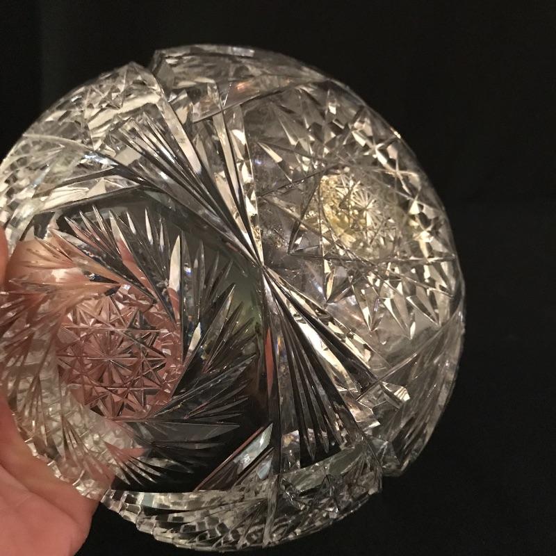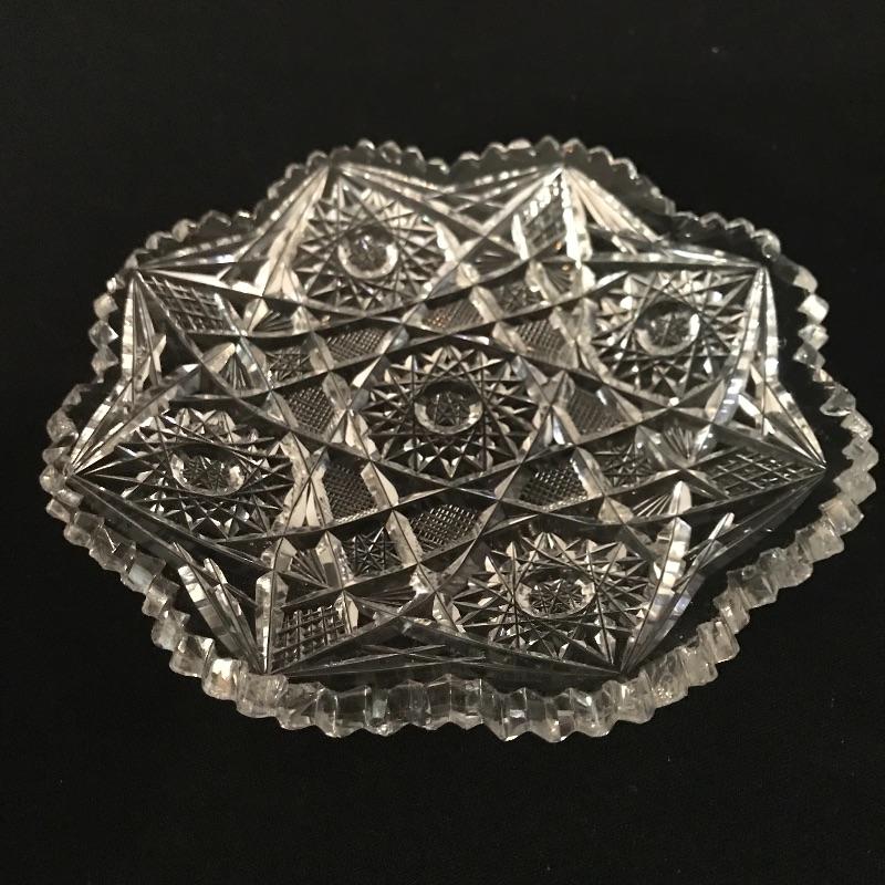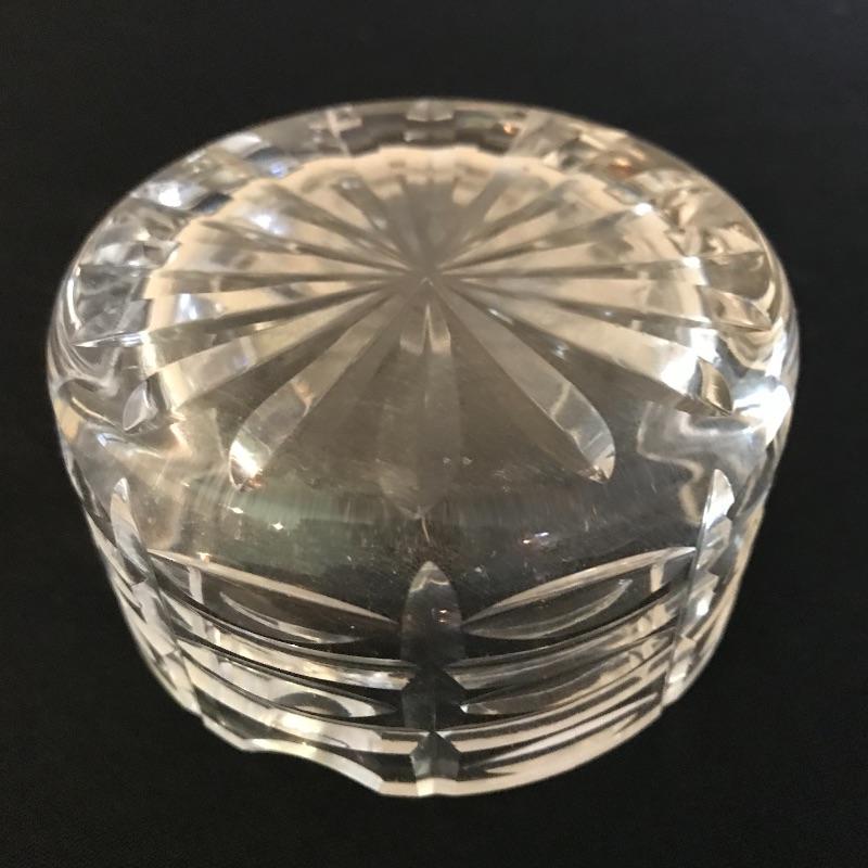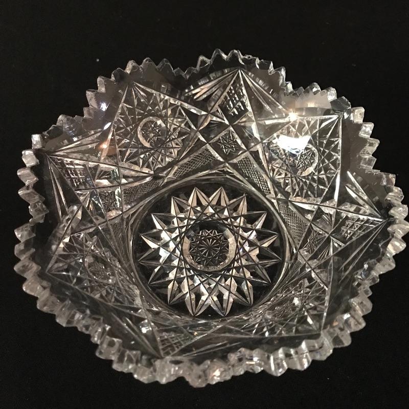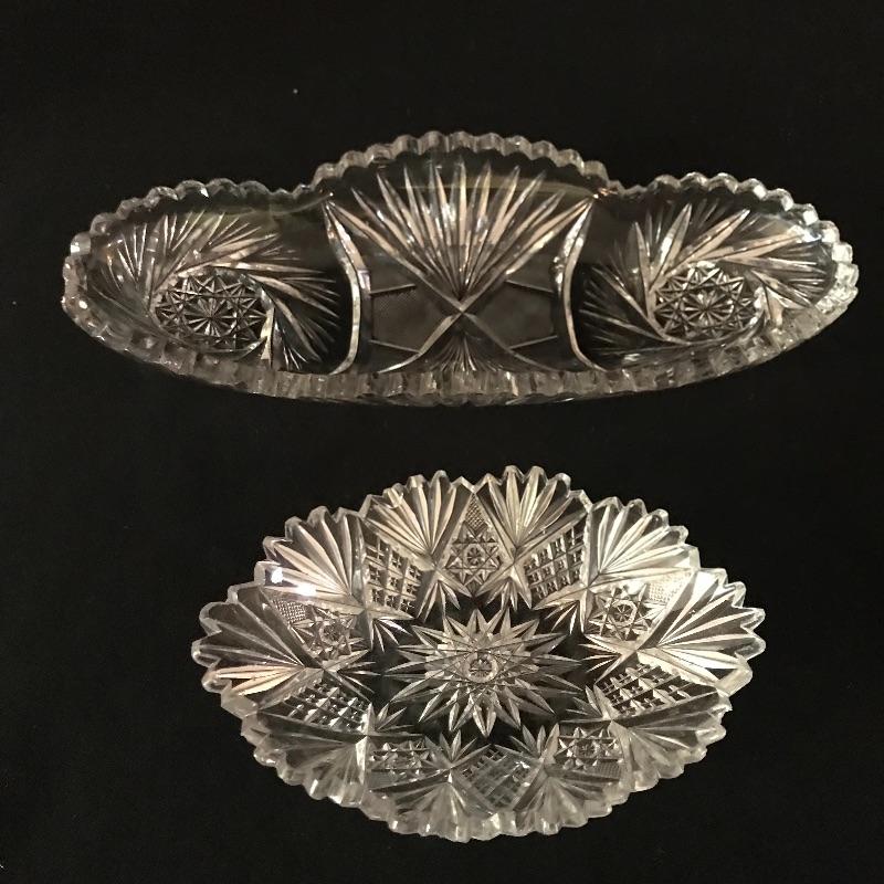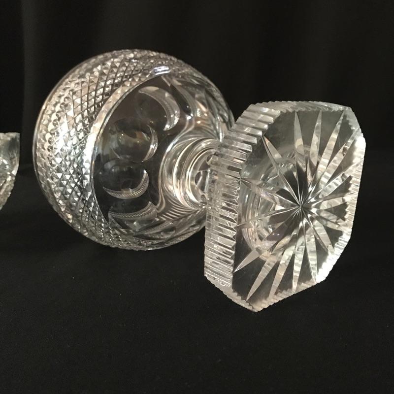 Large collection of sparkling glass. All glass pieces appear to be cut glass. From serving dishes to decor and even an ashtray can be found here. Two mustard bowls with ornate details, the smaller one having some chips in the rim. Also chips found in rims of the two round non-footed bowls. The footed serving bowl measures approximately 5.75”d x 7.25”. See photos. Shipping available.