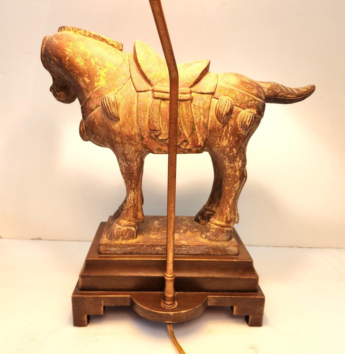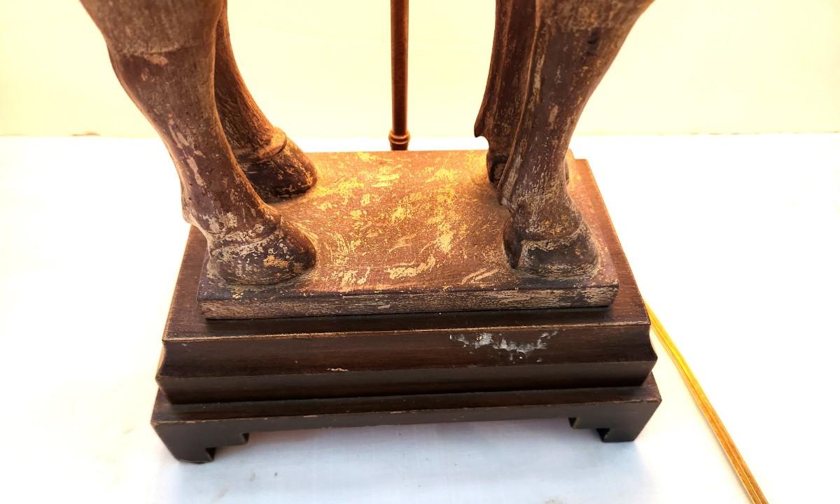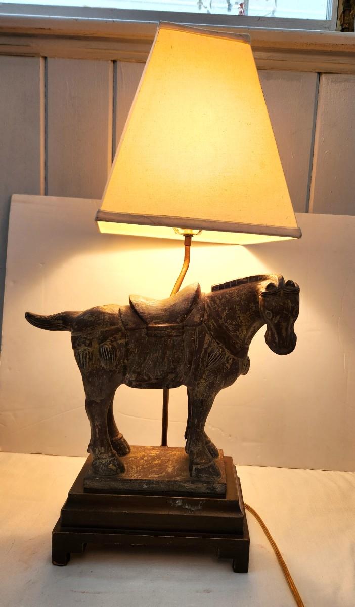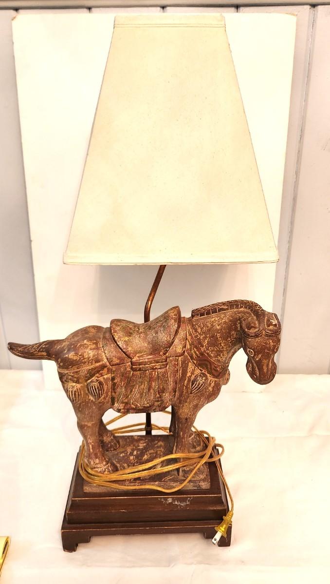 Working Decorator Lamp - Asian style Horse, wooden base, 29" tall, 10" across at base. Used condition.
