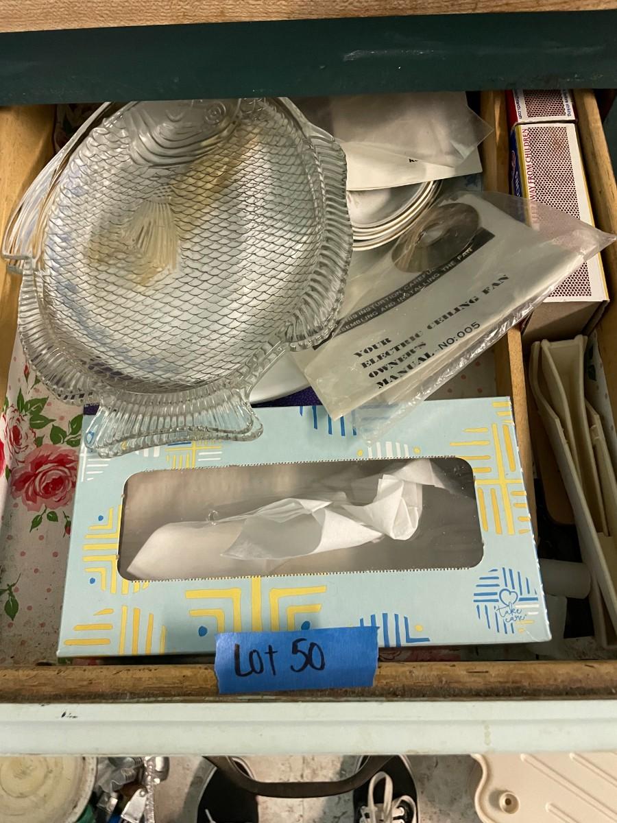 lot 50- Drawer of misc. kitchen, (2) glass fish plates