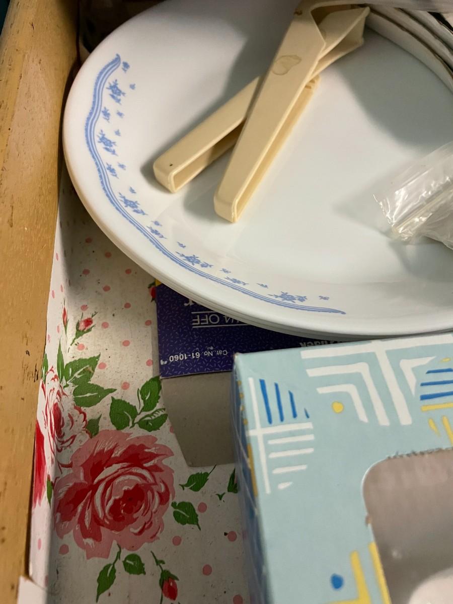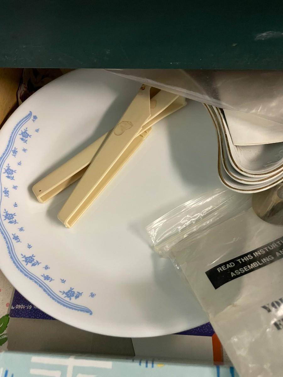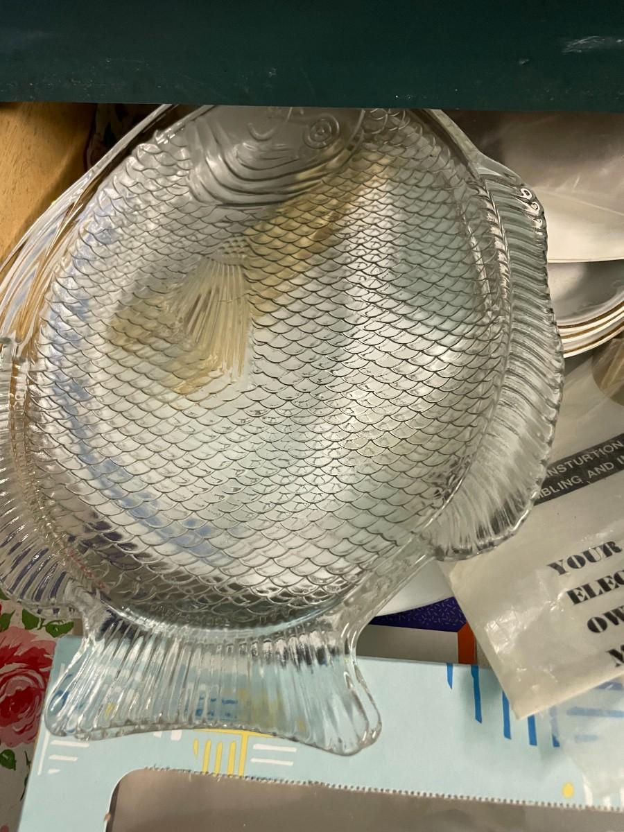 Drawer of misc. kitchen, (2) glass fish plates.