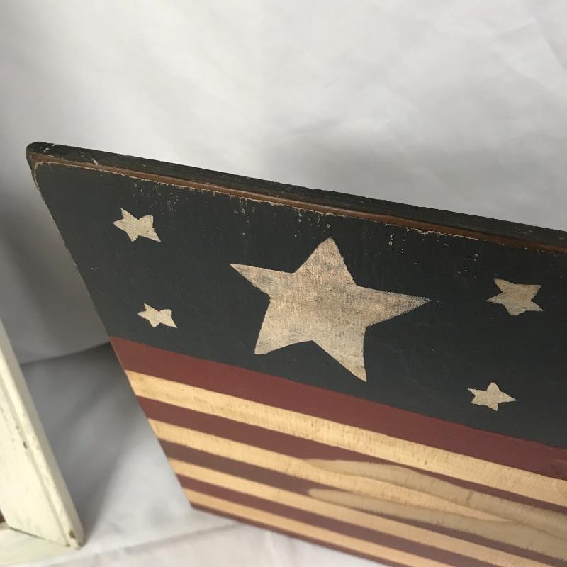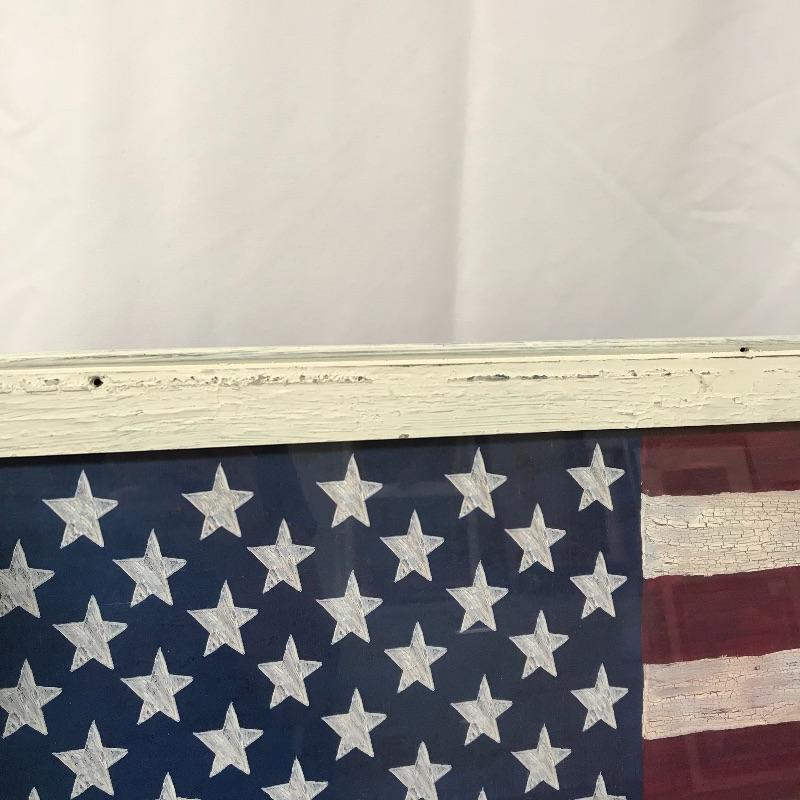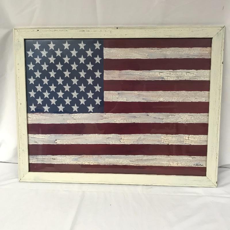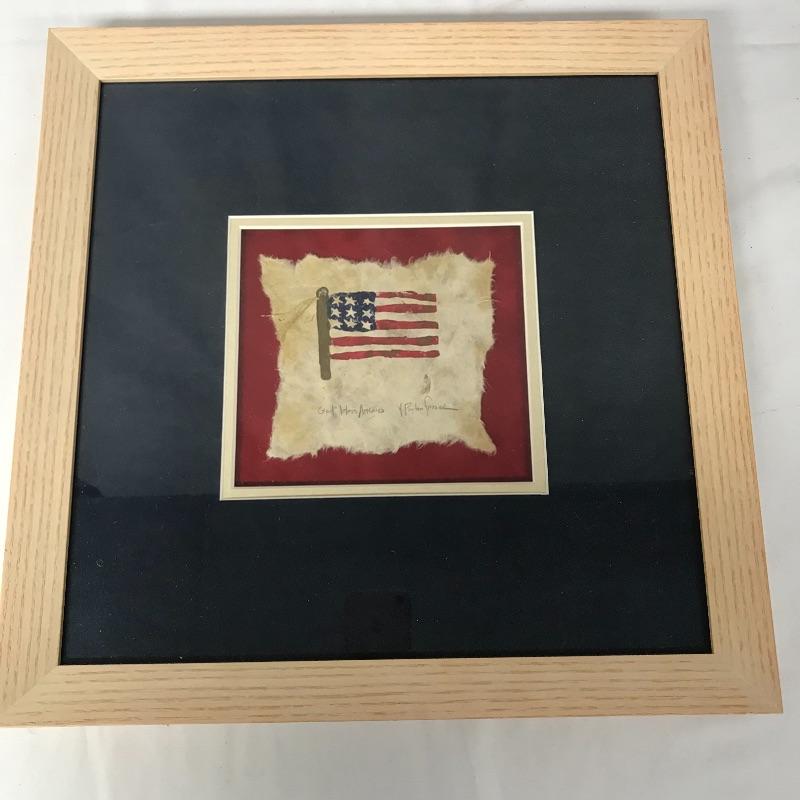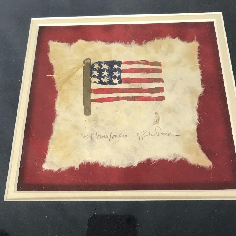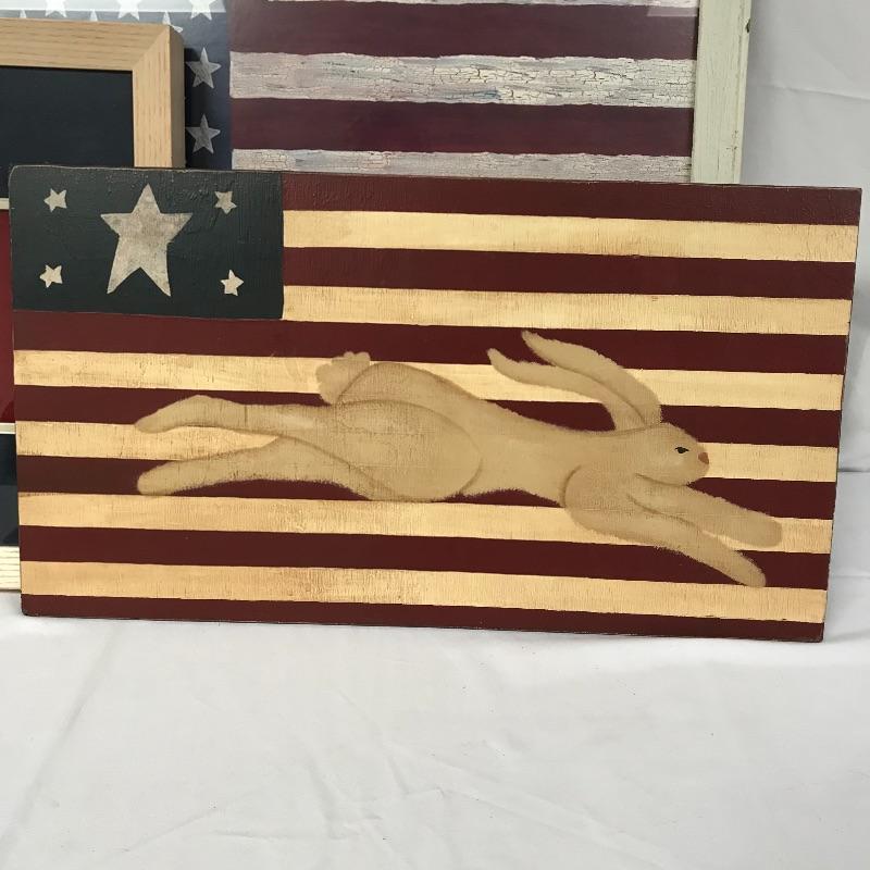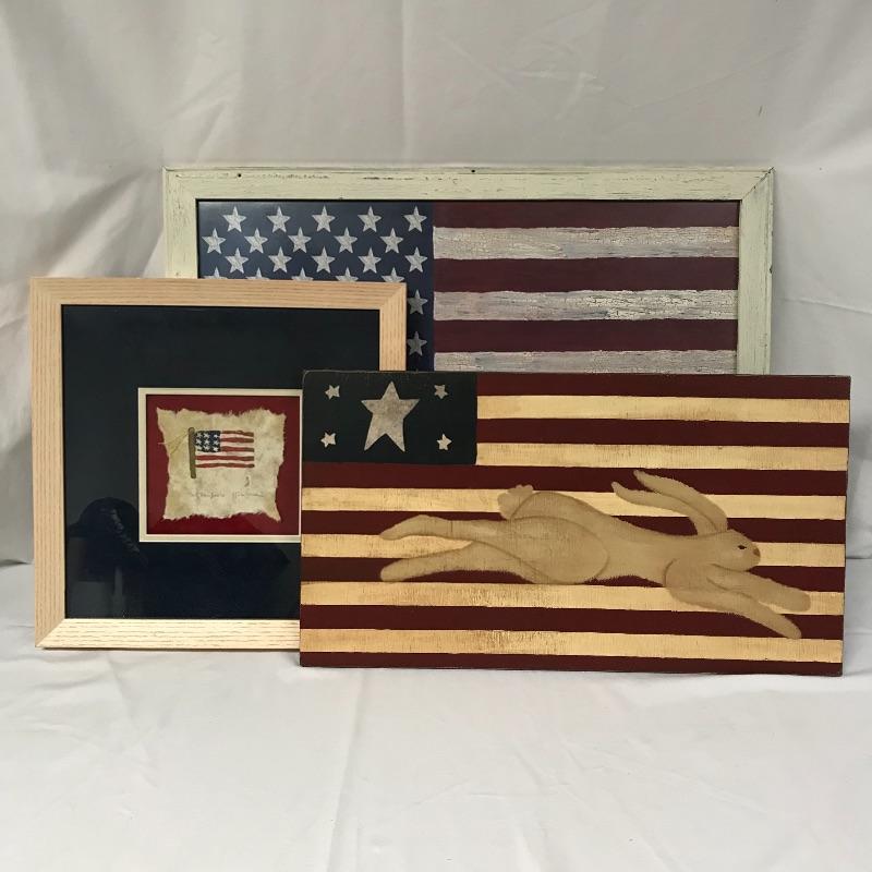 Three American Flag themed folk art by a variety of artist. The largest flag art has a 26.5” x 20.5”distressed wood frame and protective TRU VUE glass with printed signature that appears to be Gloria Bowlin. Lot also features a leaping rabbit over Stars and Stripes with a taped price tag on the backside that stating hand painted. This piece appears to be all wood, possibly pressed and measures 22.75” x 12.5”. Lastly, an interesting piece that appears original named “God Bless America” signed by H Payton Frazier. This art is on what appears to be hand made paper. The frame is thick, creating a shadow box feel with the art raised in areas. This art sits behind glass with a very nice mat and wood frame. Piece measures 15.5” x 15.75”.