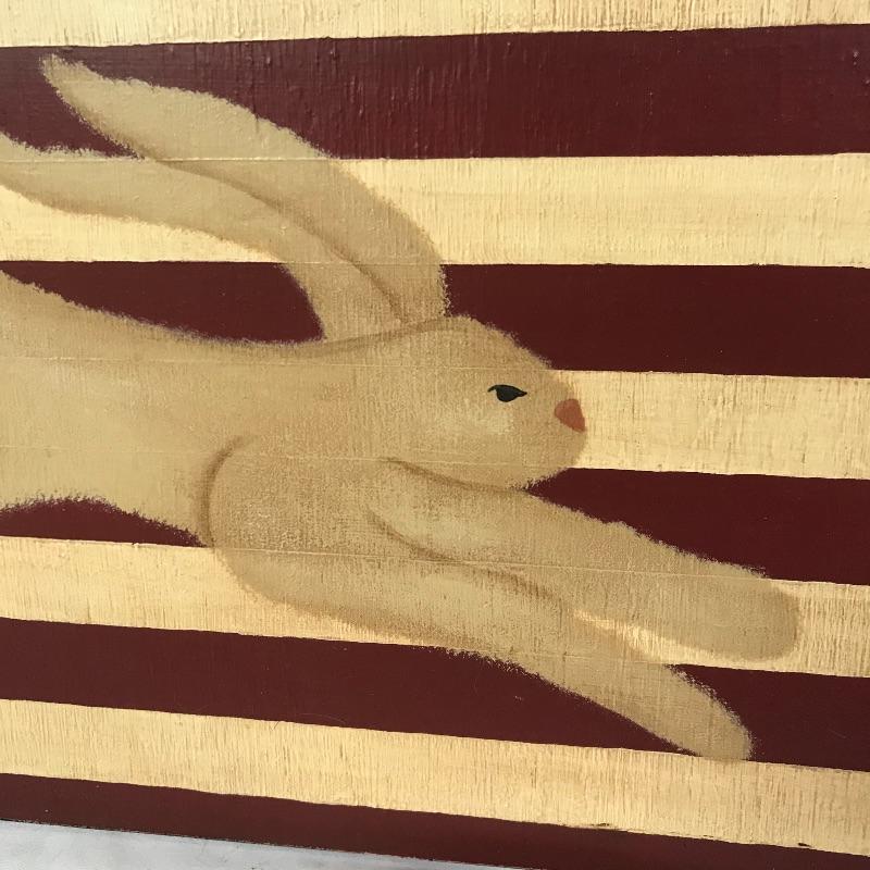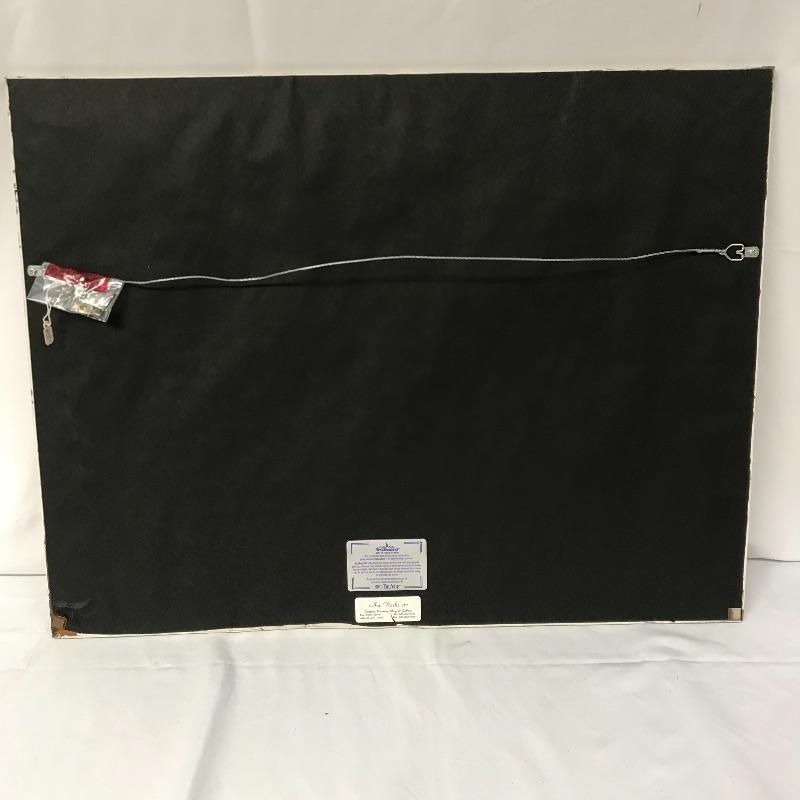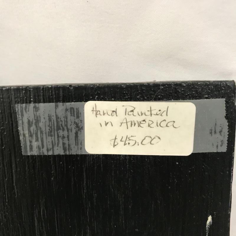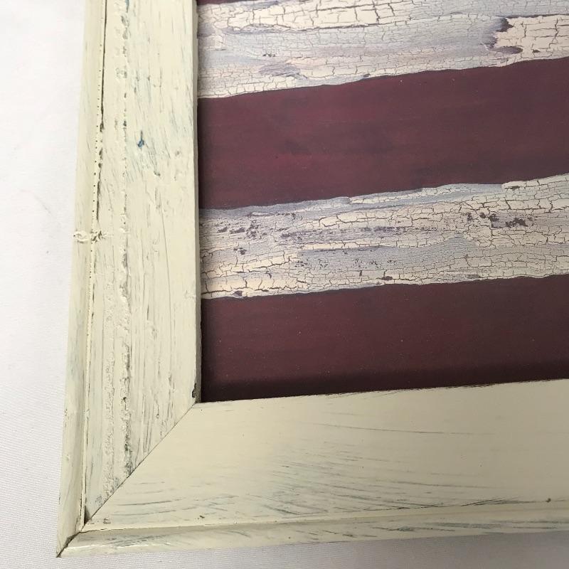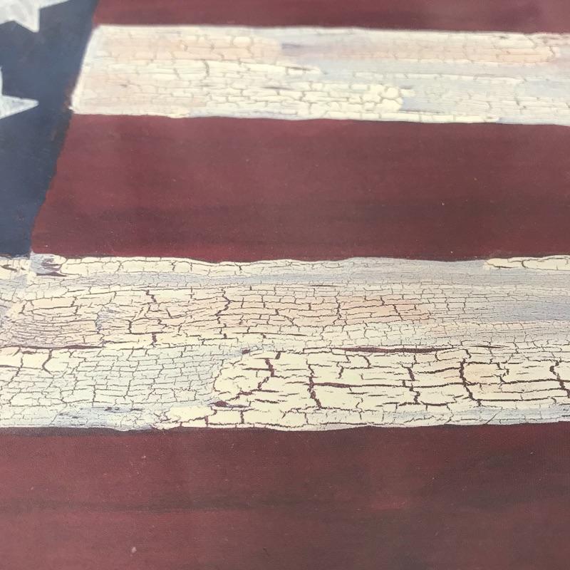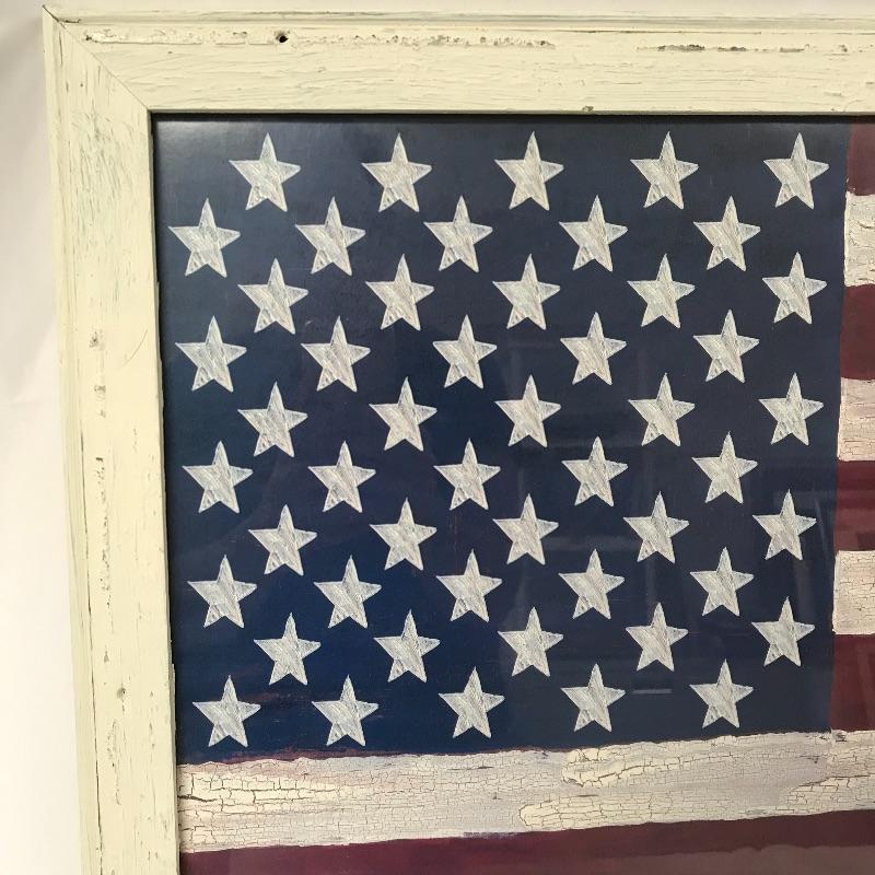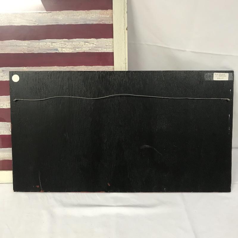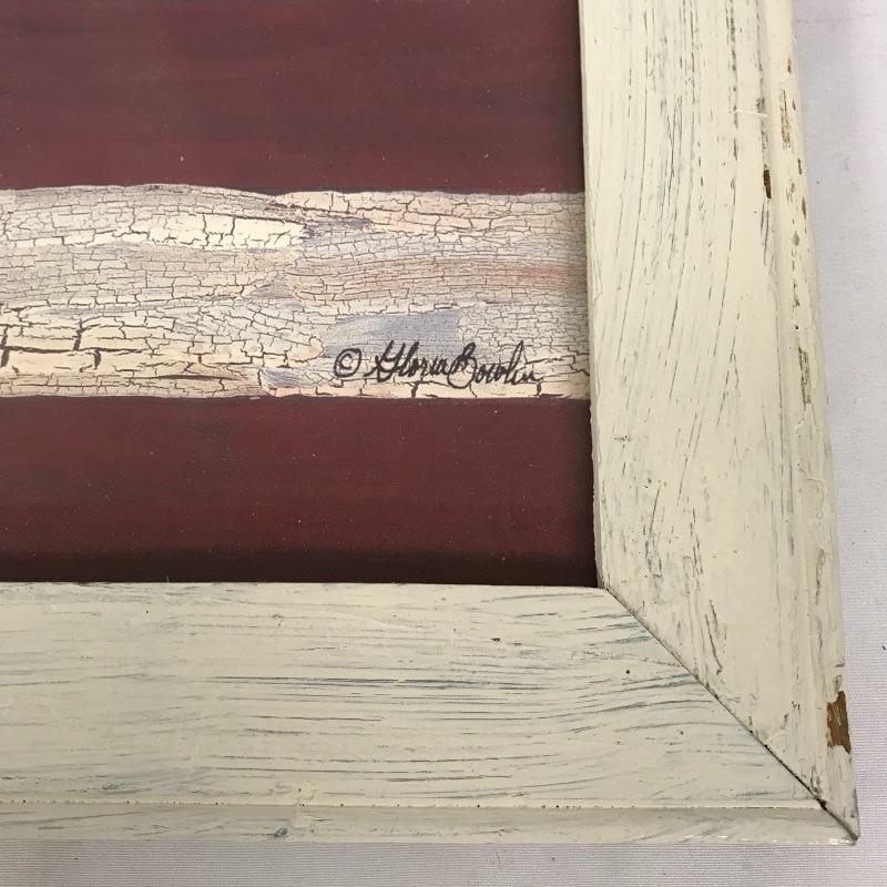 Three American Flag themed folk art by a variety of artist. The largest flag art has a 26.5” x 20.5”distressed wood frame and protective TRU VUE glass with printed signature that appears to be Gloria Bowlin. Lot also features a leaping rabbit over Stars and Stripes with a taped price tag on the backside that stating hand painted. This piece appears to be all wood, possibly pressed and measures 22.75” x 12.5”. Lastly, an interesting piece that appears original named “God Bless America” signed by H Payton Frazier. This art is on what appears to be hand made paper. The frame is thick, creating a shadow box feel with the art raised in areas. This art sits behind glass with a very nice mat and wood frame. Piece measures 15.5” x 15.75”.