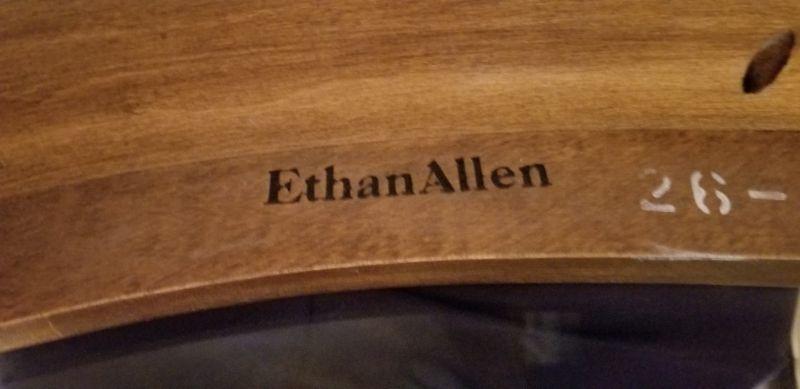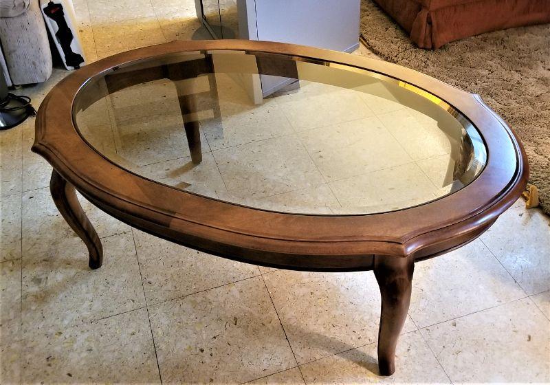 Very nice Ethan Allen Coffee Table with beveled glass insert - glass lifts out for travel. 48" long, 32" wide, 17" tall. Excellent condition.