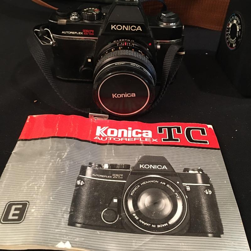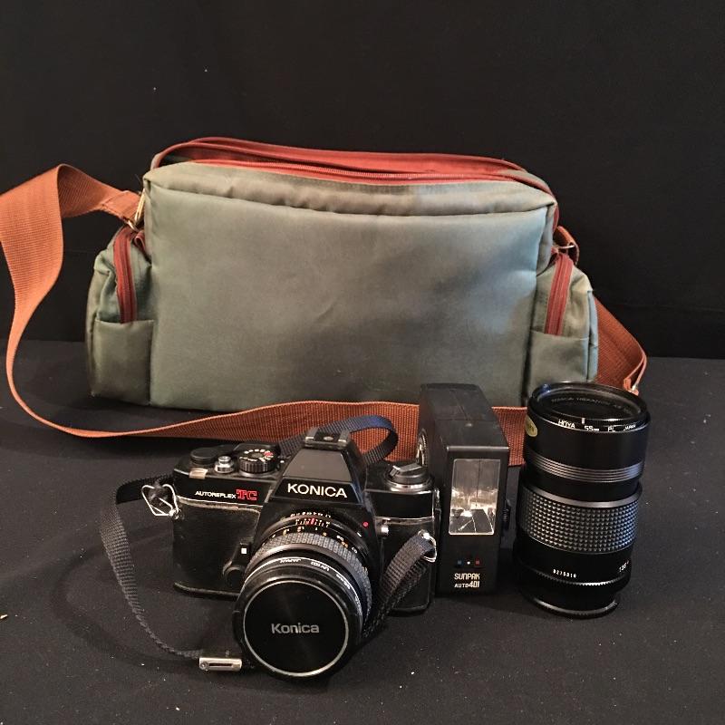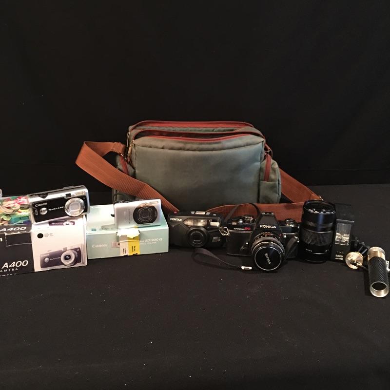 A cool find for the camera buff includes a Konica Autoreflex TC film camera and Konica Hexanon AR 135 MM F-3.5 lense, Sunpak auto401 flash, Pentax EZY-R Film camera and Canon Power Shots model # A 400 and SD1300 IS. no cameras were tested as batteries or film are needed.