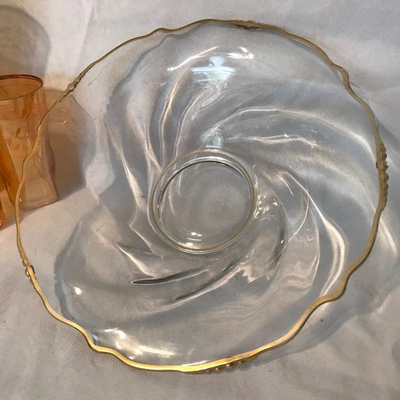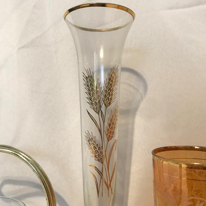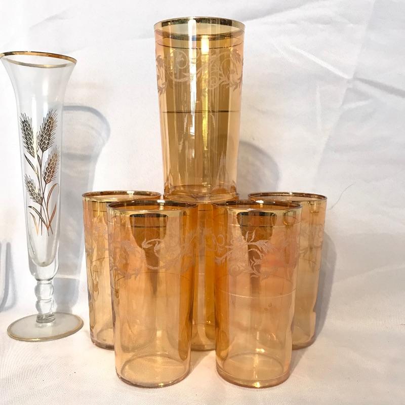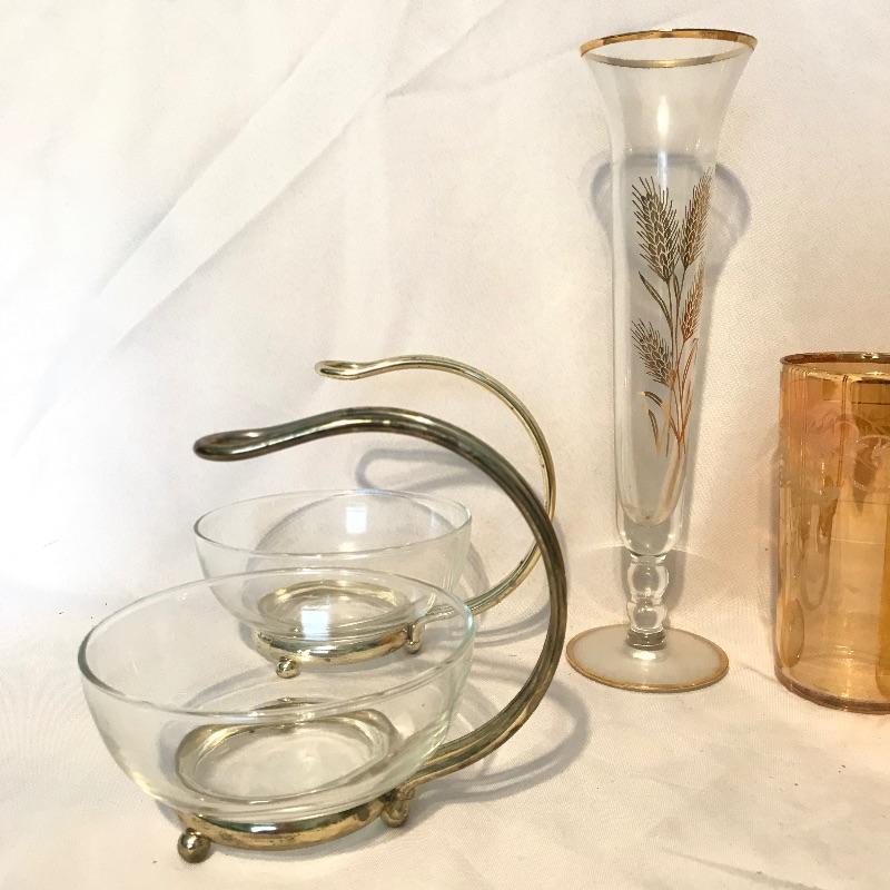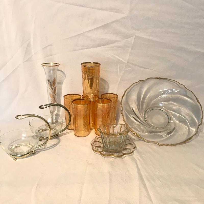 Nice entertaining lot with gold colored accents throughout. Lot features six gold accented orange glasses that have that carnival sheen. The largest serving bowl is approximately 12”d x 3”. Other pieces include a bowl/saucer set with an H marking on both pieces and a gold speckled plastic spoon. Two unique serving bowls with metal handles (one has had some gold colored finish rubbed away. The last piece is a classic wheat design on a champagne flute. All gold rims are in fairly good condition, but not perfect. See photos. Local pick up only.