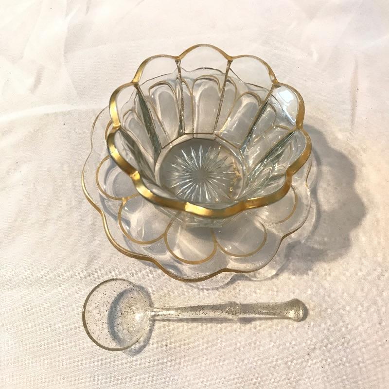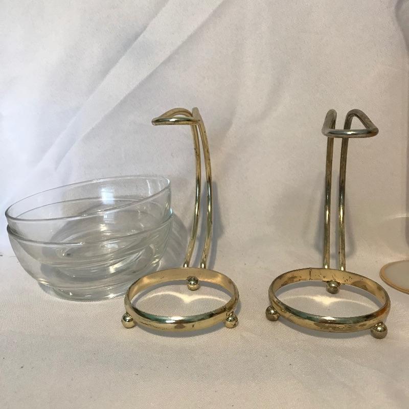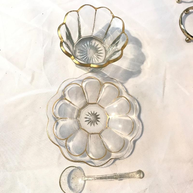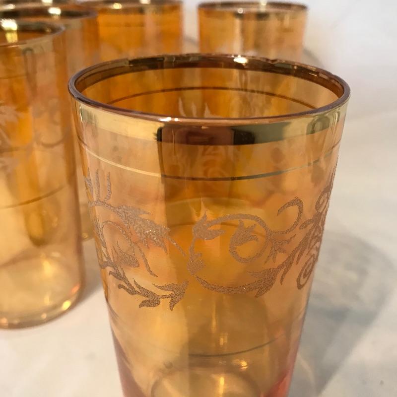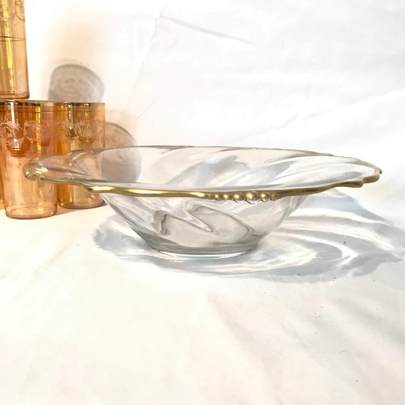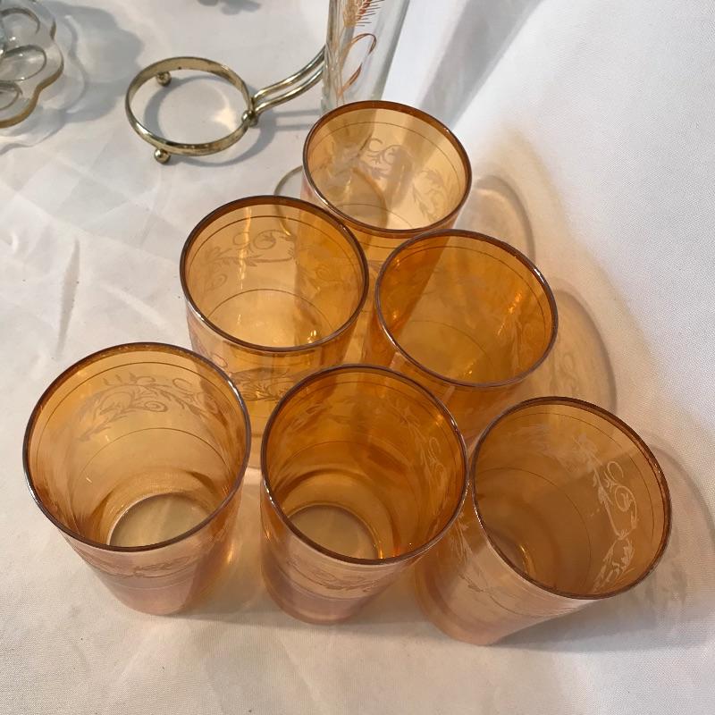 Nice entertaining lot with gold colored accents throughout. Lot features six gold accented orange glasses that have that carnival sheen. The largest serving bowl is approximately 12”d x 3”. Other pieces include a bowl/saucer set with an H marking on both pieces and a gold speckled plastic spoon. Two unique serving bowls with metal handles (one has had some gold colored finish rubbed away. The last piece is a classic wheat design on a champagne flute. All gold rims are in fairly good condition, but not perfect. See photos. Local pick up only.