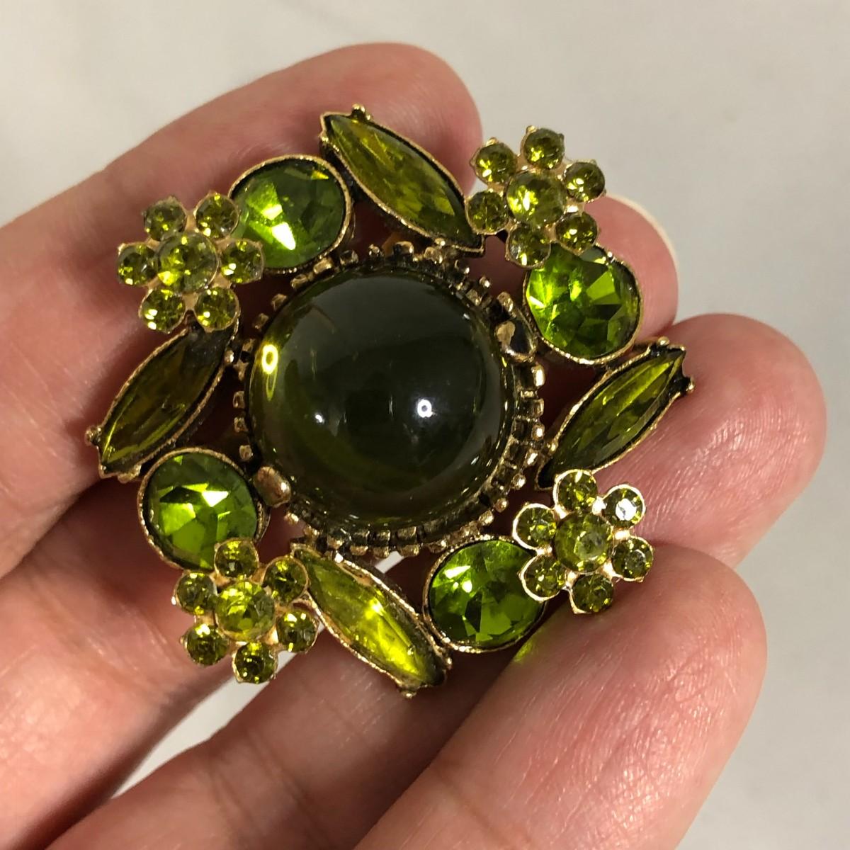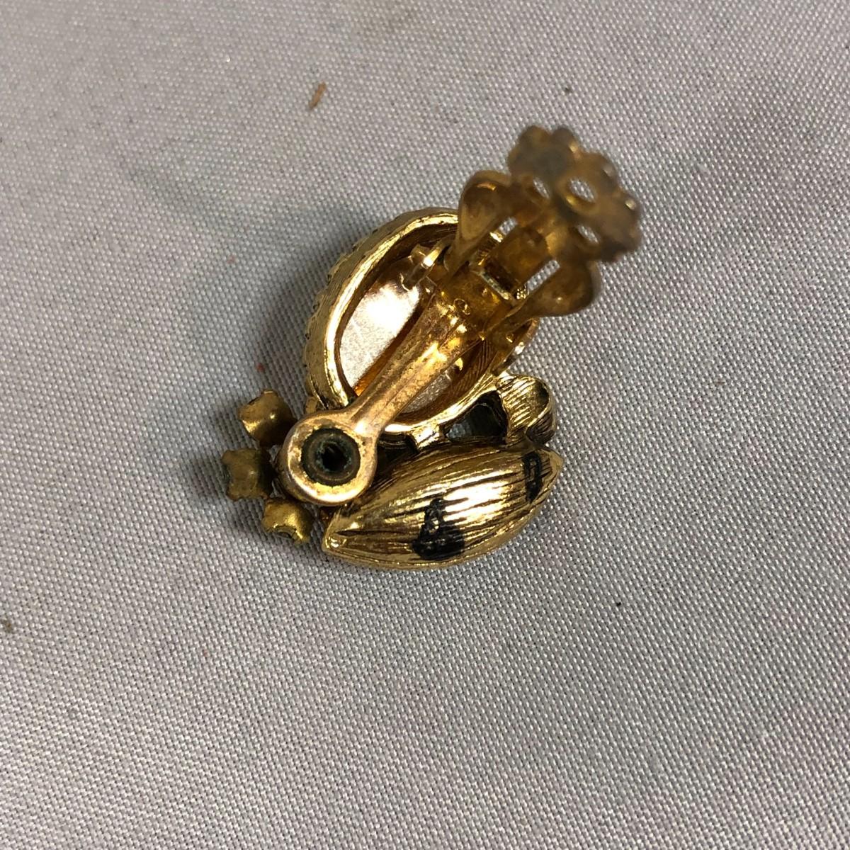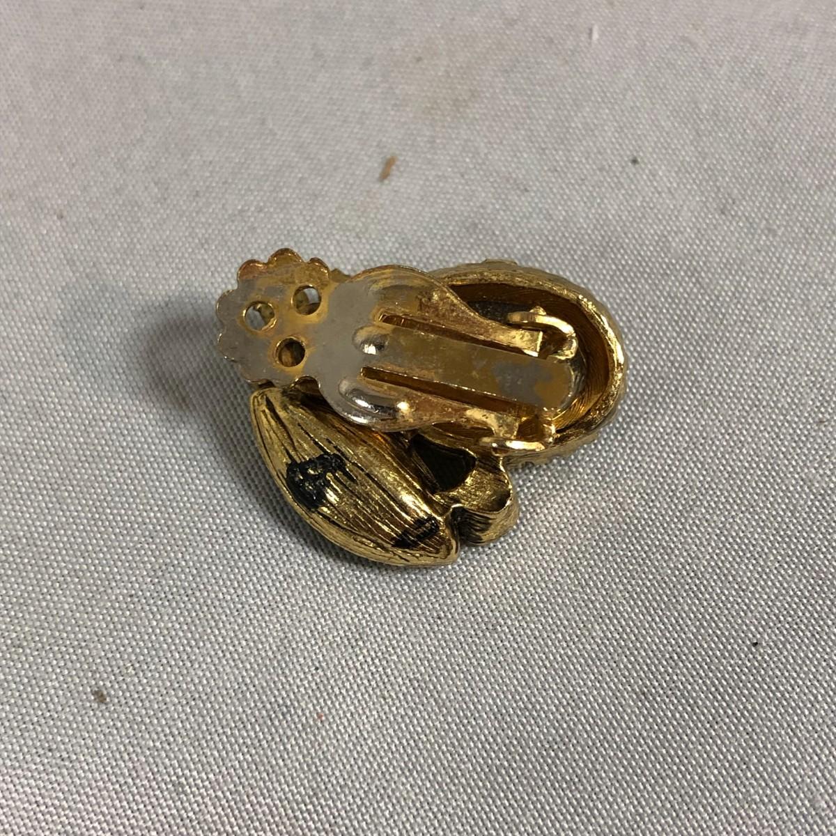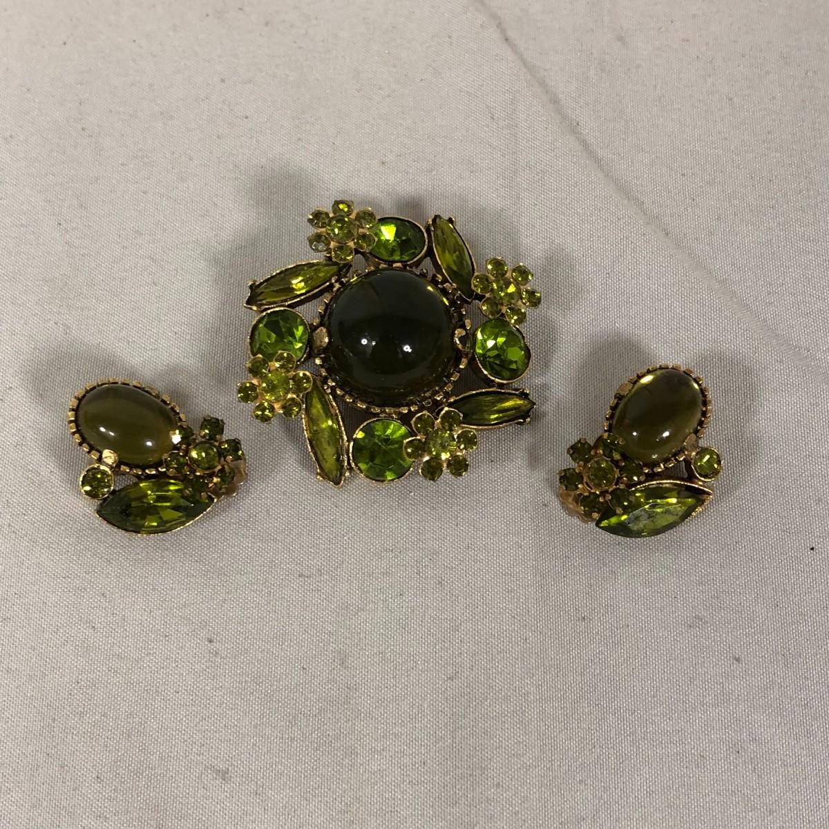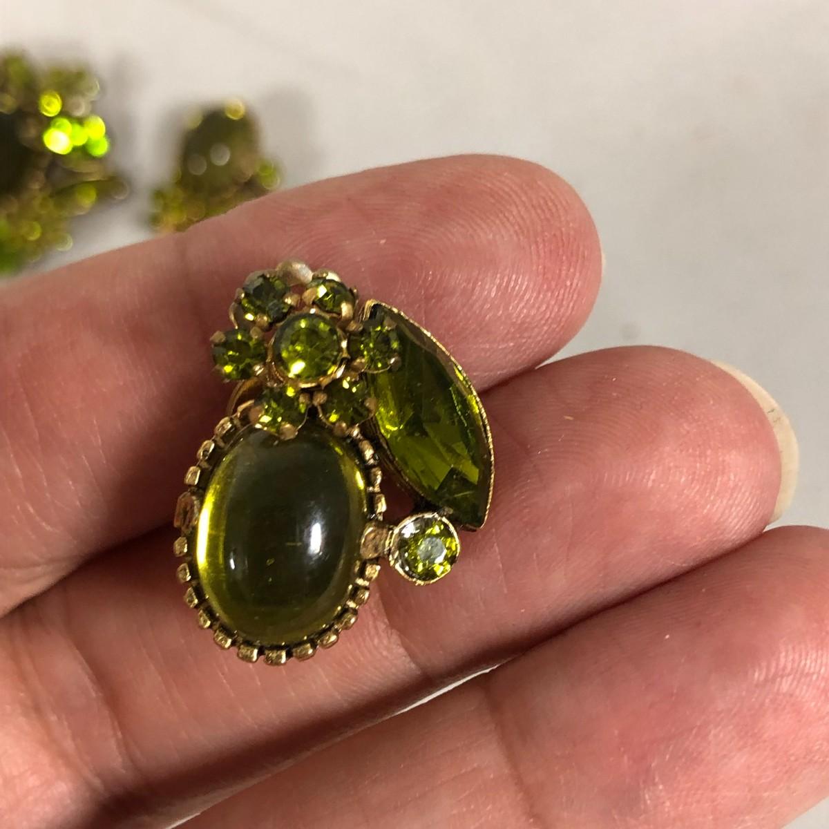 The earrings are clip on, all of the stones seem to be intact. My pictures don't do this set justice with the different shades of green.