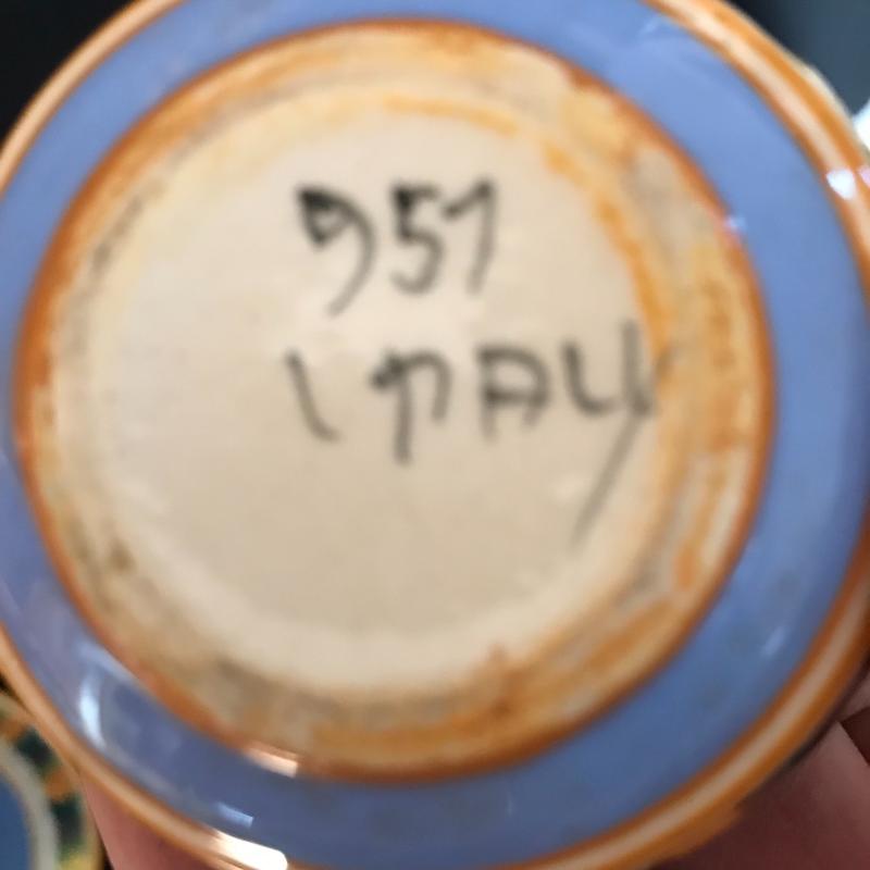 Colorful set with creamer and sugar bowl, tea pot (stands 6” tall), five cups and saucers and one extra cup, 6 jam cups and 6 plates. This is a sweet set in rich blues and yellows. This lot is available for shipping and local pick up in Flat Rock, NC.