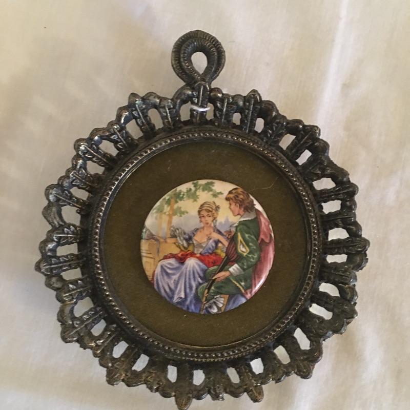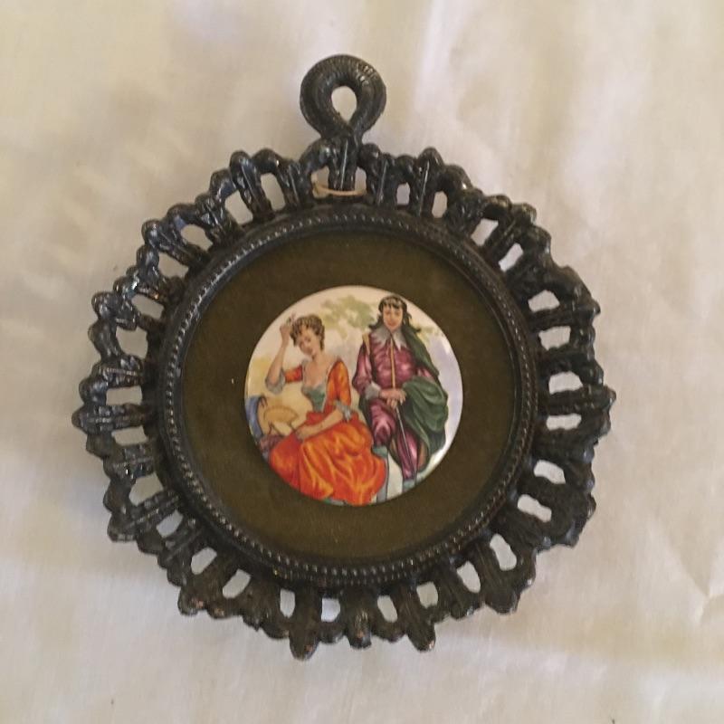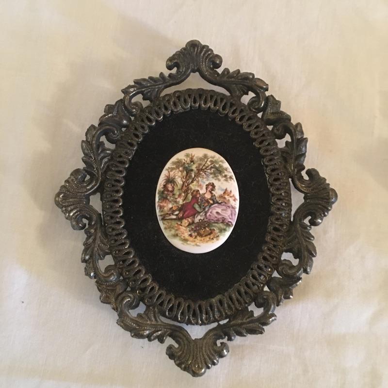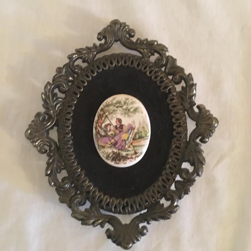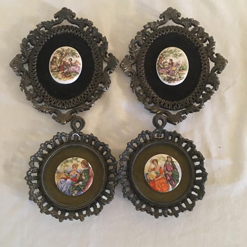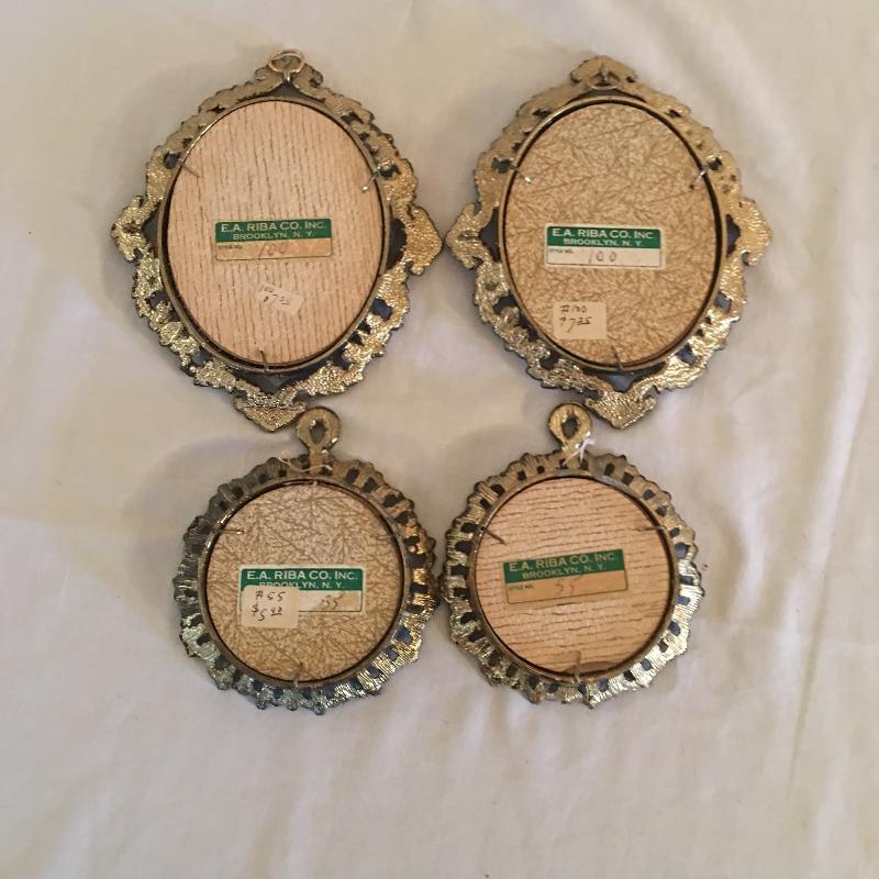 Four cast metal frames with painted oval tiles on felt in the center. These unique Renaissance style pieces are similar to those in Lot 26 and have the same sticker on the back that says ticker on back says E.A. RIBA Co. in Brooklyn NY. Two smaller round pair and a pair of larger ornate ones measuring 5.5” x 7.5”. Shipping available.