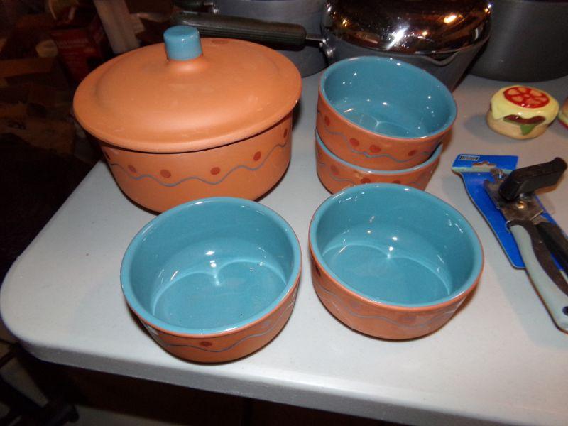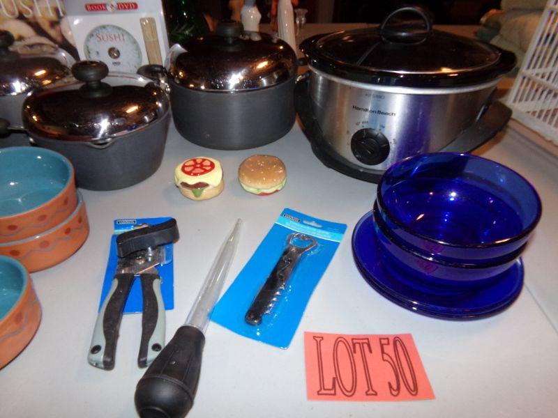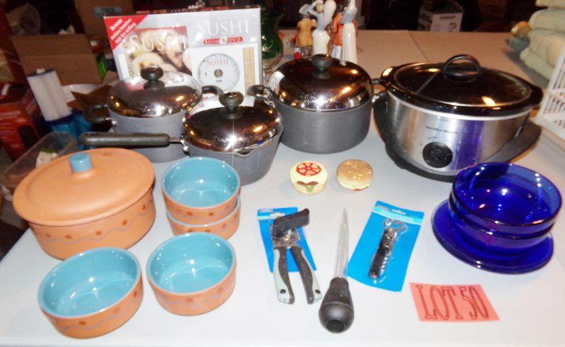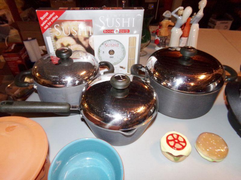 CIRCULON COOKWARE, CROCK POT, COVERED DISH W/4 MATCHING BOWLS, PIER 1 HAMBURGER SALT AND PEPPER SHAKERS, NEW UTENSILS AND FEW BLUE GLASS DISHES AND NEW "SIMPLY SUSHI" BOOK & DVD