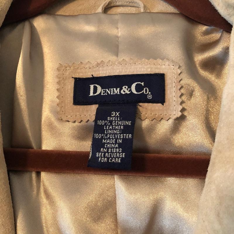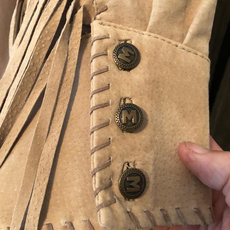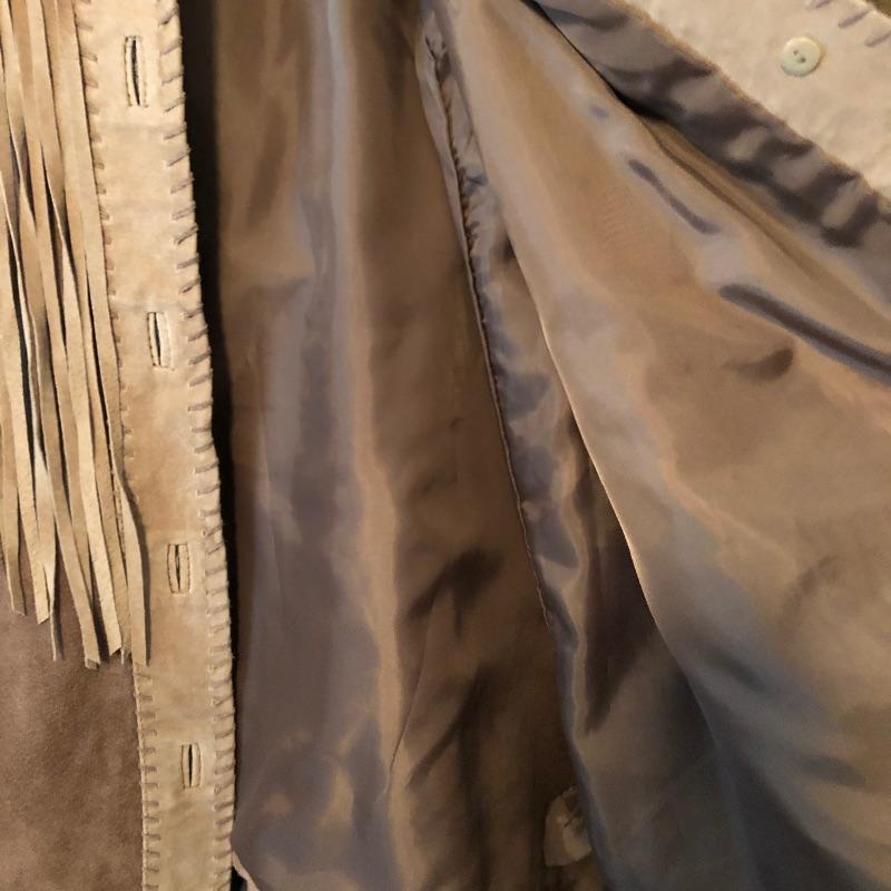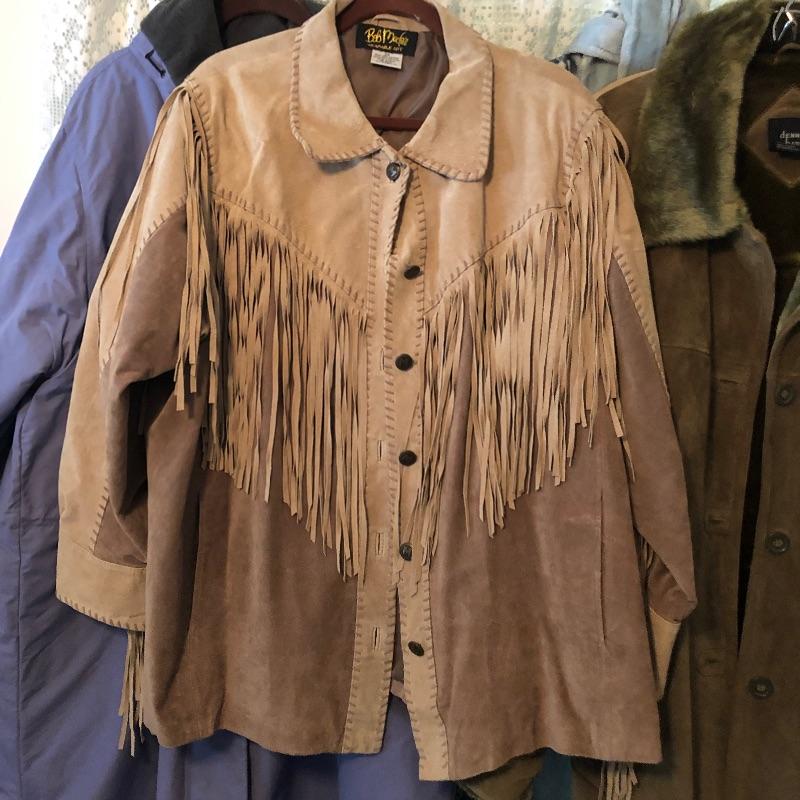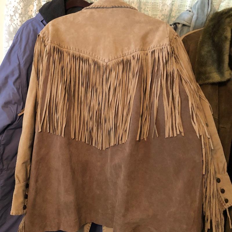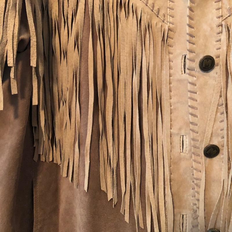 Suede jacket with fringe measures approximately 28” chest, 30” hips and 30” long.
