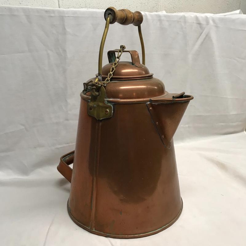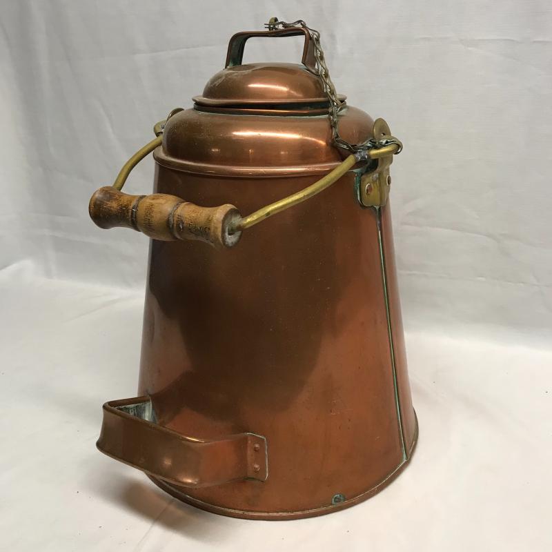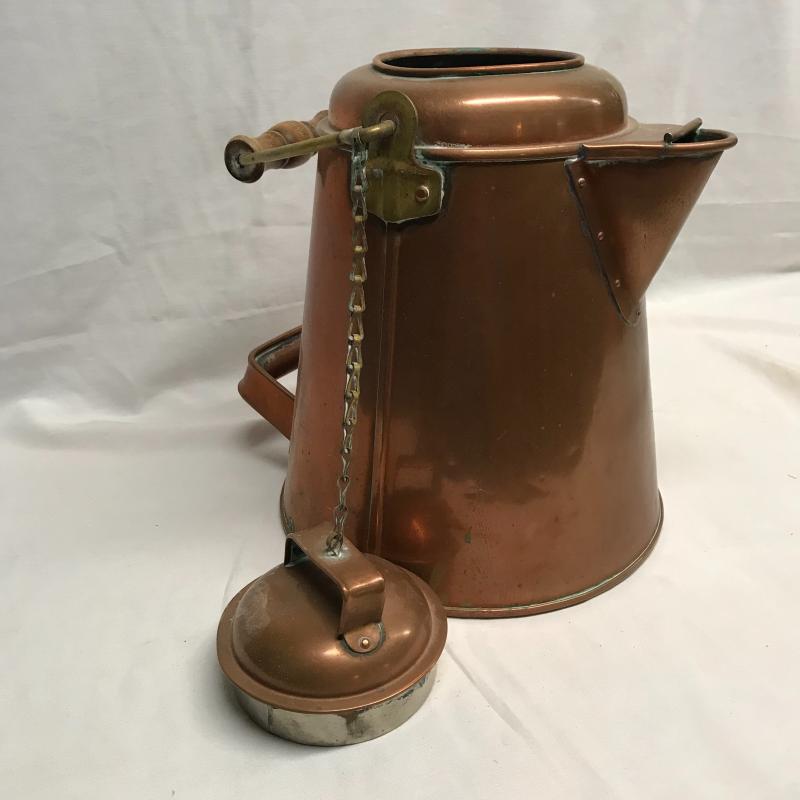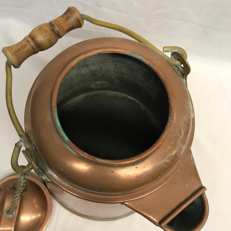 Awesome copper pitcher with brass fixtures and a wooden handle. Piece is in great shape. Base has a 10” diameter without the handle and is approximately 13” tall without wood handle extended. Shipping available.
