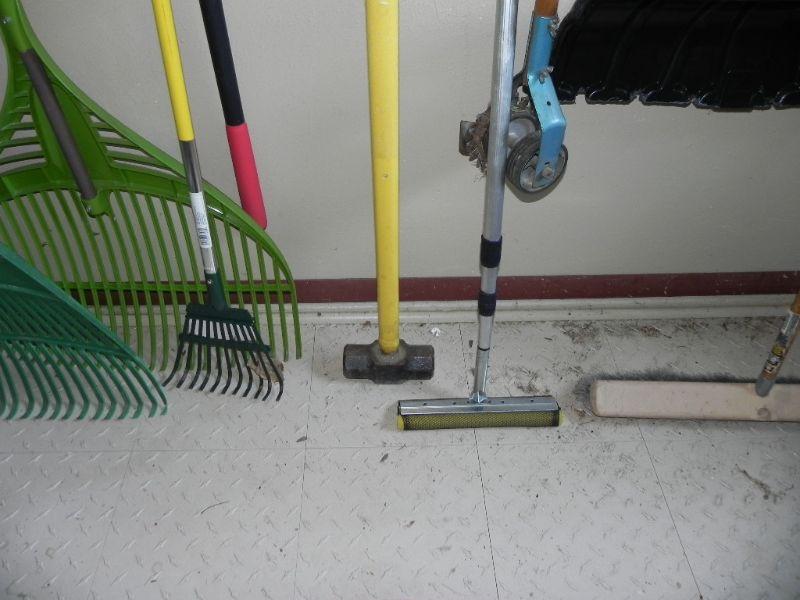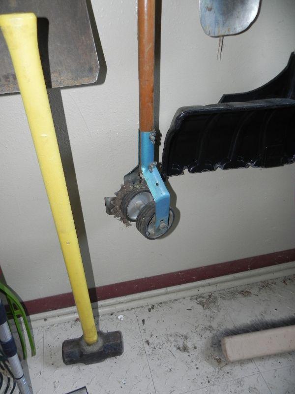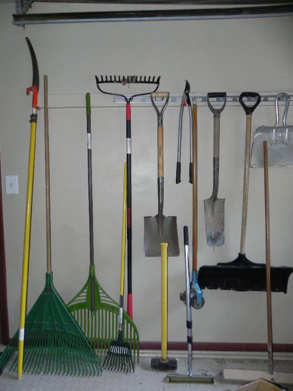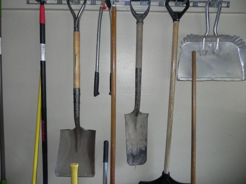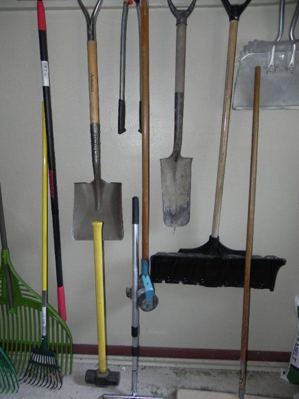 TREE TRIMMER, LEAF RACKS, SLEDGEHAMMER , METAL DUST PAN, SNOW SHOVEL, EDGE TRIMMER, PUSH BROOM, & SHOVELS