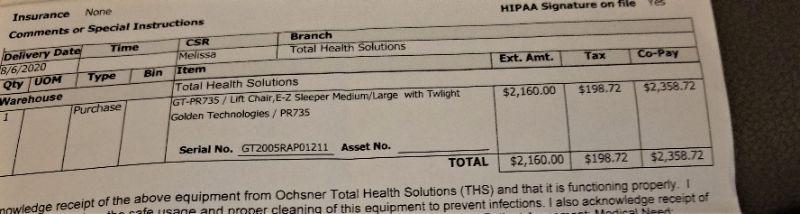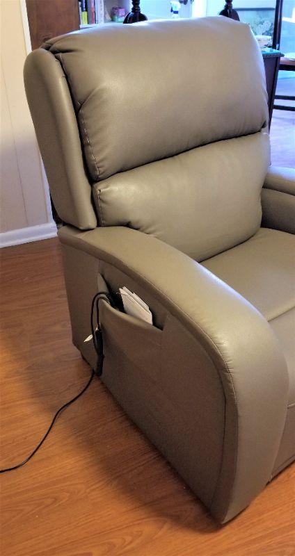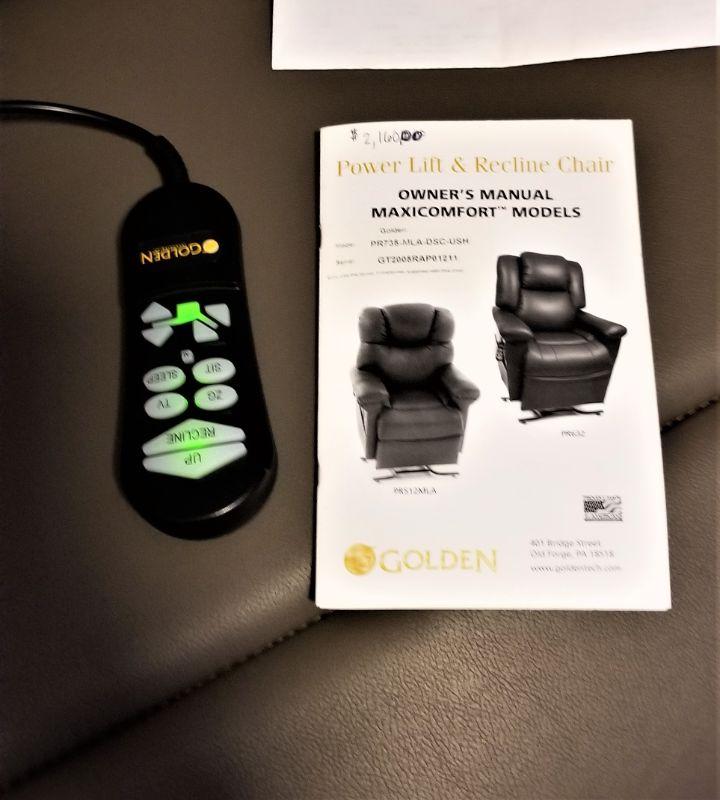 I have to say this is the nicest Lift/Power chair I have ever had in a sale. Purchased literally a month before my client passed away. Golden Power Lift & Recline Chair, Maxi-comfort model. Model #PR735-MLA-DSC-USH. Leather all around. Works great - reclines to the sleeping position - soooo comfy. Clean Clean Clean. Has instruction books and original receipt - total price: $2358.72. We are selling this with no reserve. Nice Soft Gray color. Measures 43" tall, 32" deep, 34" wide. This model is still being sold. If you have been looking for one of these chairs, this is a STEAL. You have to be prepared to move this yourself.
