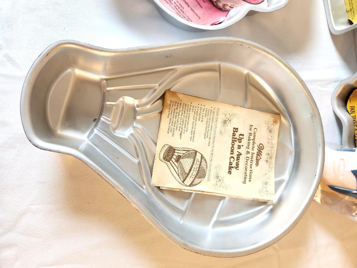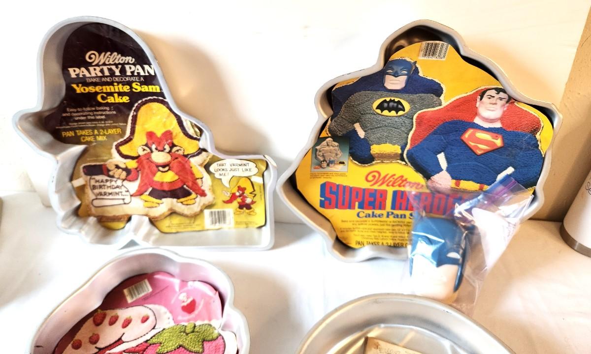 You get all you see here - 4 vintage Wilton Aluminum Character cake pans - Batman/Superman, Strawberry Shortcake, Yosemite Same, Hot Air Balloon - all in good condition.