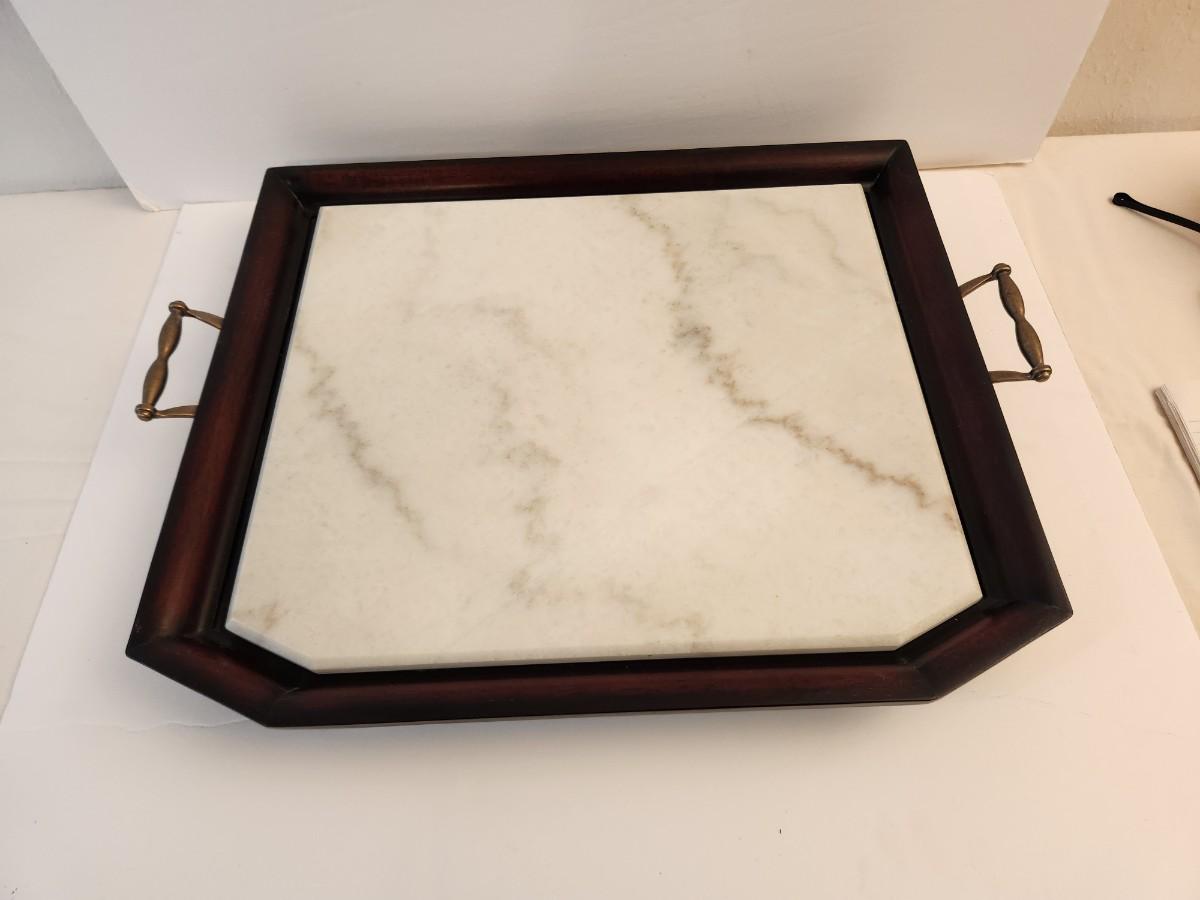 Classic Mahogany finish tray with marble insert, heavy. 22" across handle to handle. Good condition.