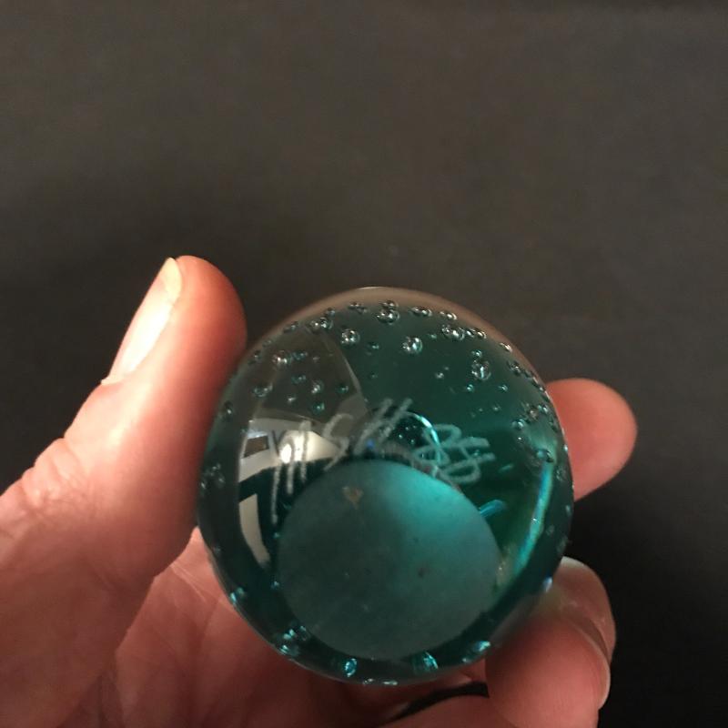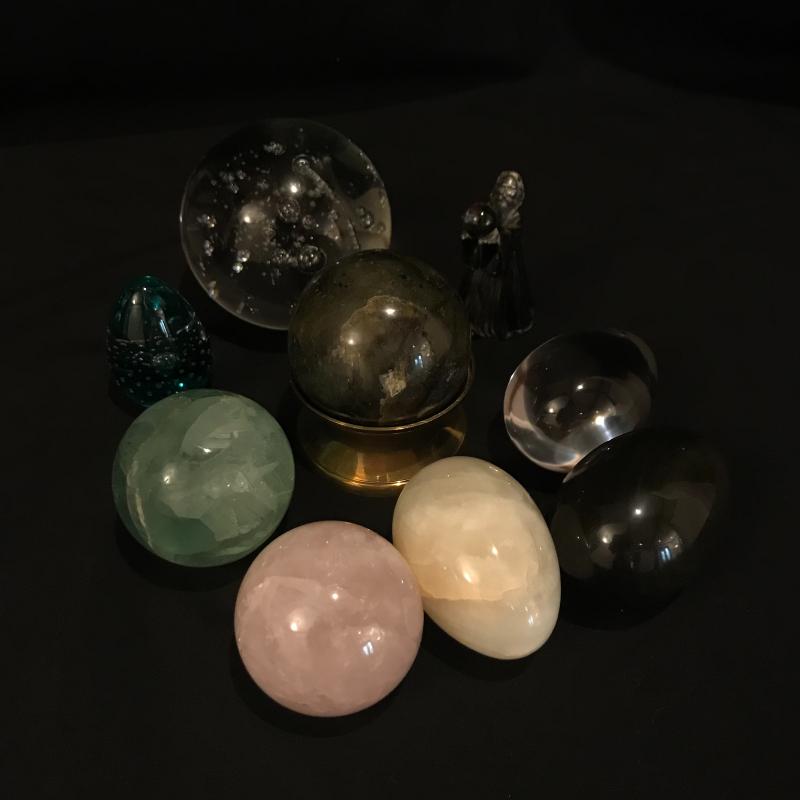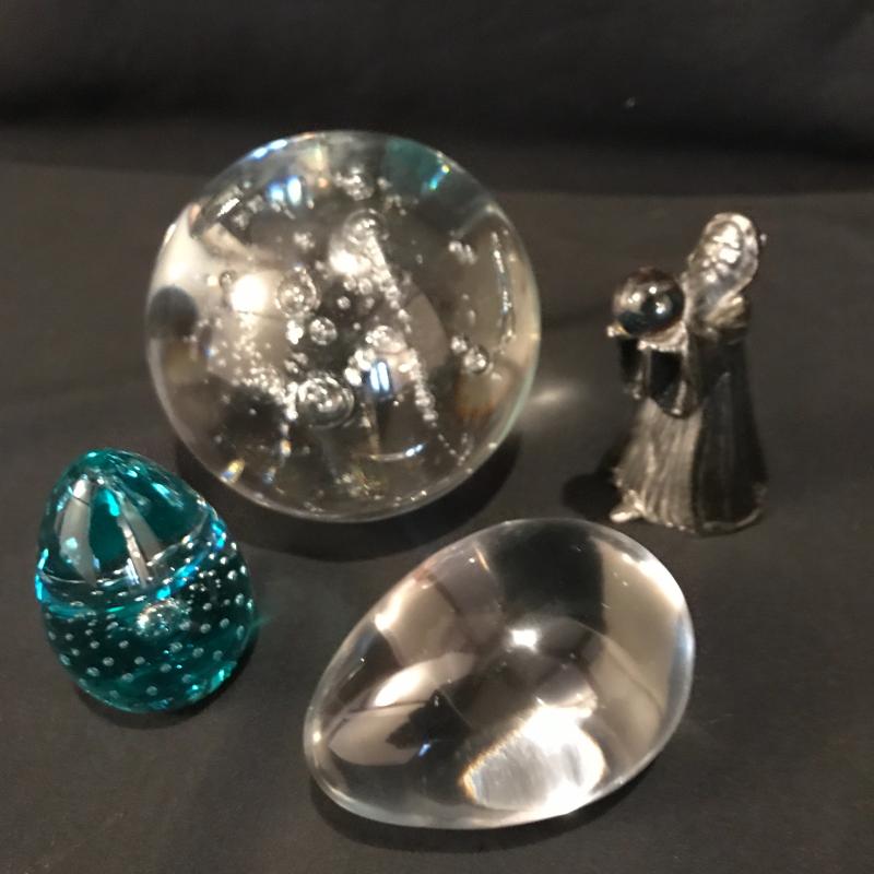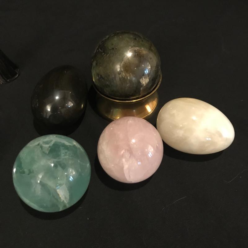 Three marble eggs and two spheres. One in brass stand. Several glass eggs including a signed blue glass egg. See photos. Shipping available or local pick up in Asheville, NC.