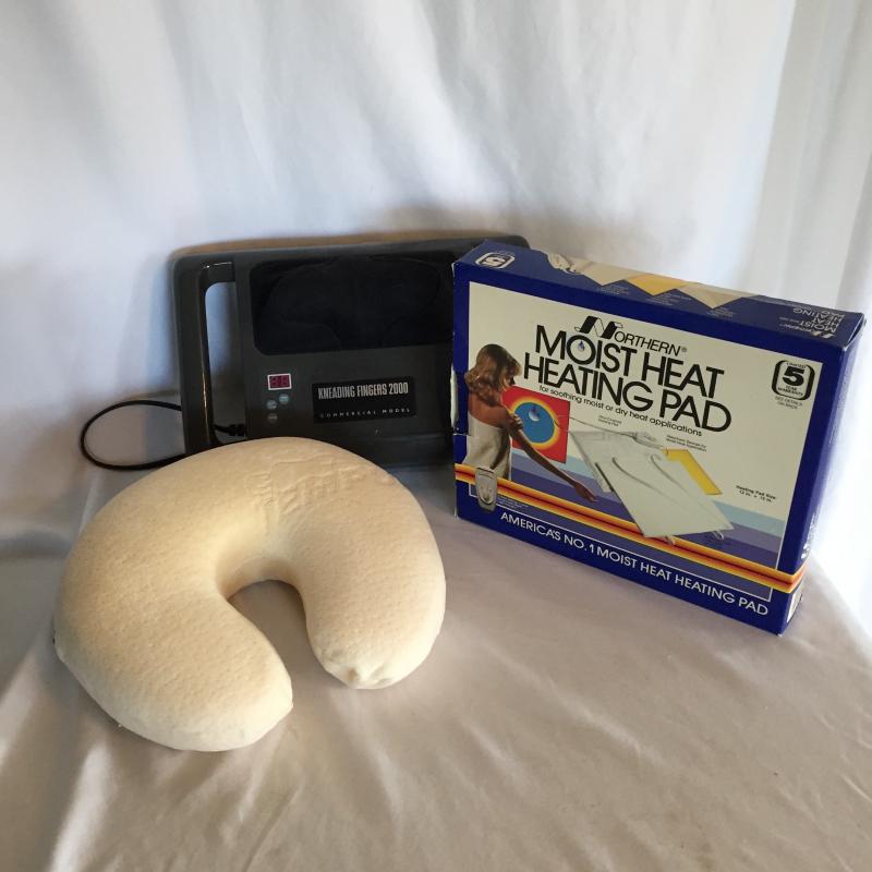 Start relaxing now! Lot includes massager with timer, moist heating pad, and neck pillow. Local pickup only.