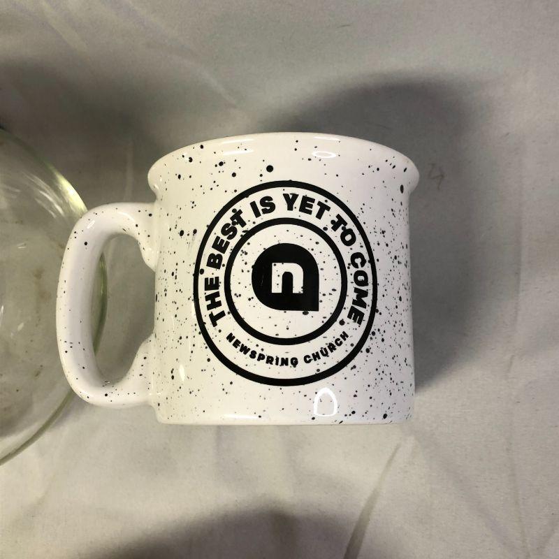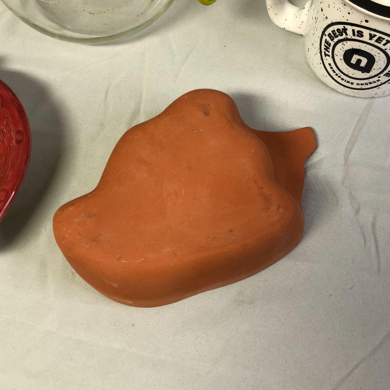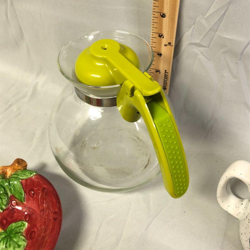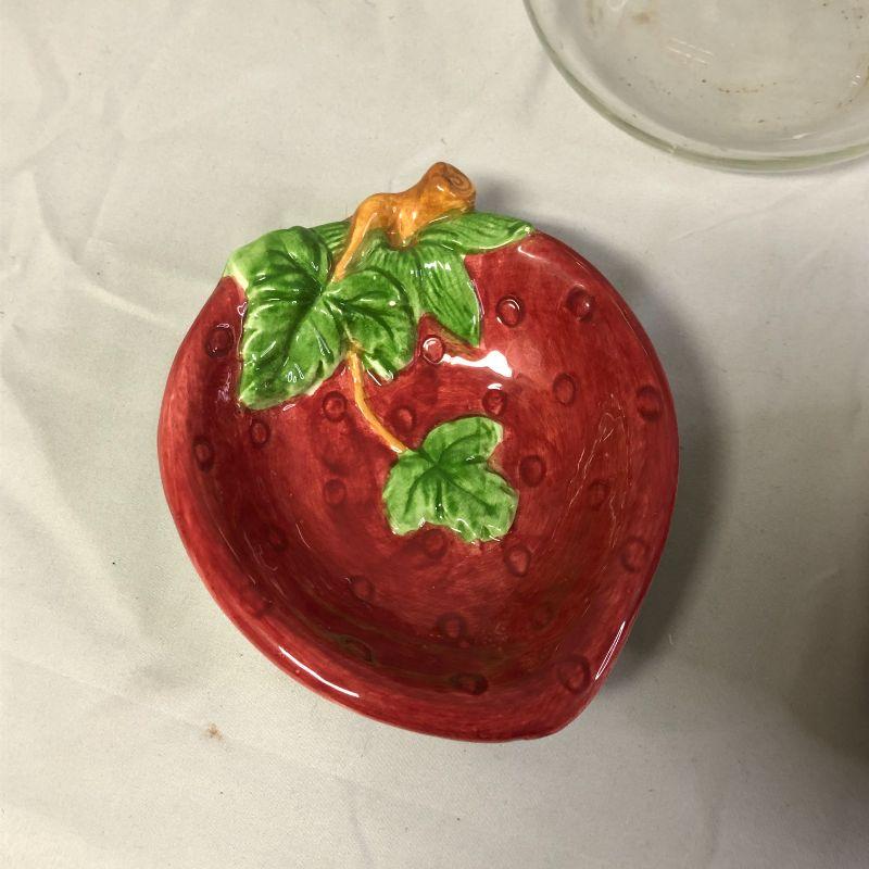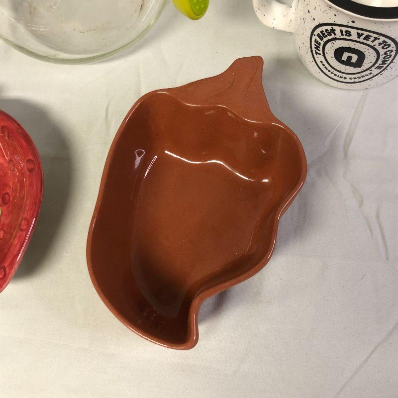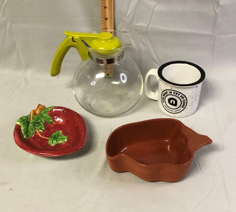 A mug that looks never used and is perfect for a cup of soup or hot cocoa, a glass coffee carafe with lid, a terra cota pepper dish, and a ceramic strawberry dish. All are in excellent condition.