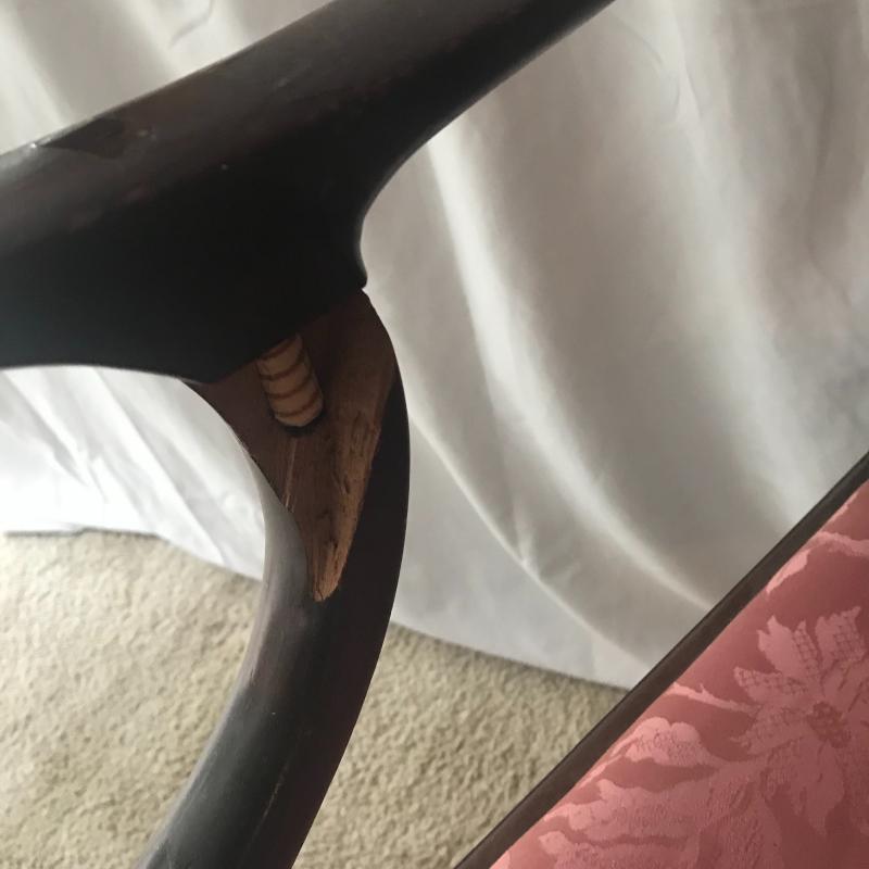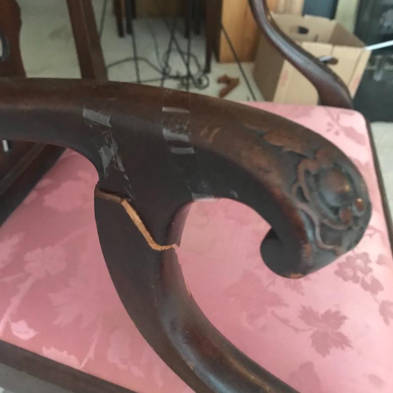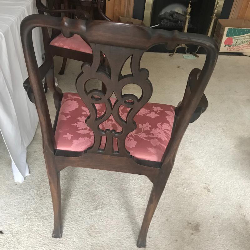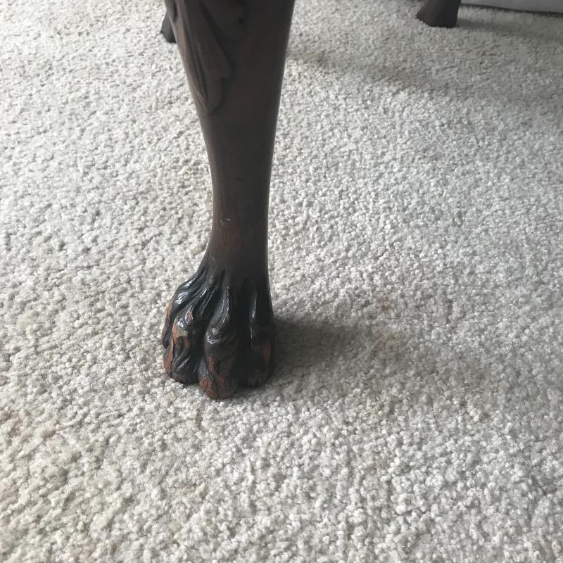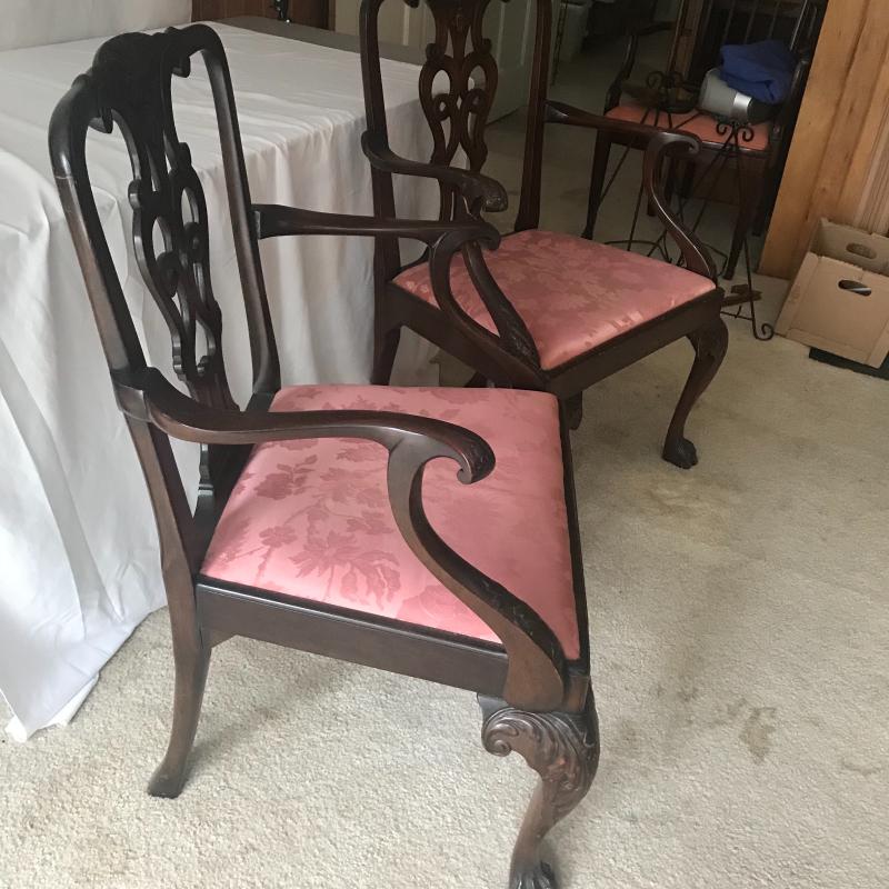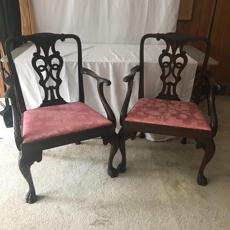 Ornate arm chairs with upholstered seats and Griffin front feet. One chair has damaged right arm (see pics). Both are sturdy otherwise. Each measures 27” x 24” x 38”. Lot available for local pick up only.