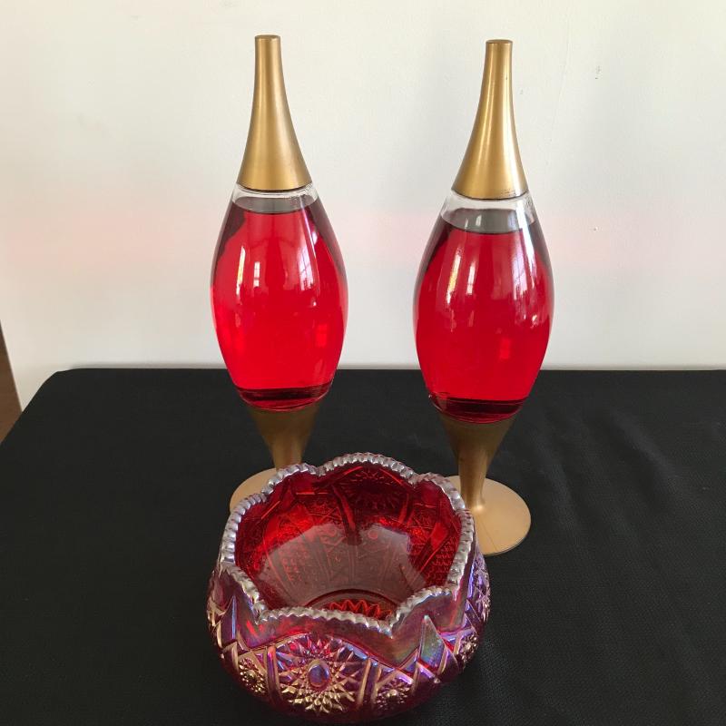 Two lava lamp-style room accents (they don’t plug in) and one metallic glass bowl. No shipping available. Local pickup only in Asheville, NC.