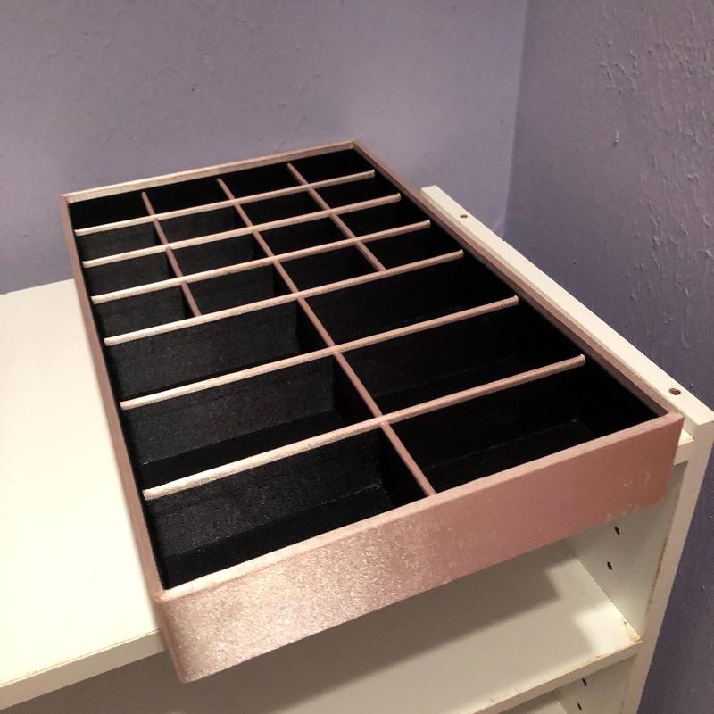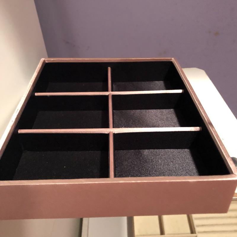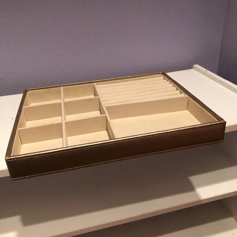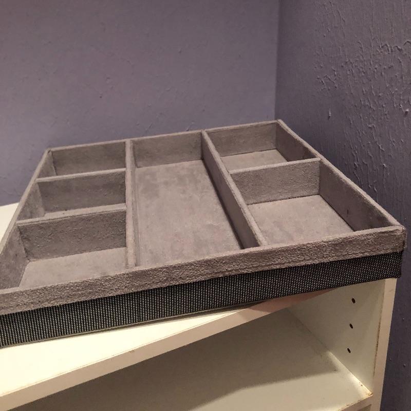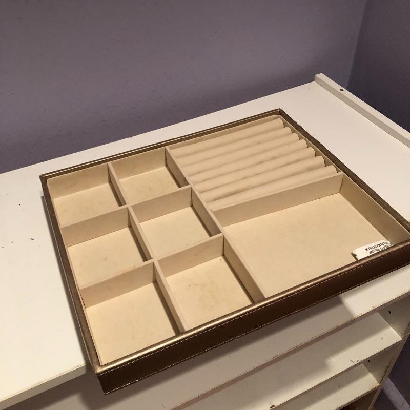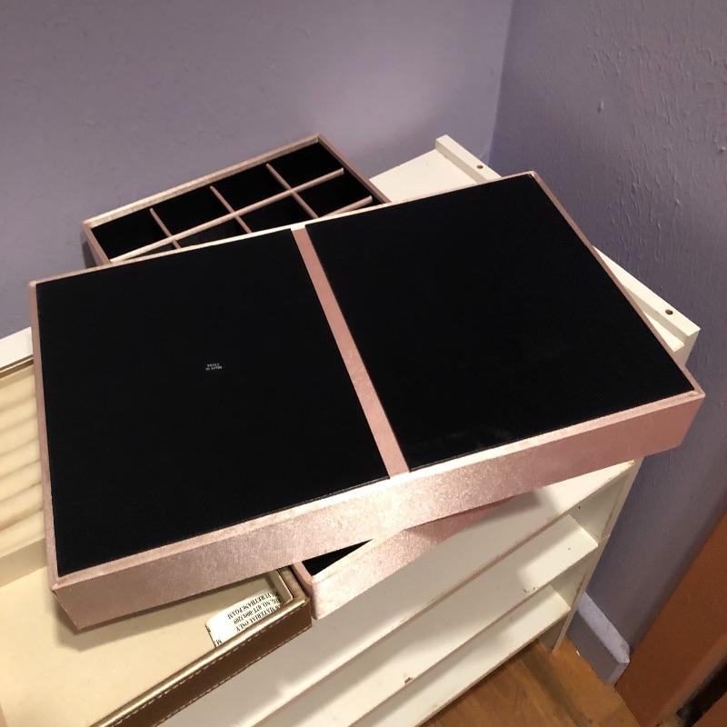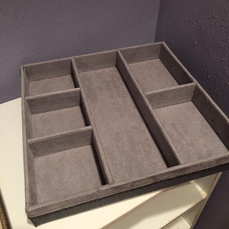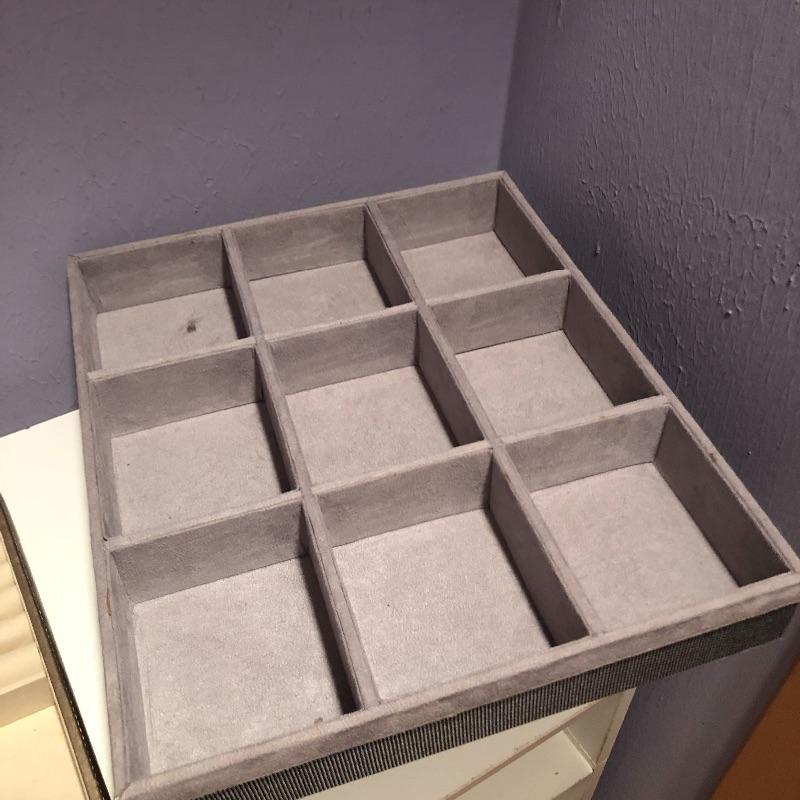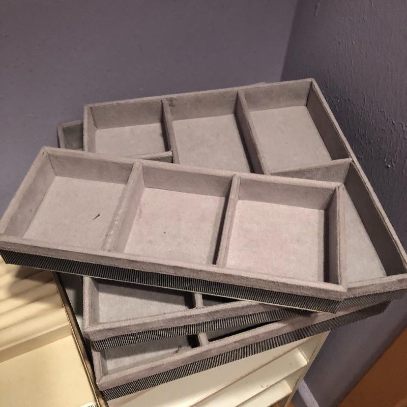 Lots of storage options for you here with this large assortment of jewelry compartmentalized trays. This lot includes three larger gray suede lined trays and five smaller gray suede lined trays. It also includes sixteen satin lined trays of different sizes. Grey nine compartment tray measures 12” x14” x2” and most all are around 2” deep. Note these are trays for jewelry not boxes-they do not come with lids. Local pick up only.