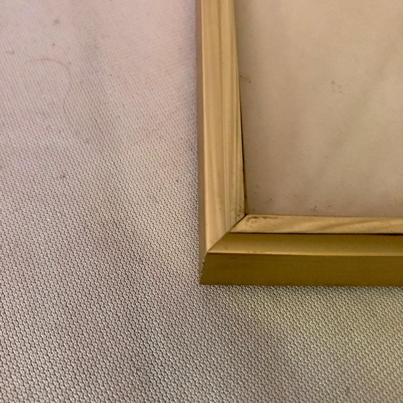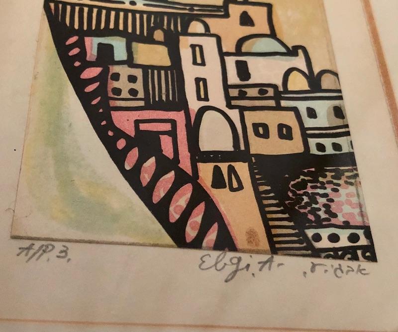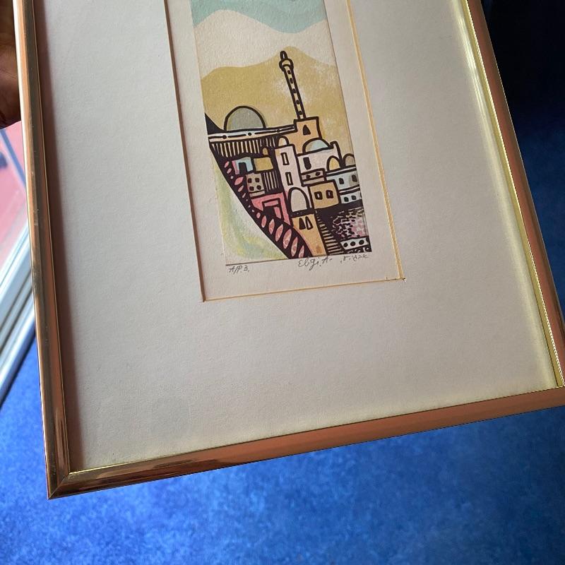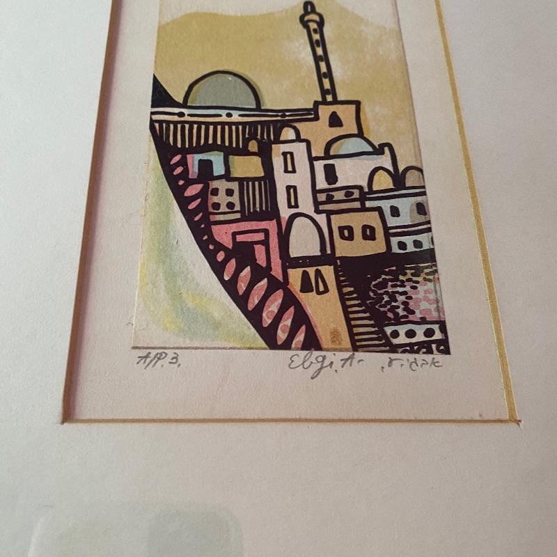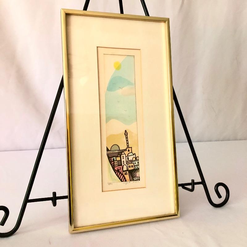 This small painting is adorable with its simplistic image of a scene in Jerusalem. It is signed by Israeli Artist, Amram Ebgi. It is matted and mounted in a gold frame that enhances its rectangular portrait shape. It measures 9” x 16”.