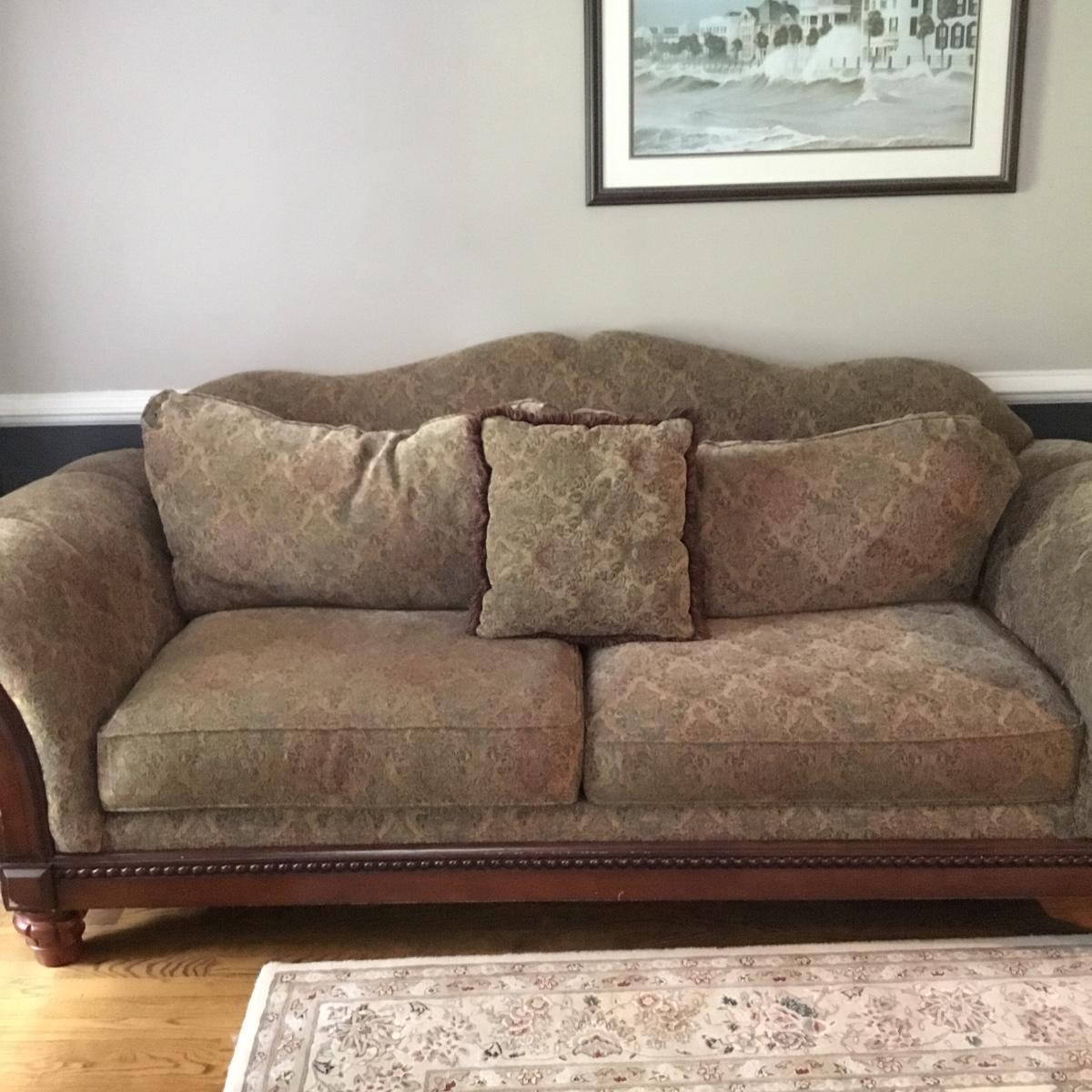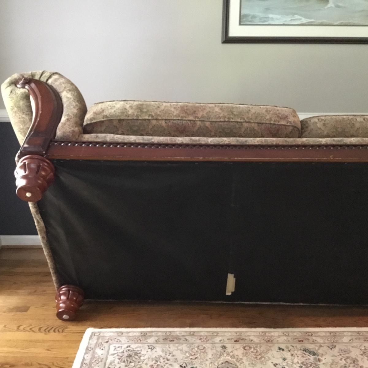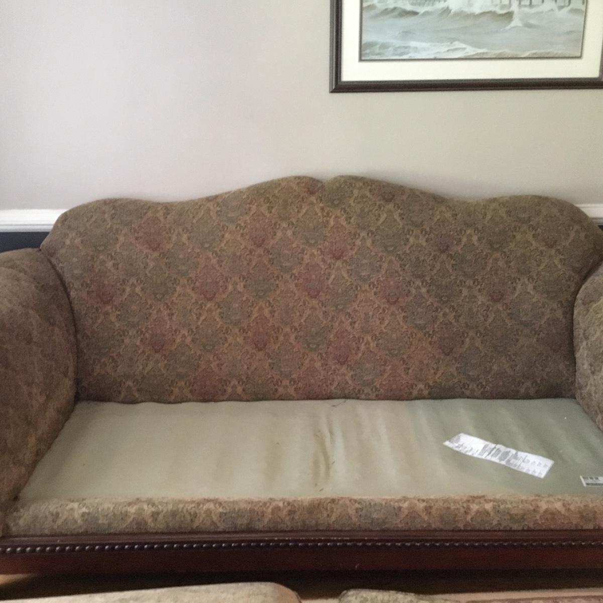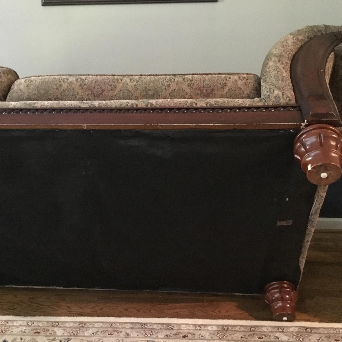 Nice wood framed sofa with dark tan fabric. Fabric matches lot 50 chair and loveseat. In great condition and would make a very elegant addition to your home. Buy one or all three in the set. Small throw pillow with same fabric is included. Local pick up only. Please bring help. Its located on main floor but you'll need to go out a doorway with it. 98" long x 40" deep and 40" tall and 19" seat height.
