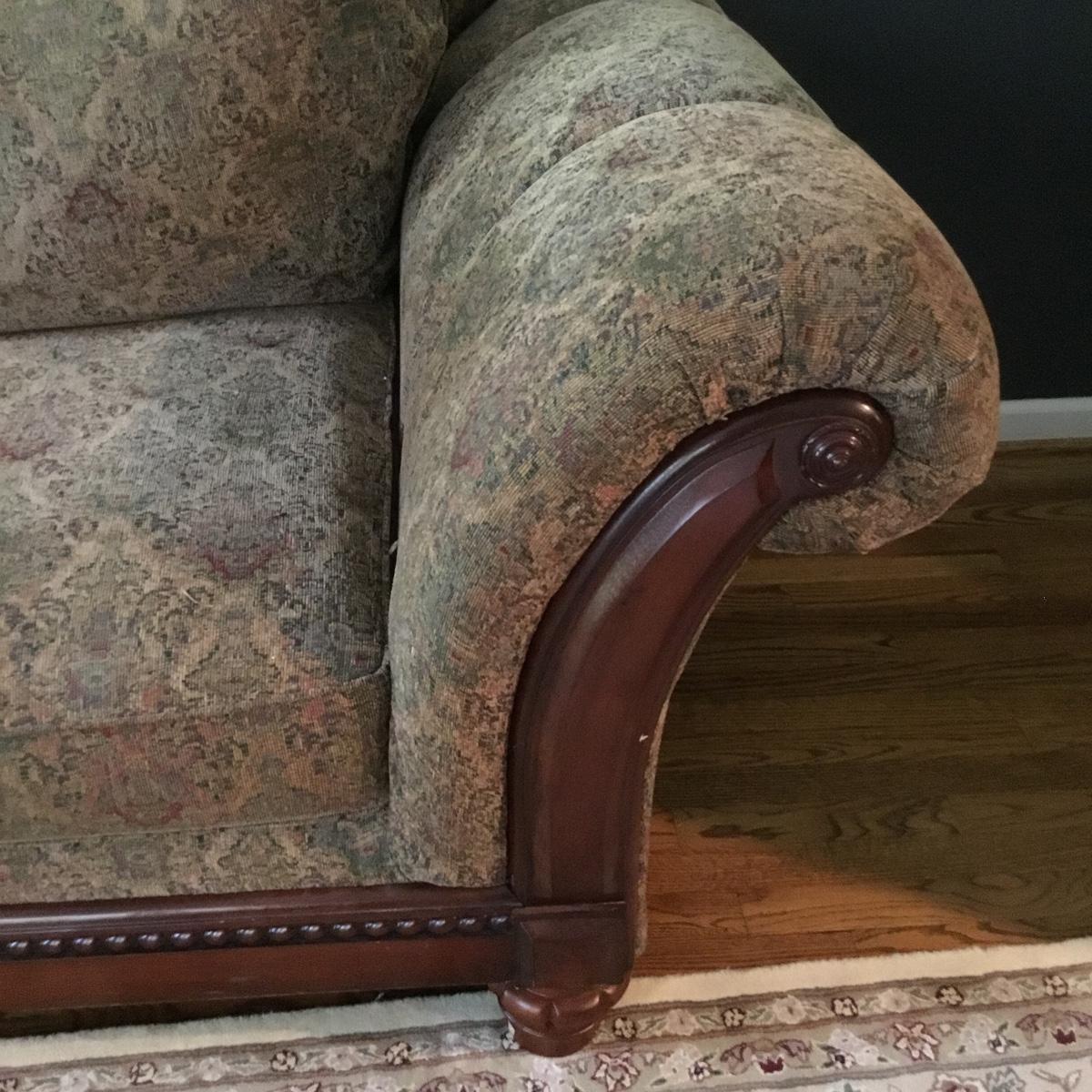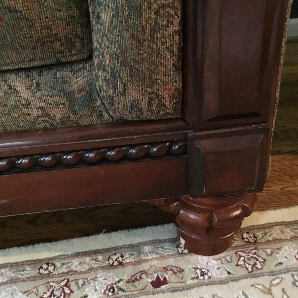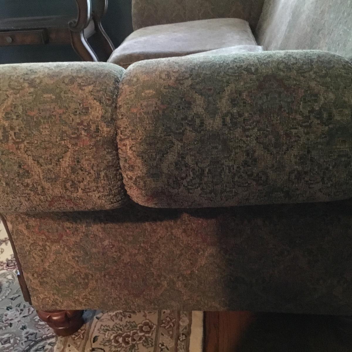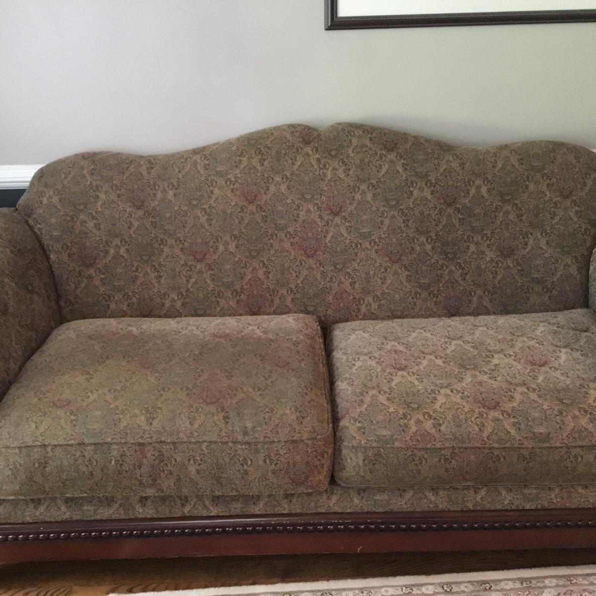 Nice wood framed sofa with dark tan fabric. Fabric matches lot 50 chair and loveseat. In great condition and would make a very elegant addition to your home. Buy one or all three in the set. Small throw pillow with same fabric is included. Local pick up only. Please bring help. Its located on main floor but you'll need to go out a doorway with it. 98" long x 40" deep and 40" tall and 19" seat height.