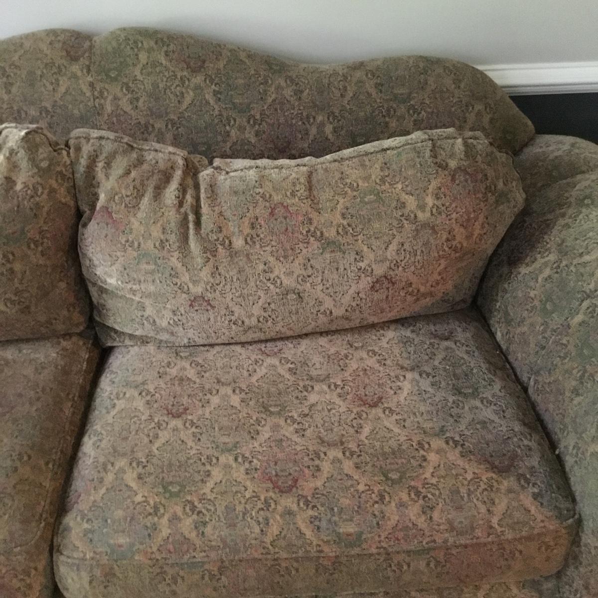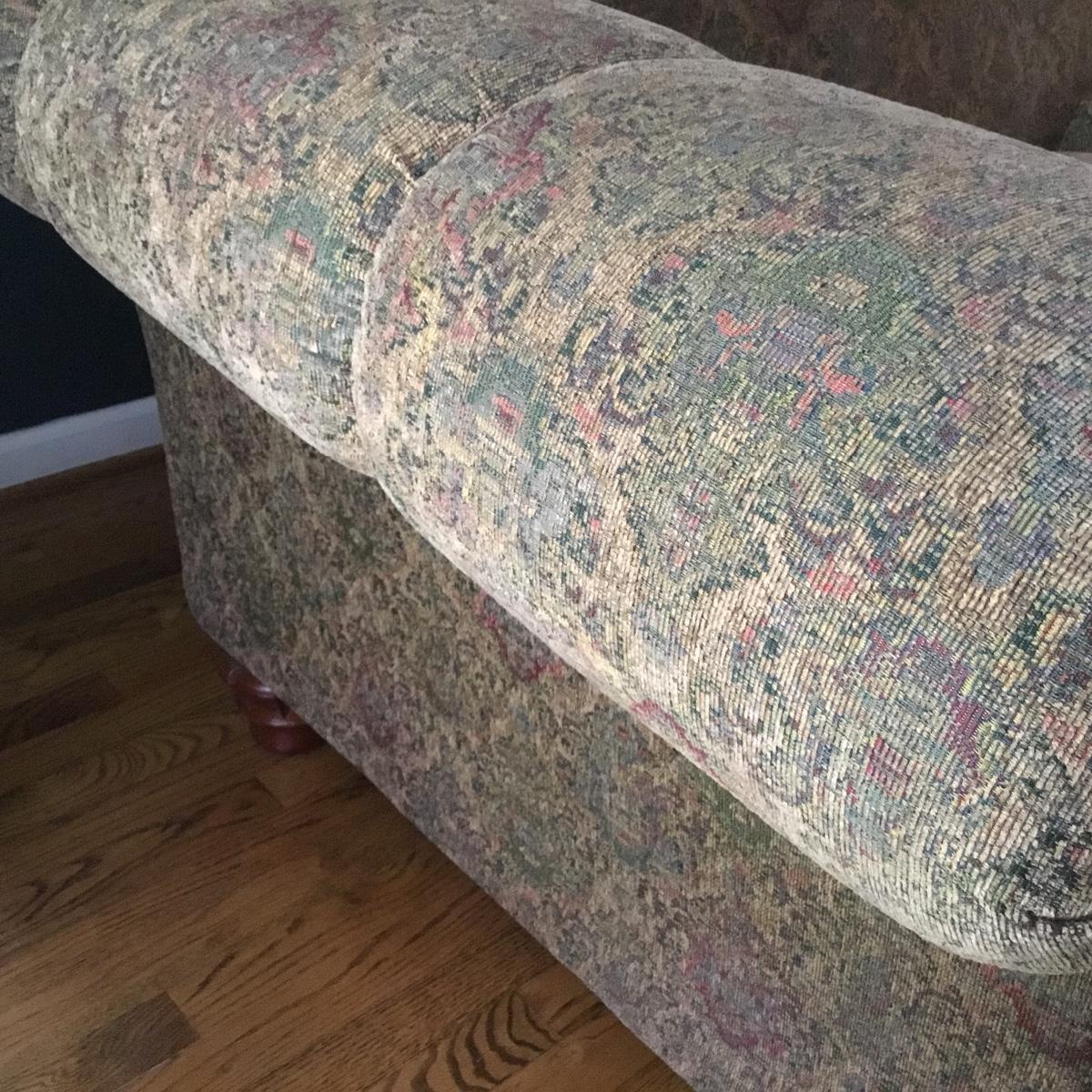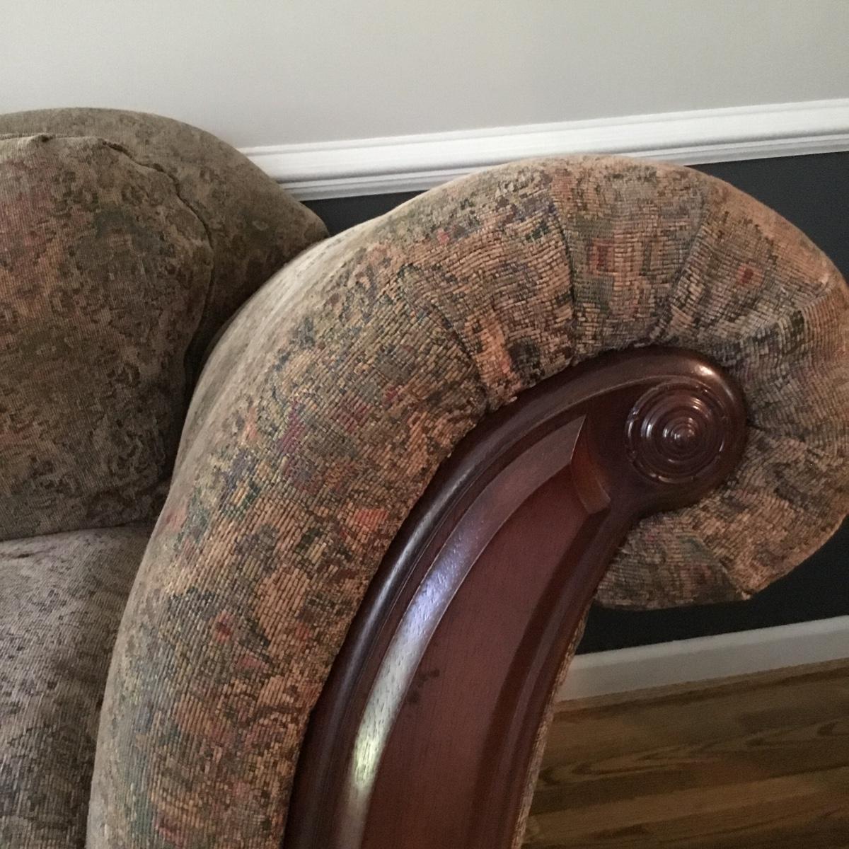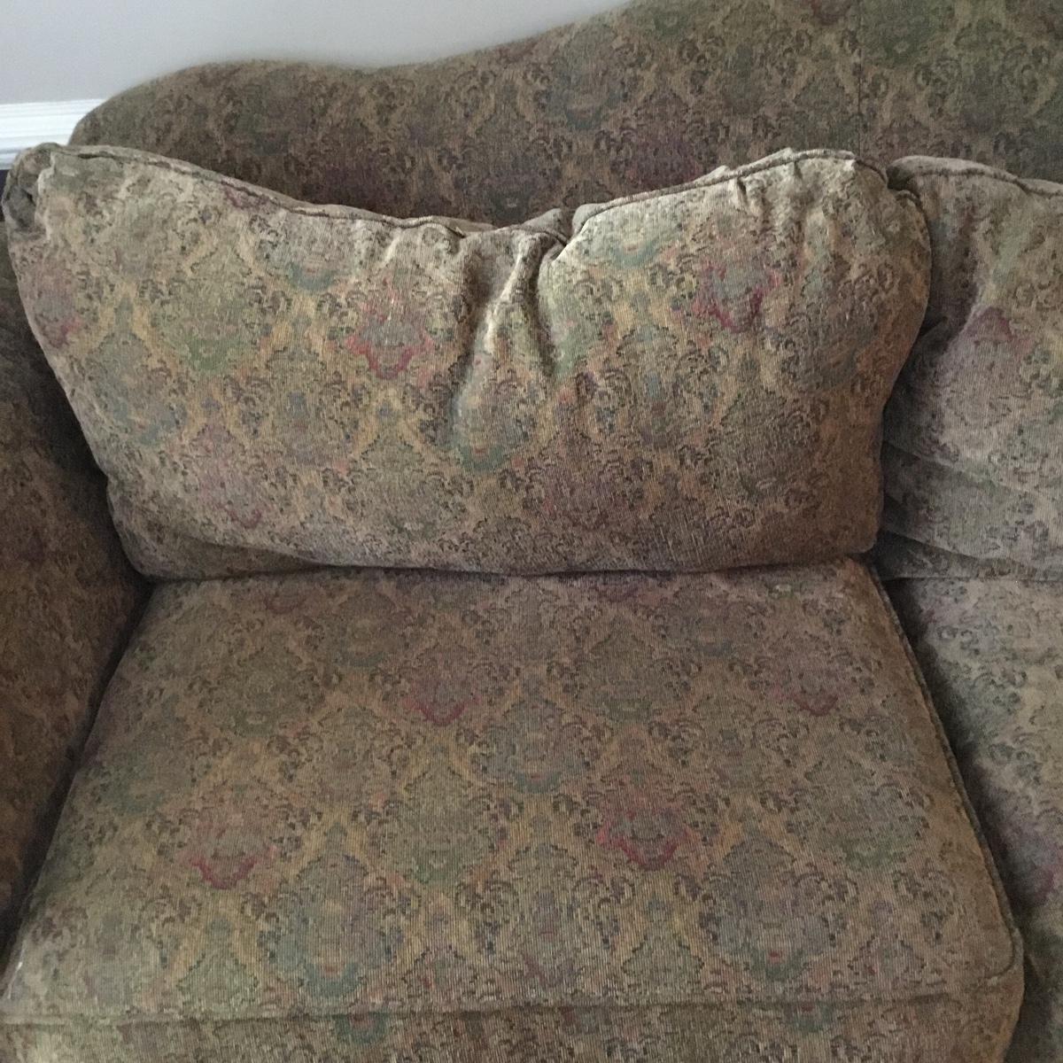 Nice wood framed sofa with dark tan fabric. Fabric matches lot 50 chair and loveseat. In great condition and would make a very elegant addition to your home. Buy one or all three in the set. Small throw pillow with same fabric is included. Local pick up only. Please bring help. Its located on main floor but you'll need to go out a doorway with it. 98" long x 40" deep and 40" tall and 19" seat height.