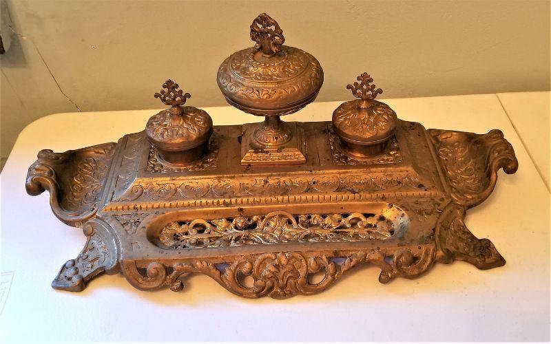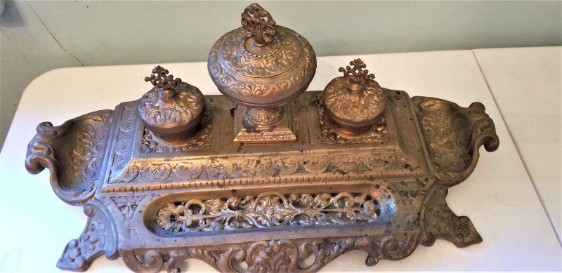 This is a modern replica of 19th century desk tray - solid brass - 3 lidded compartments - heavy - pen tray. Used condition. 19.5" across, 8" deep.