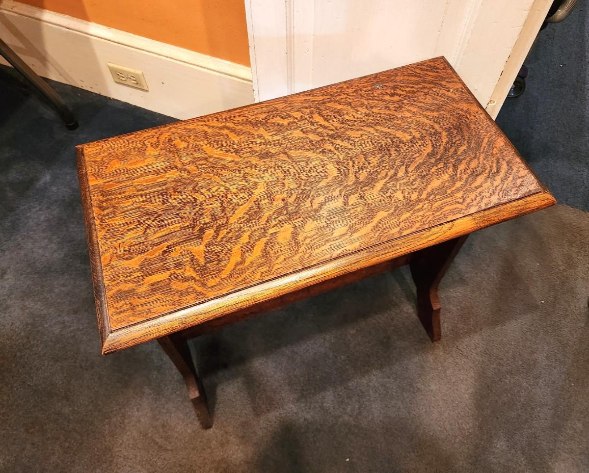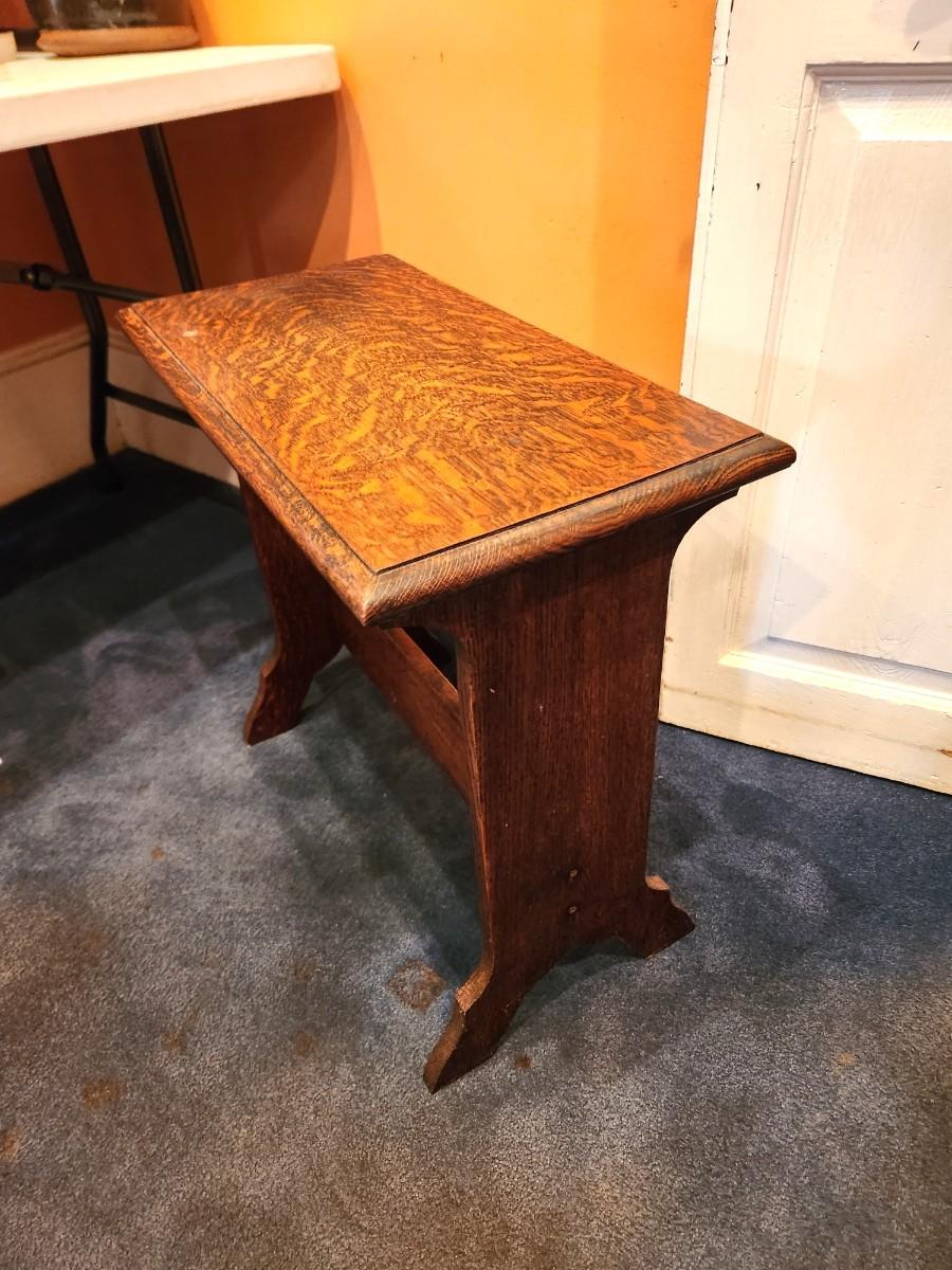 Nice vintage Solid Oak side table - stretcher across bottom. Good condition. 23" long, 11.5" deep, 22" tall. Good vintage condition.