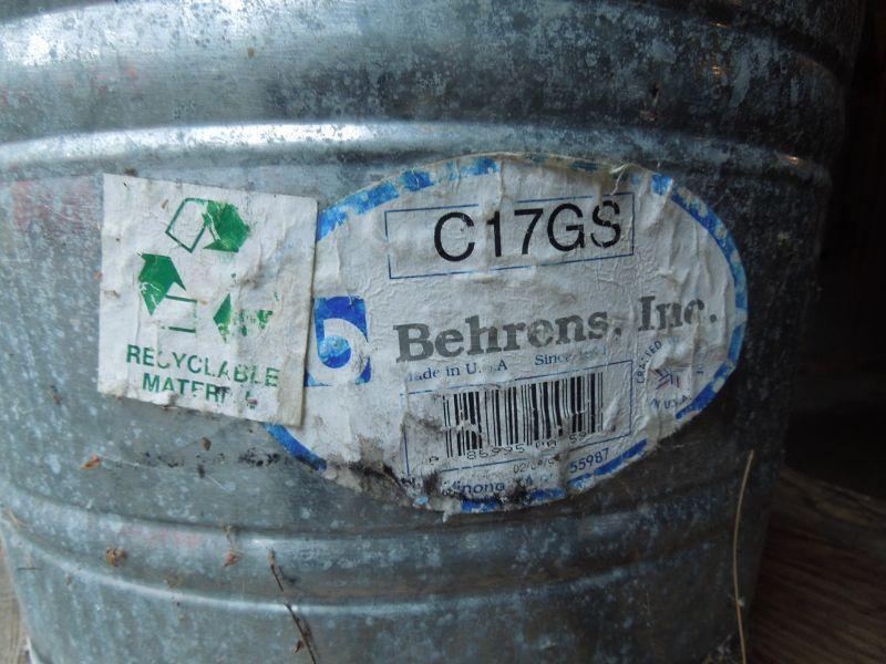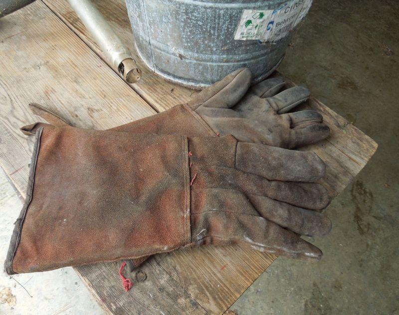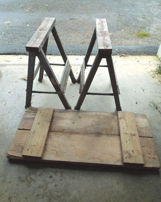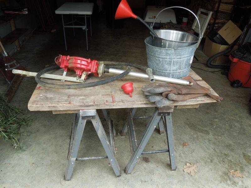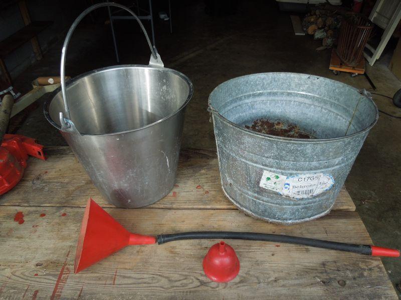 Lot also included two saw horses with wood plank table top, a metal bucket; a galvanized bucket; a funnel on a tube, a small red funnel and a pair of leather heavy duty work gloves (no size).