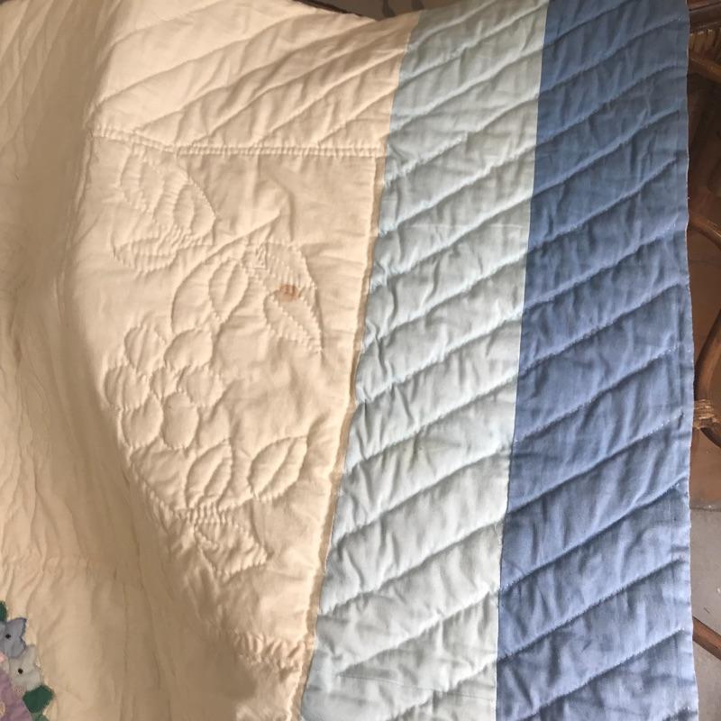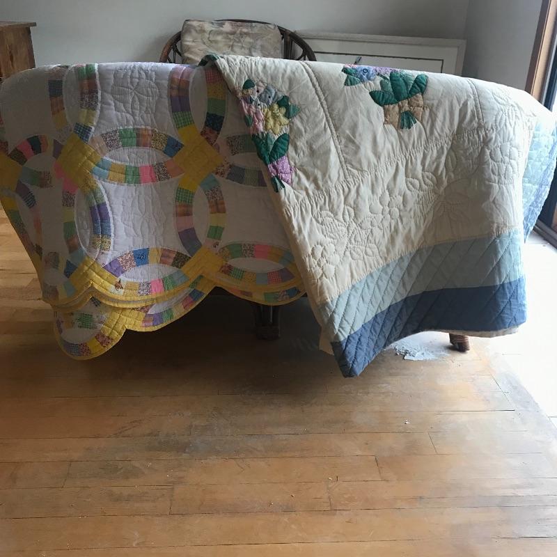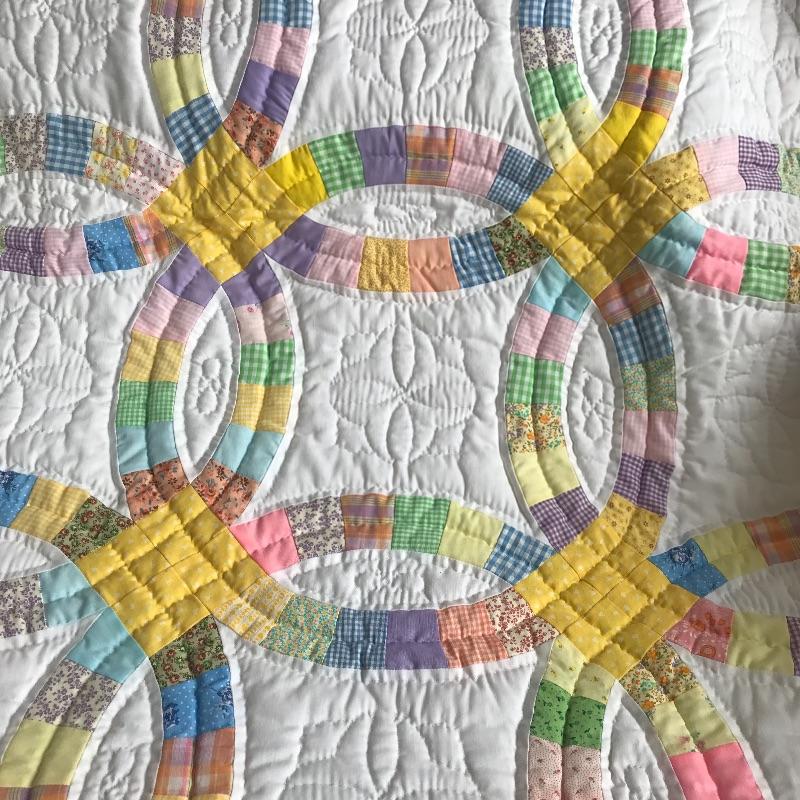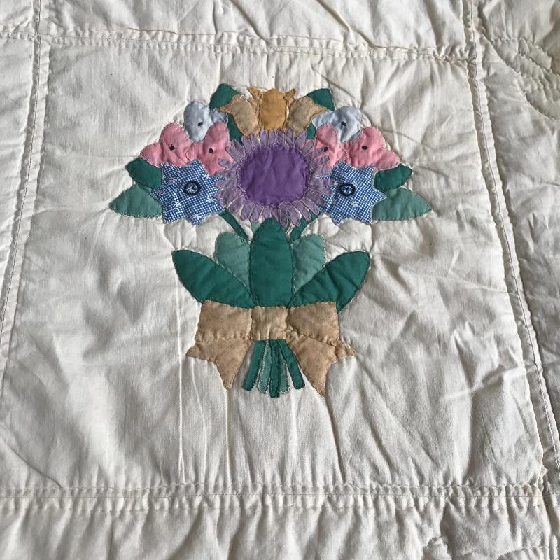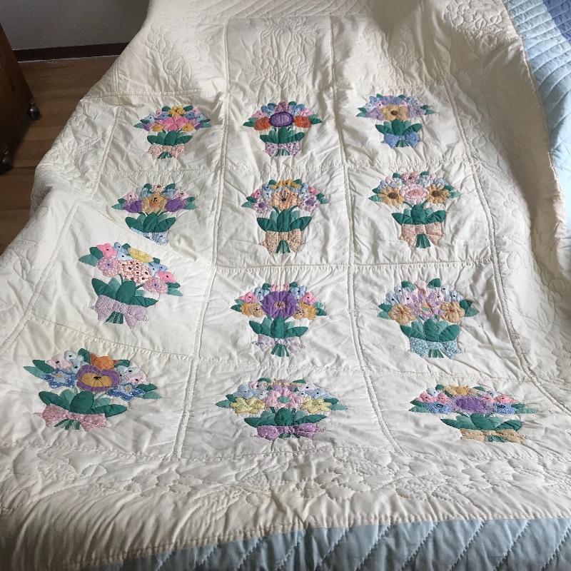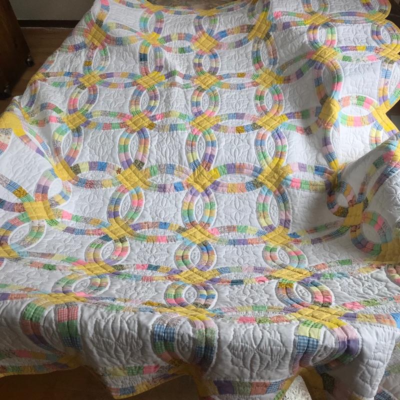Bouquet Floral Design in good condition with a bit of fading. Aprox. 96" X 78". Wedding Band design pattern has vibrant yellows and pastels and appears to be in excellent condition. Machine bound and hand embriodered. Aprox. 96" X 84". Shipping available.