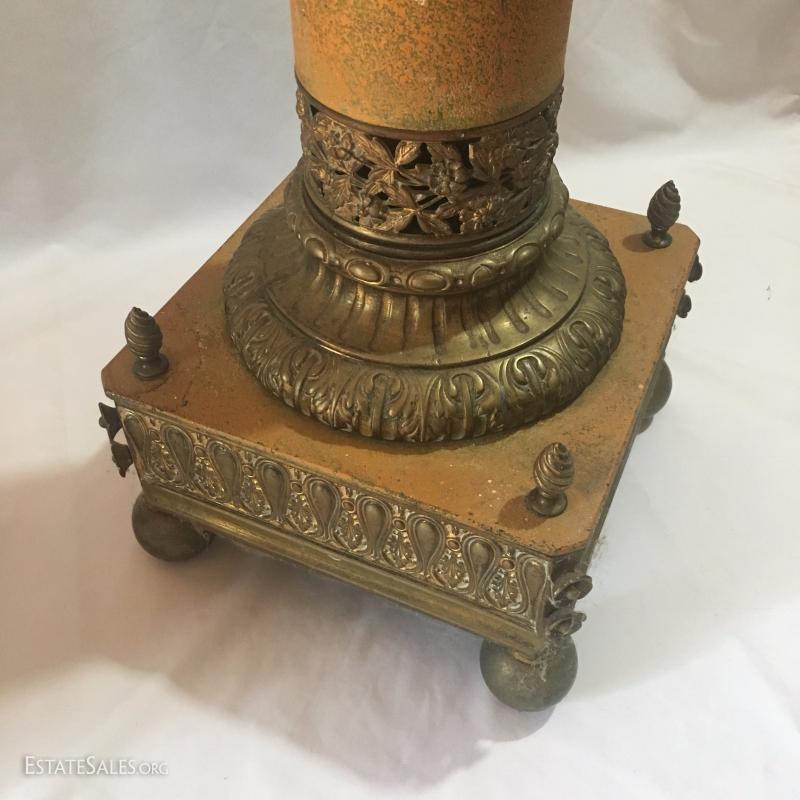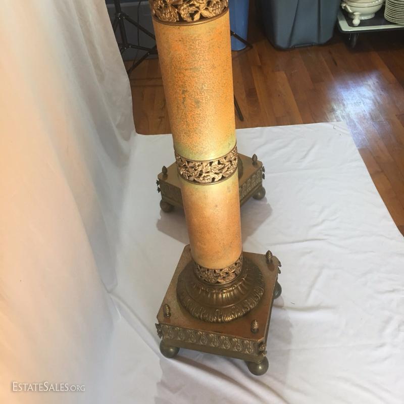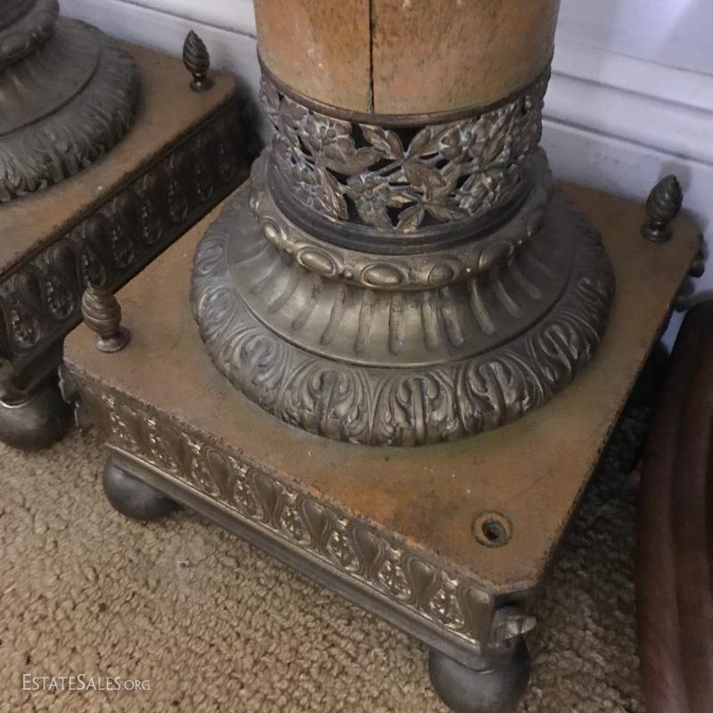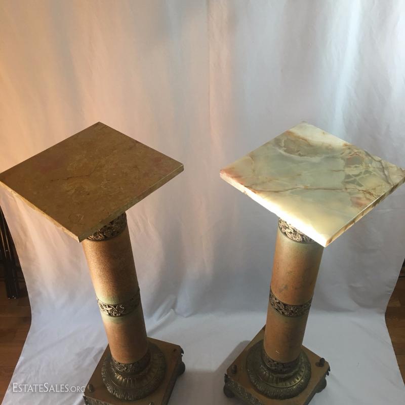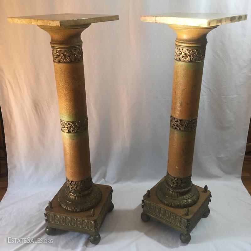Two Marble Top Victorian Era Pedestals. Gilt coloring. Can be used as plant stand or to feature beloved art. One missing small brass decorative knob on bottom. See photo. Different color tops but otherwise the same. 12"l x 12"w x 41"tall