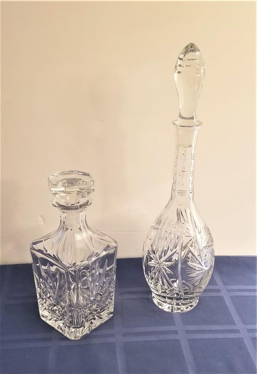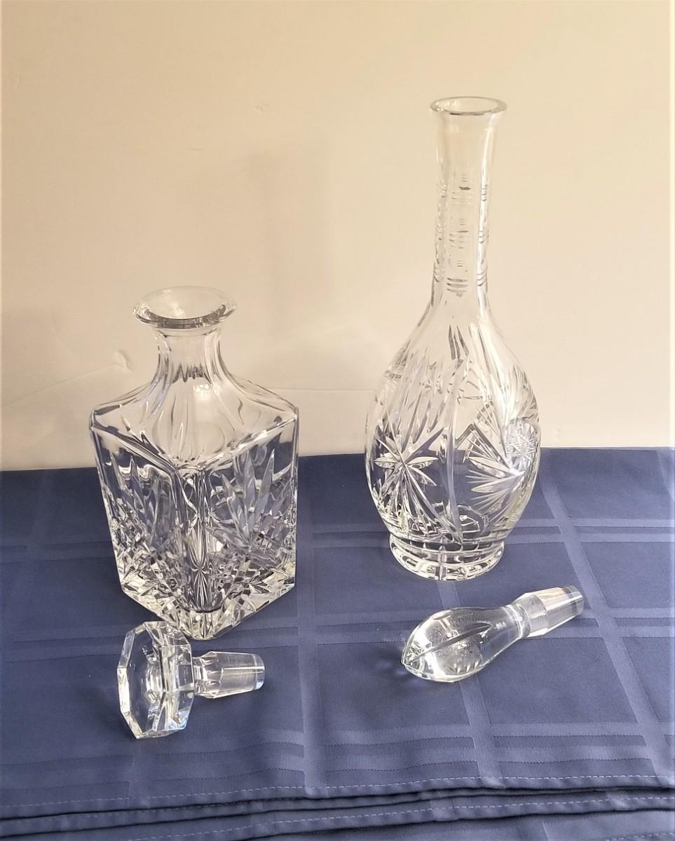 Two attractive crystal decanters, both with glass stoppers. Tallest is 16" tall, smaller one is 10" tall. Both in good condition.