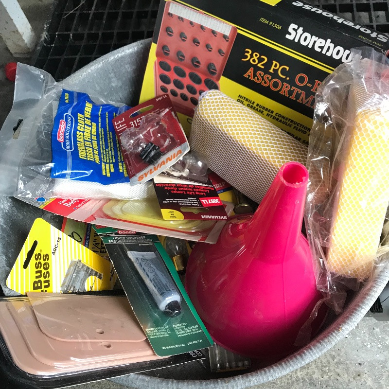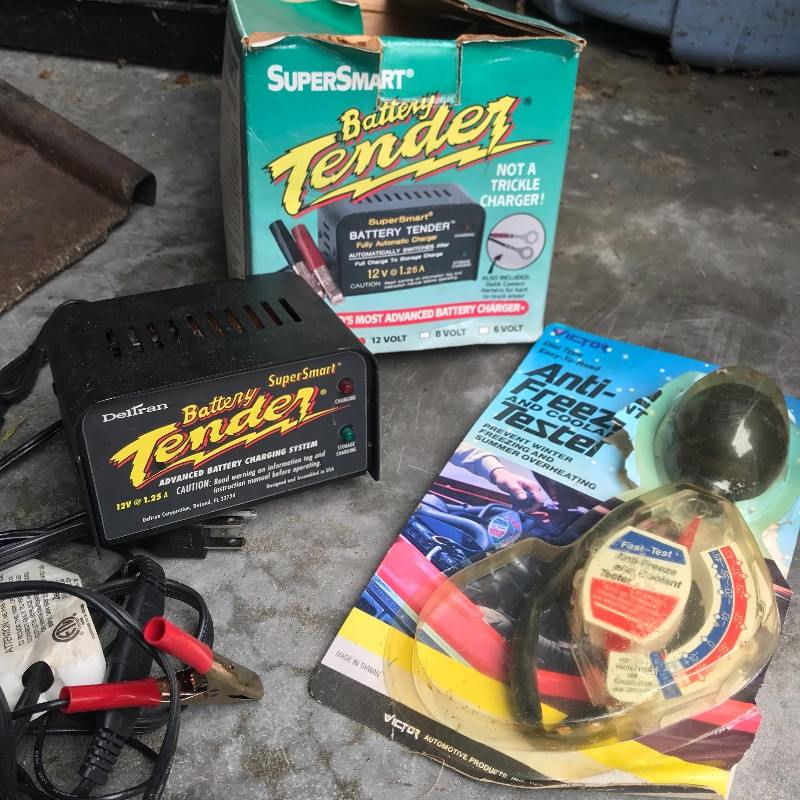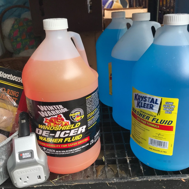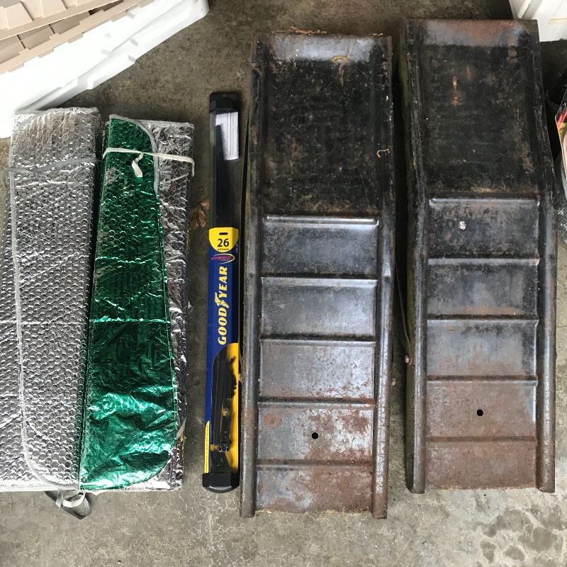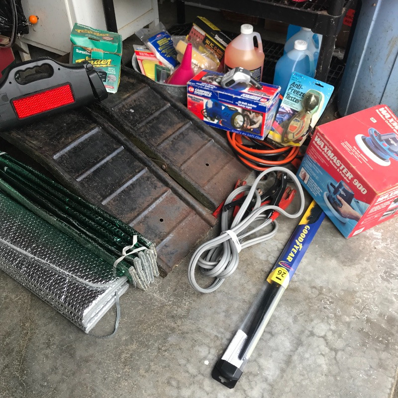 Large automobile accessory lot with lots of niceties and necessities. Two pairs of jumper cables, metal car ramps, sun shields and Good Year Hybrid 26 645mm wipers. Lot also includes a reflective light, WaxMaster 900, Campbell Hausfeld high pressure inflator and so much more! Working conditions are unknown. So much here, see images for all. Sterling Transitions does not guarantee any contents of chemical bottles.