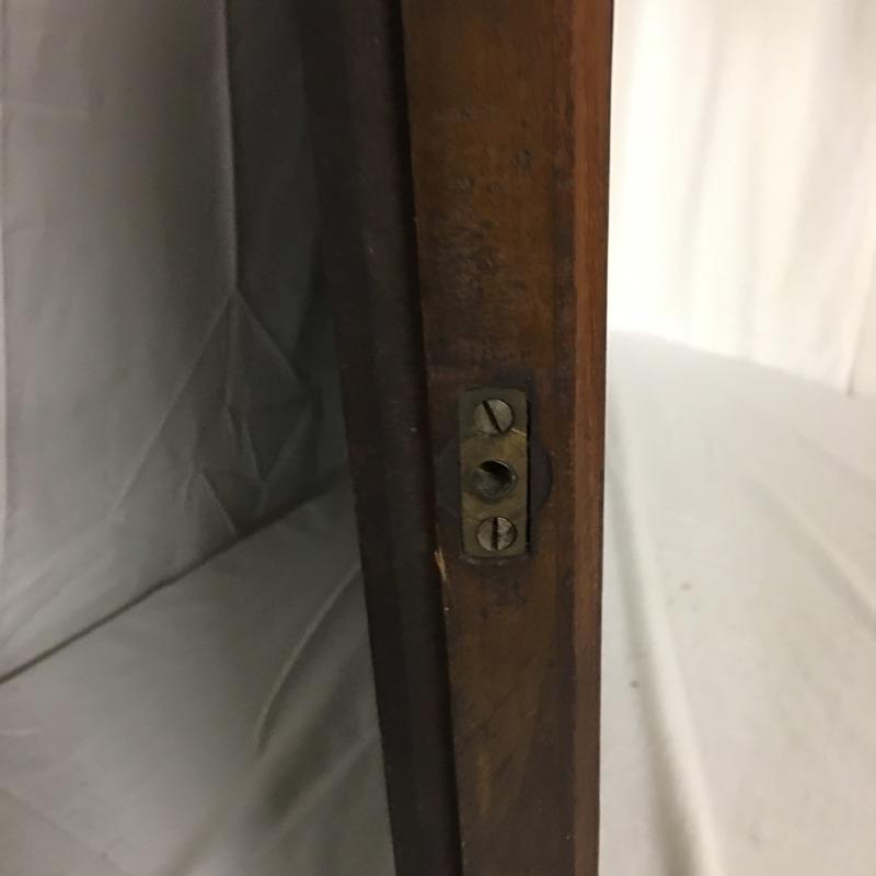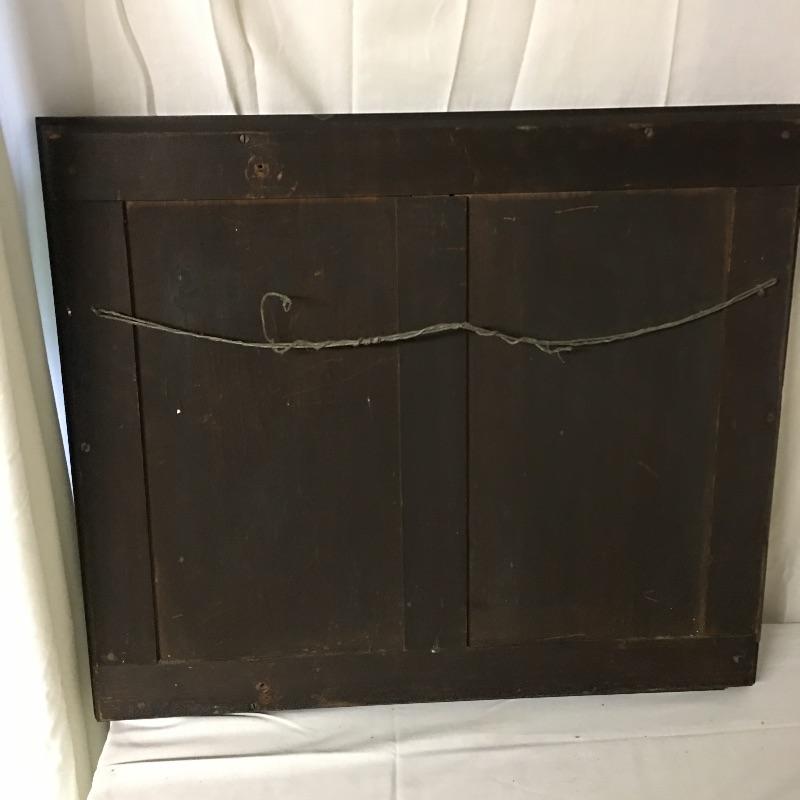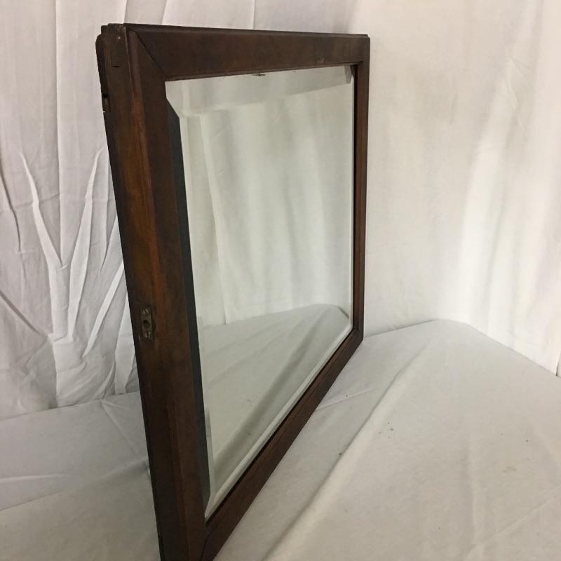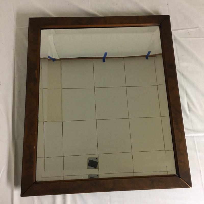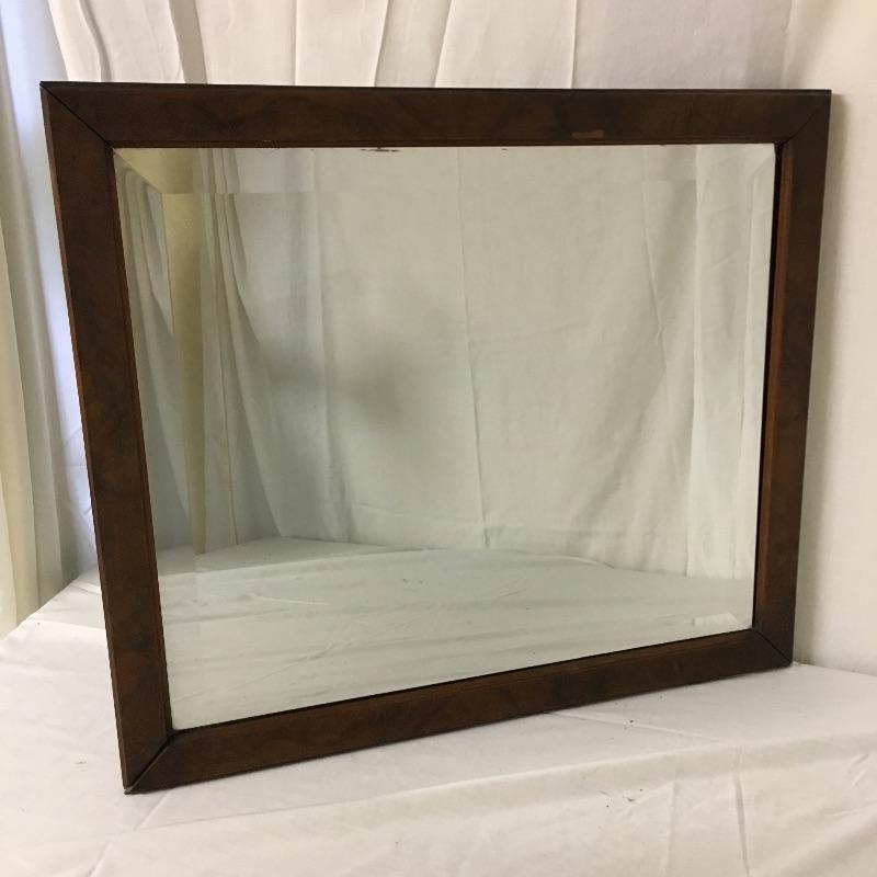 Classic beveled mirror in a heavy wooden frame. This mirror looks like it came from a dresser as it has a bracket on each side. This mirror is heavier than it looks and shows craftsmanship from days gone by. Mirror measures 23” x 27” x 2.5”.