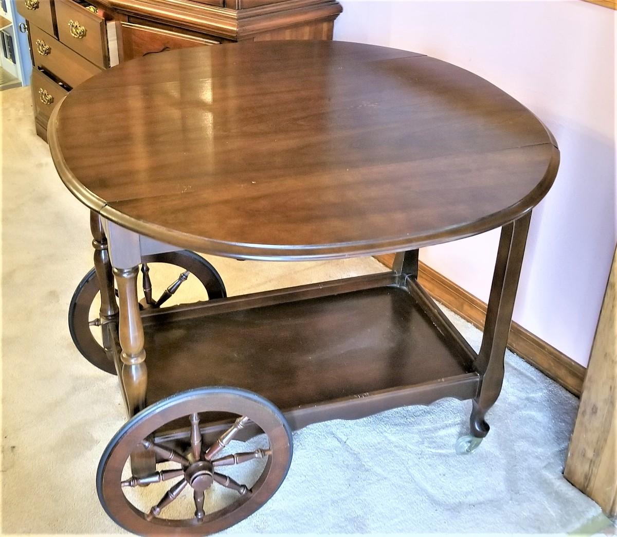 Nice vintage colonial style tea or bar cart - has drawer - drop leaf style - gallery tray on bottom. 28" tall, 35" across fully extended, 38.5" long - center top show a few signed of wear to the finish (see photo). On wheels and castors. Early 1970's.