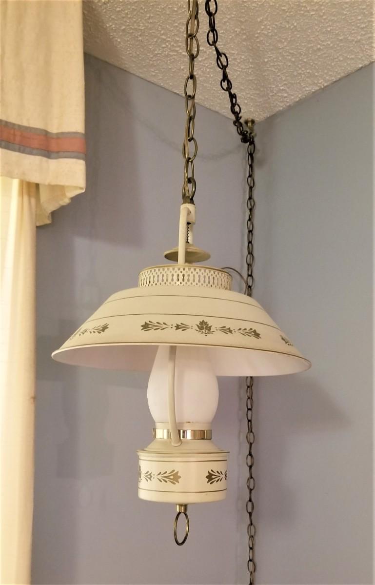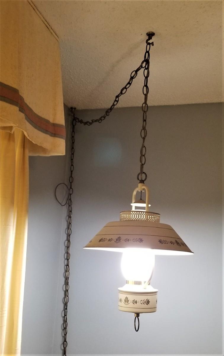 1970's swag lamp - classic "Tole" design - switch on cord. Lamp is about 18" long. Working condition.