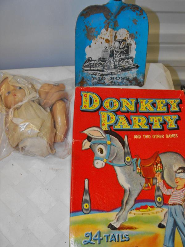 Also includes a Sombrero, Metal Toy Shovel and vintage doll whos arms and legs have fallen off but are present.