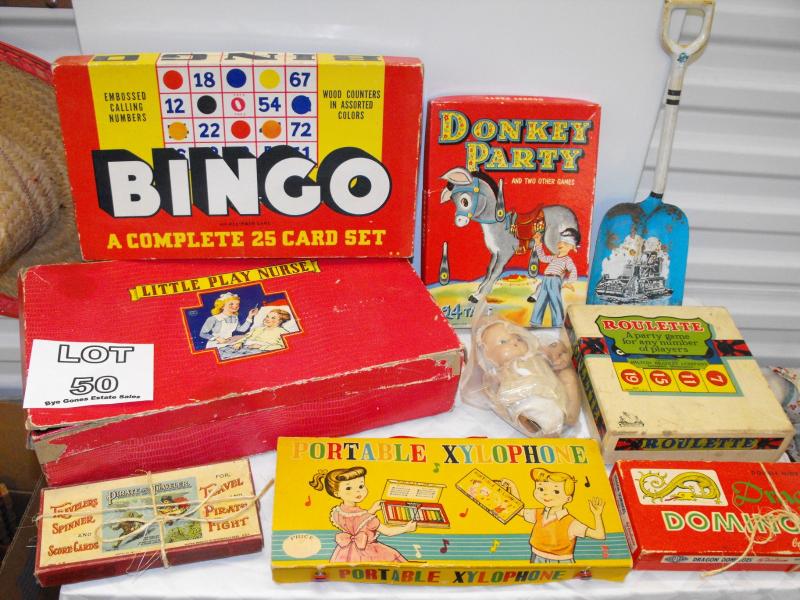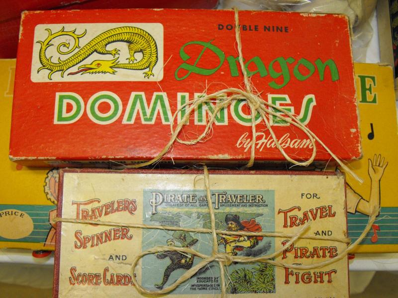 Vintage Dragon Dominoes, Pirates and Traveler, Donkey Party and Bingo board games. We did not untie the string to see if complete, boxes have some wear