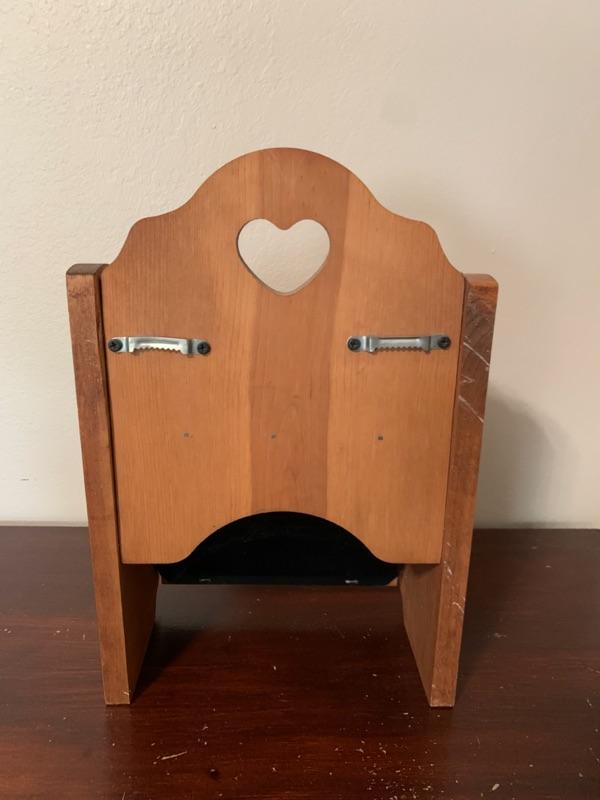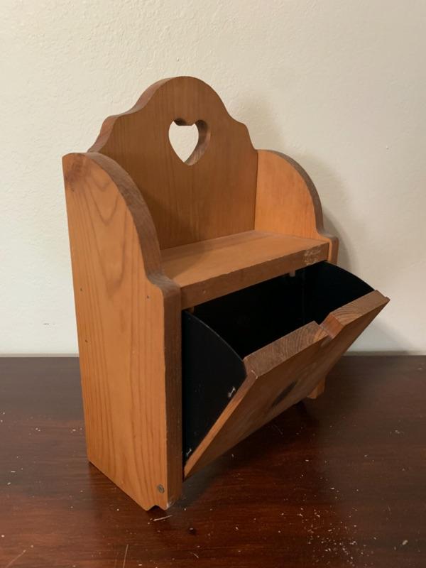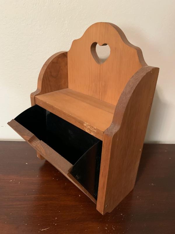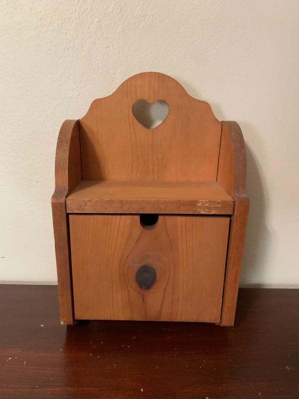 Unique hanging shelf /organizer with pull down front bin. Solid wood with heart cutout. Can sit on desk or hang on wall. Measures 9 3/4" across, 5" deep and 14 1/2 tall.