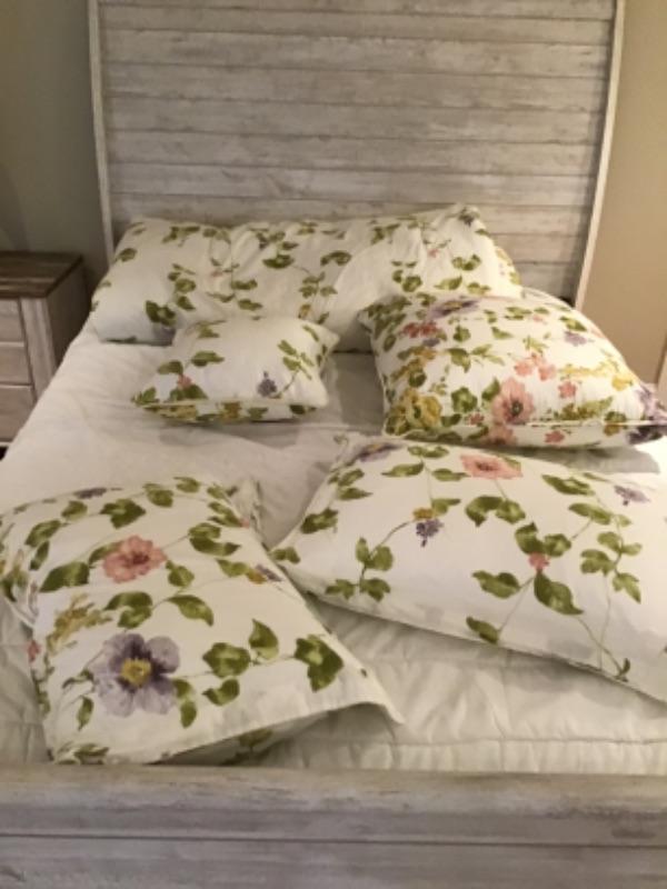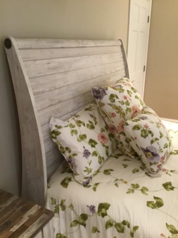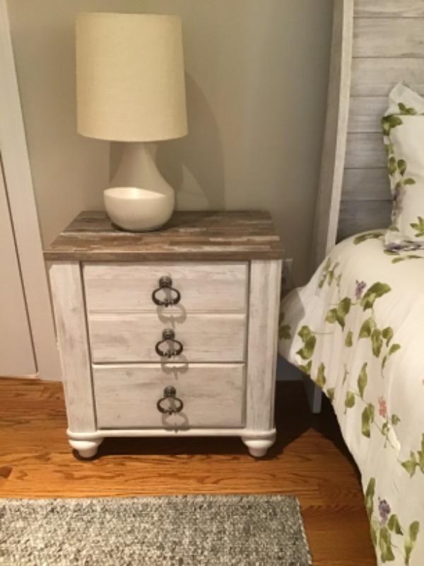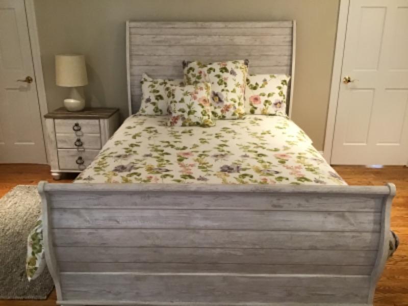 3 Piece Grey washed Bedroom Set - Dresser and Nightstand have unique tops. Pieces include : Queen size bed ( TAHARI HOME bedding included ), 3 Drawer nightstand, 8 Drawer Dresser, & Lamp