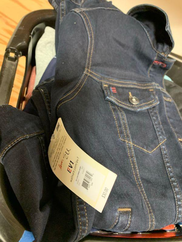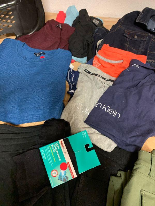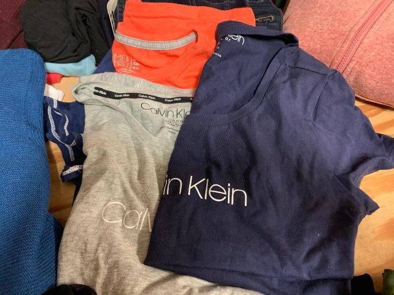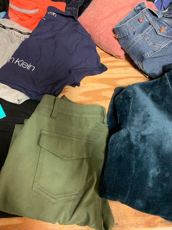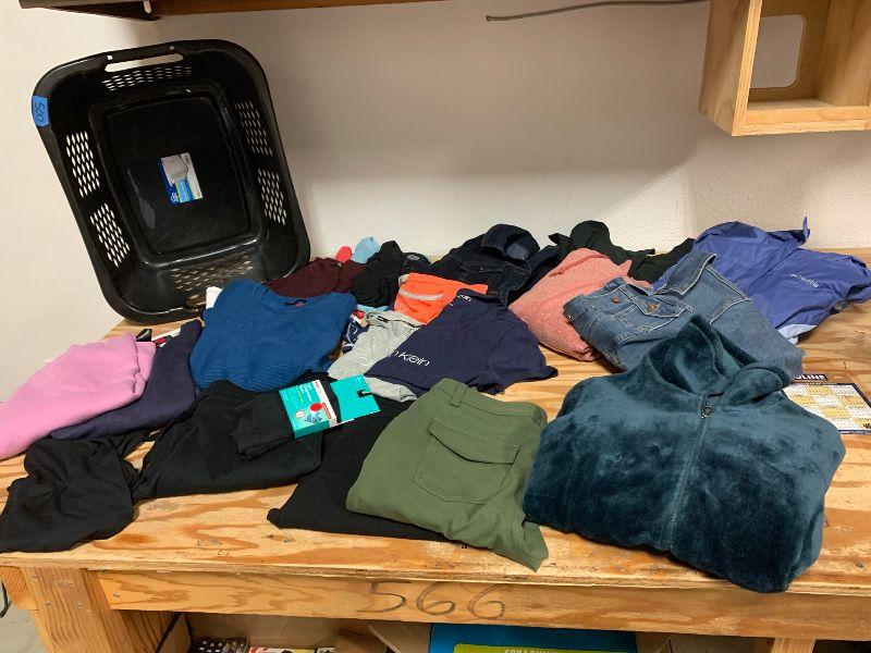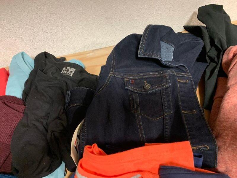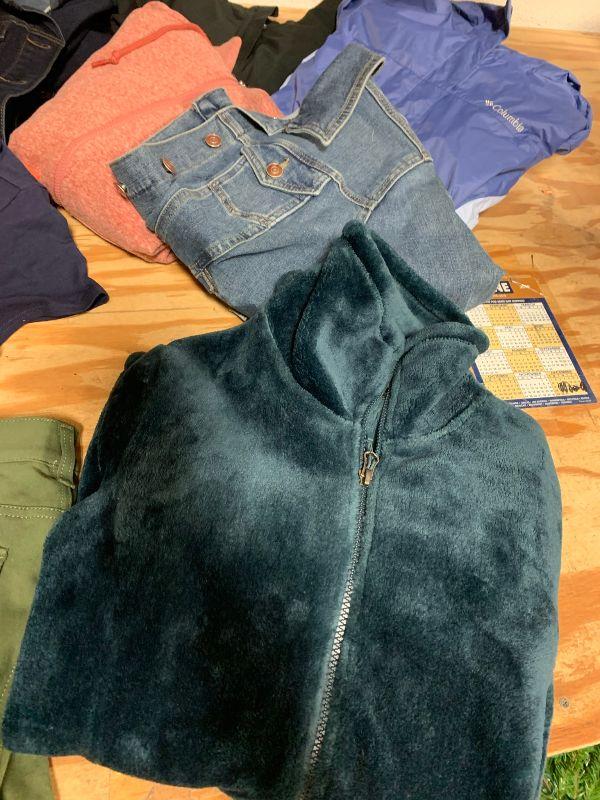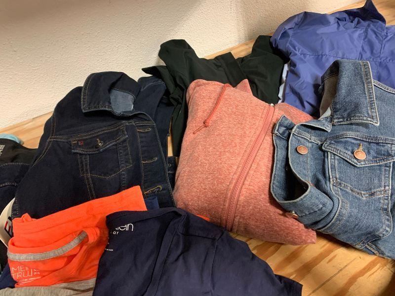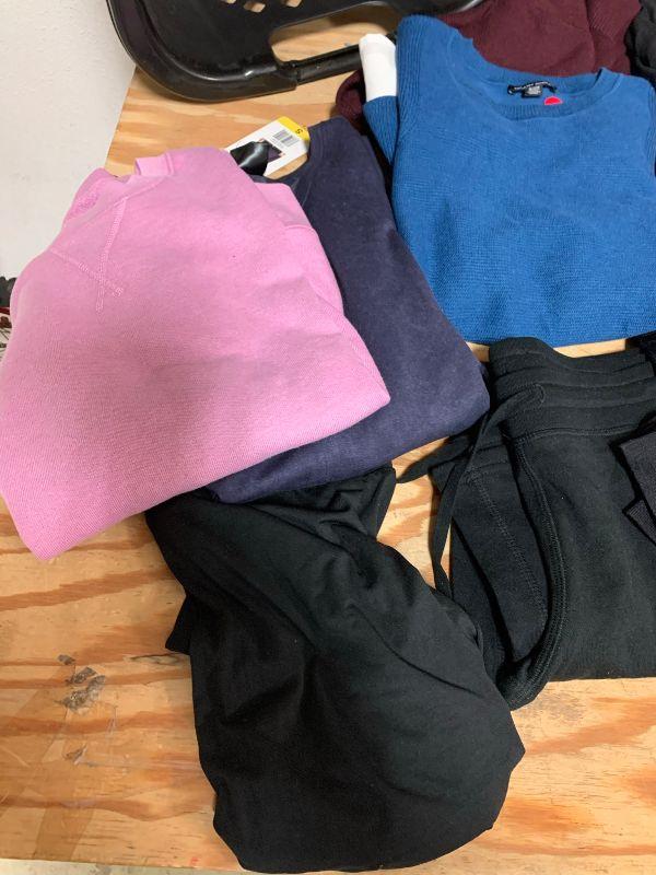 Ladies clothes size small, Rain Jacket x2, Sweaters x 2, Zip ups x2, Jean Jackets x2, short sleeve shirts x 4, Sweatpants x 2, pants x 2, Sleeveless x 5, and 1 pair of compression socks