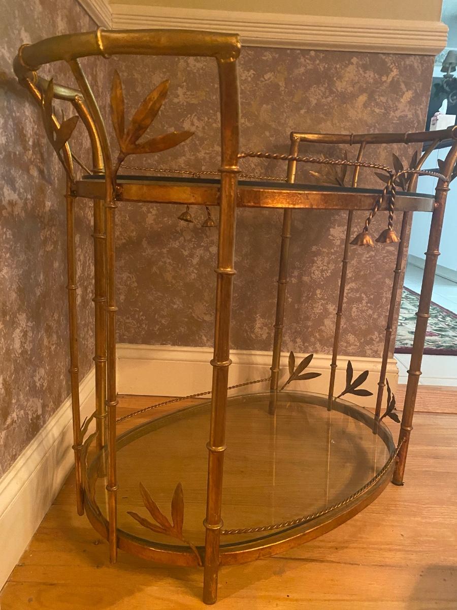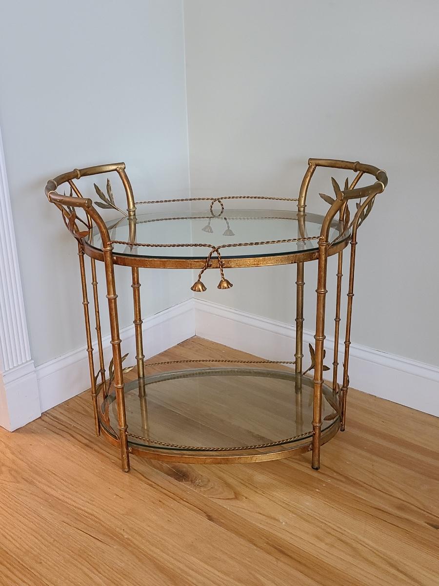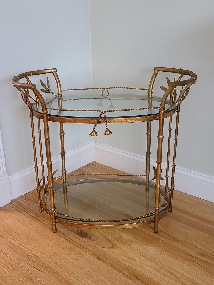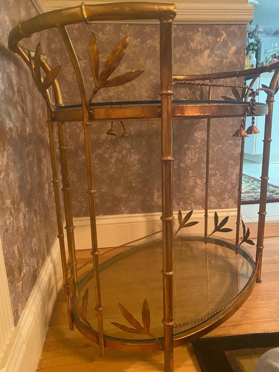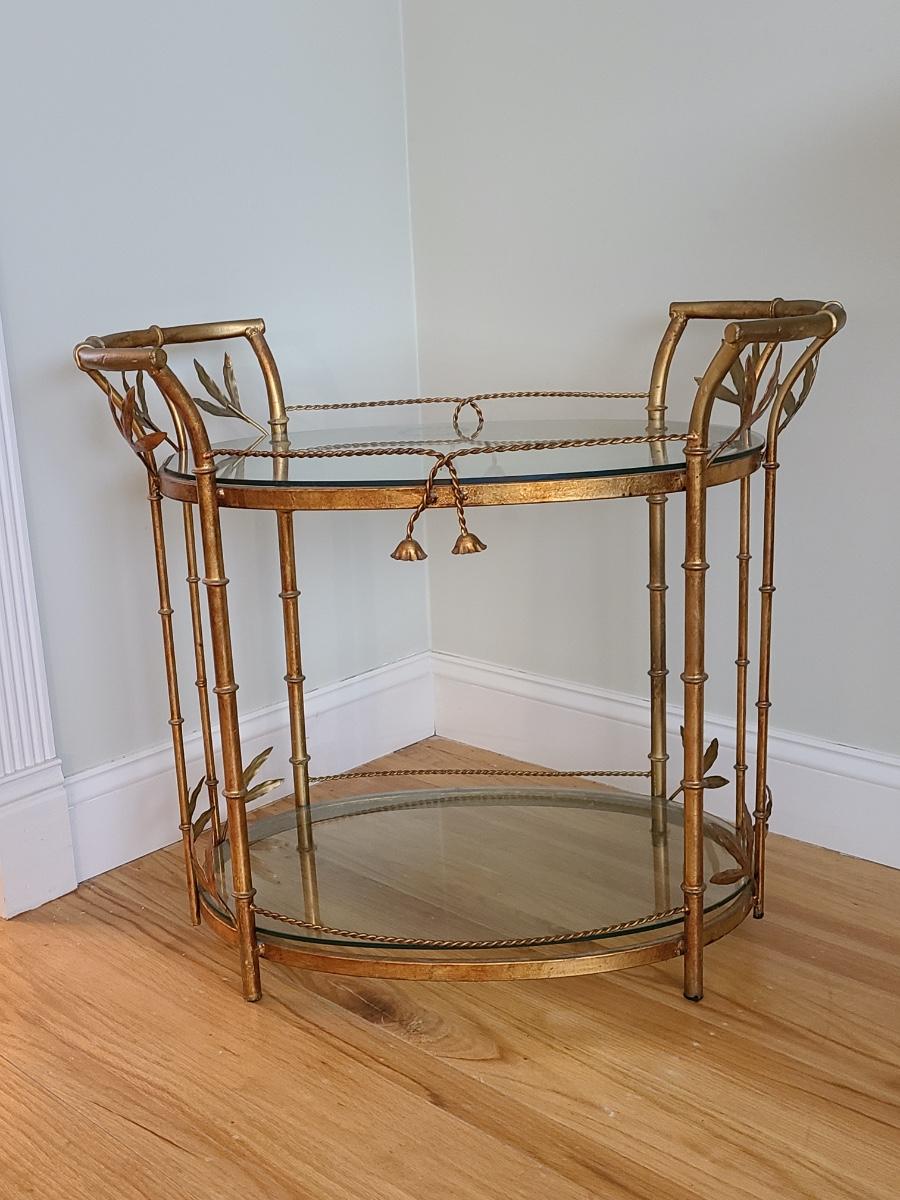 Vintage metal and glass bar cart, with a Hollywood Regency Style. Metal is golden color. This can be used as is, but also can be upcyled with mirrors for added flair! Cart measures 29”x 26”x16”. Please see all pictures as they are the best representation of the items. The pictures show condition, measurements if taken, and what is included in the lot. Due to the large amount that we photograph and the time frame, we are not always able to take measurements. All items unless noted, are pre-owned and have been used. If you purchased furniture, you must bring help. We do not allow one person to carry large furniture out on their own. Bring help, tools and a truck for the safety of our client’s homes, and your personal safety. Company policy. Thank you.