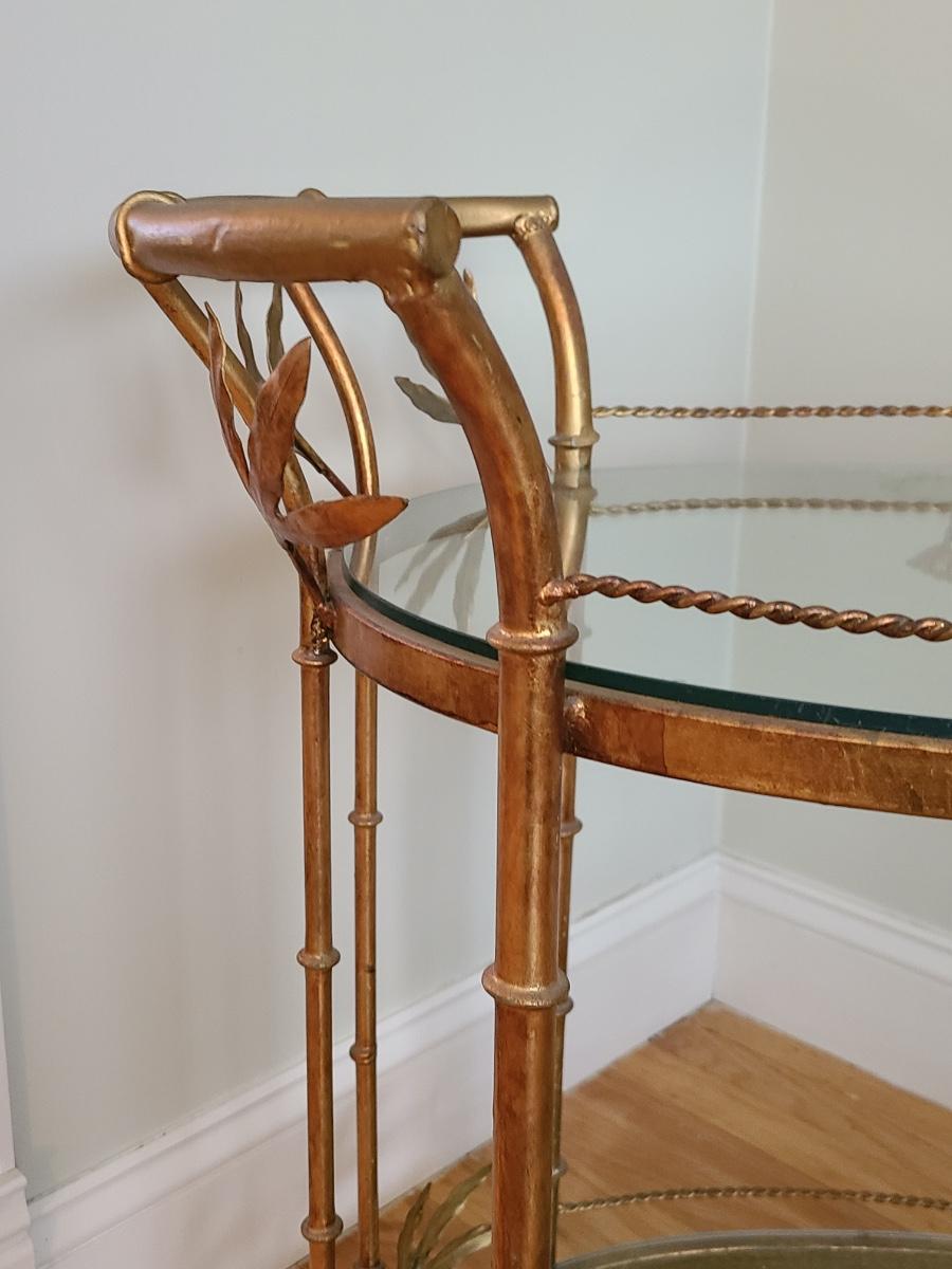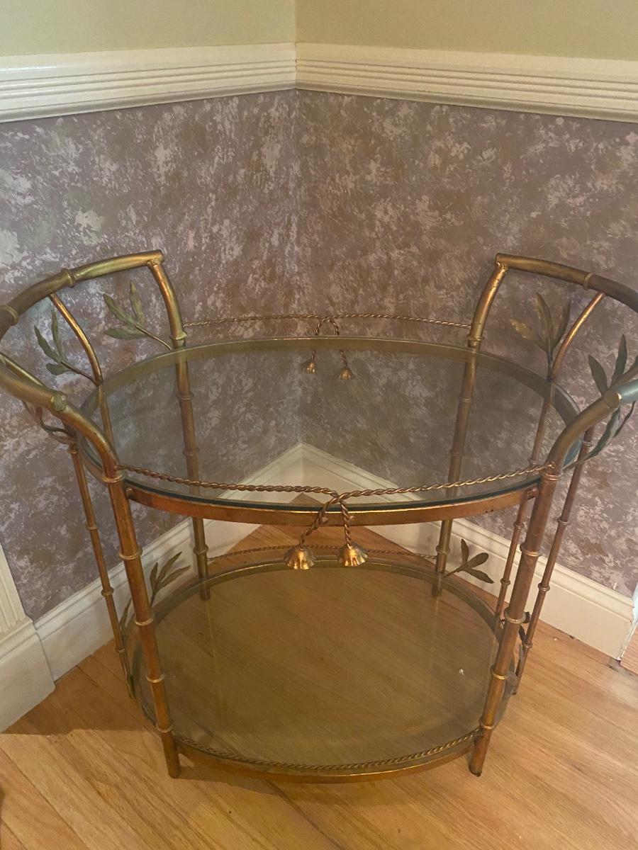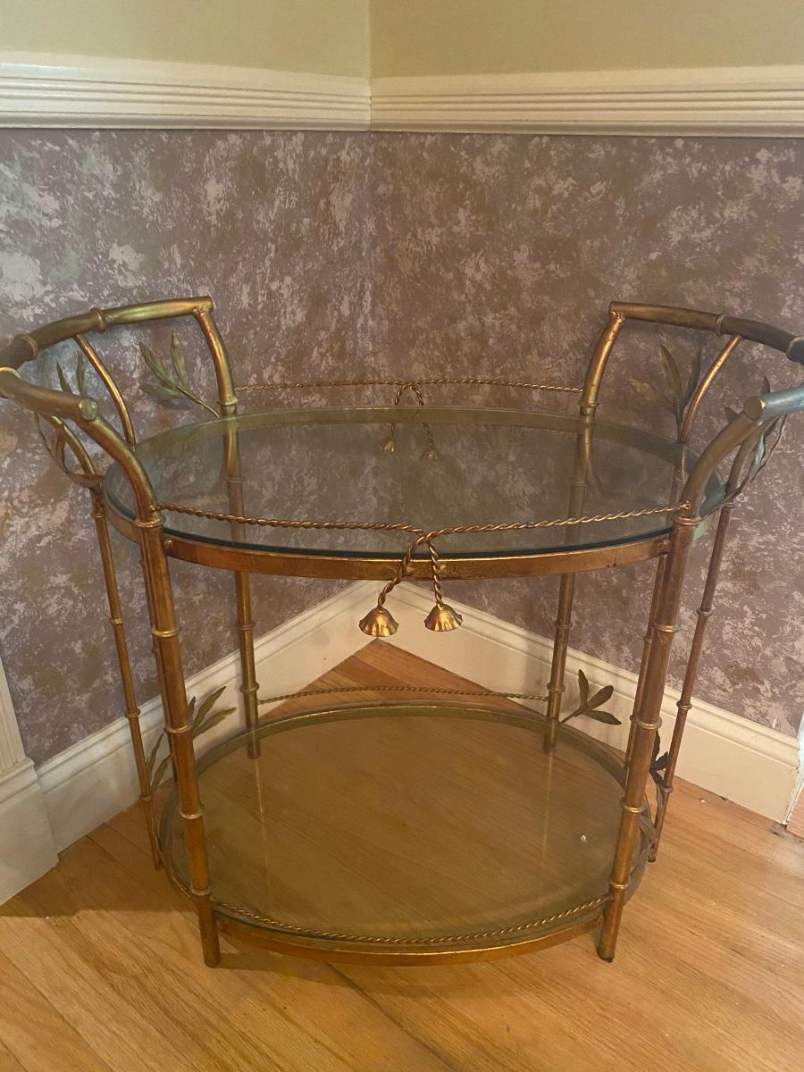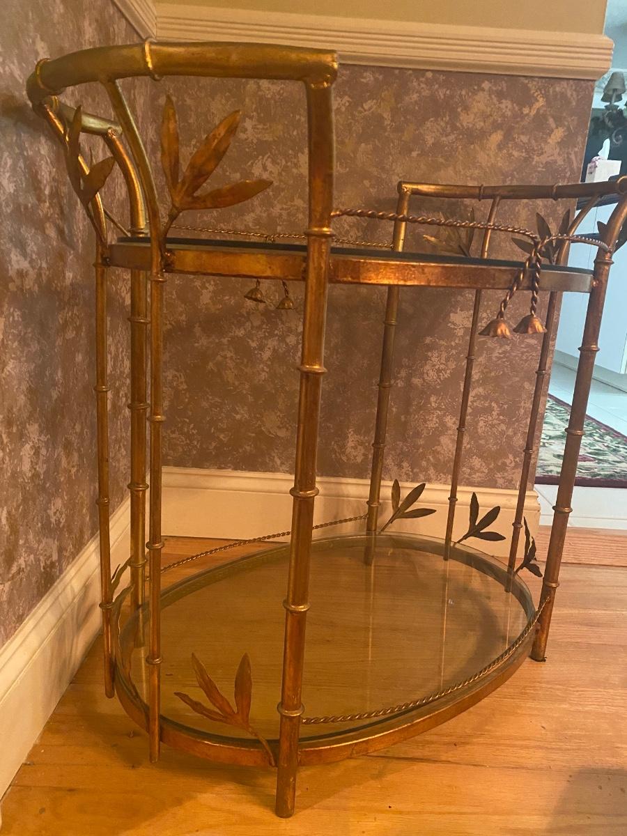 Vintage metal and glass bar cart, with a Hollywood Regency Style. Metal is golden color. This can be used as is, but also can be upcyled with mirrors for added flair! Cart measures 29”x 26”x16”. Please see all pictures as they are the best representation of the items. The pictures show condition, measurements if taken, and what is included in the lot. Due to the large amount that we photograph and the time frame, we are not always able to take measurements. All items unless noted, are pre-owned and have been used. If you purchased furniture, you must bring help. We do not allow one person to carry large furniture out on their own. Bring help, tools and a truck for the safety of our client’s homes, and your personal safety. Company policy. Thank you.