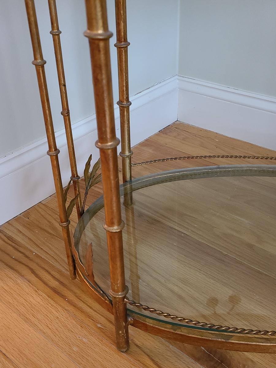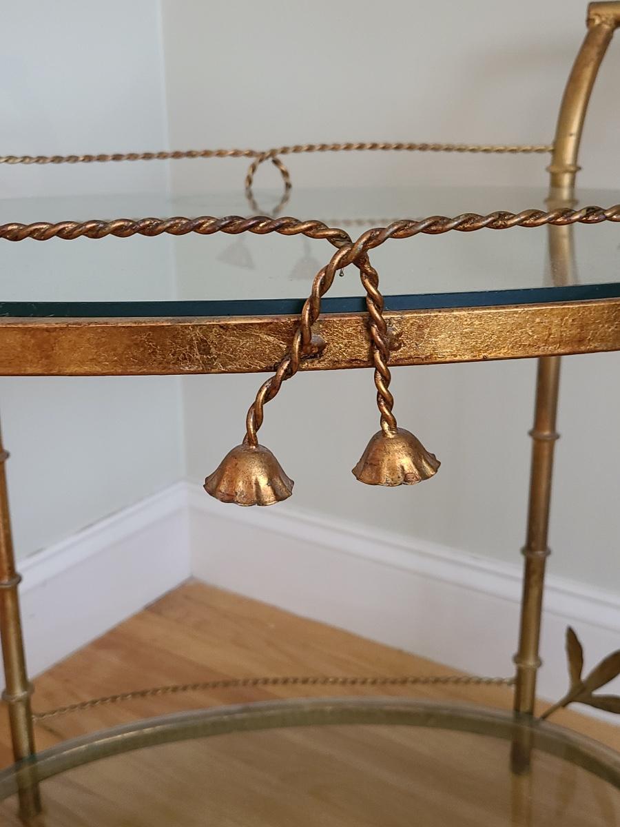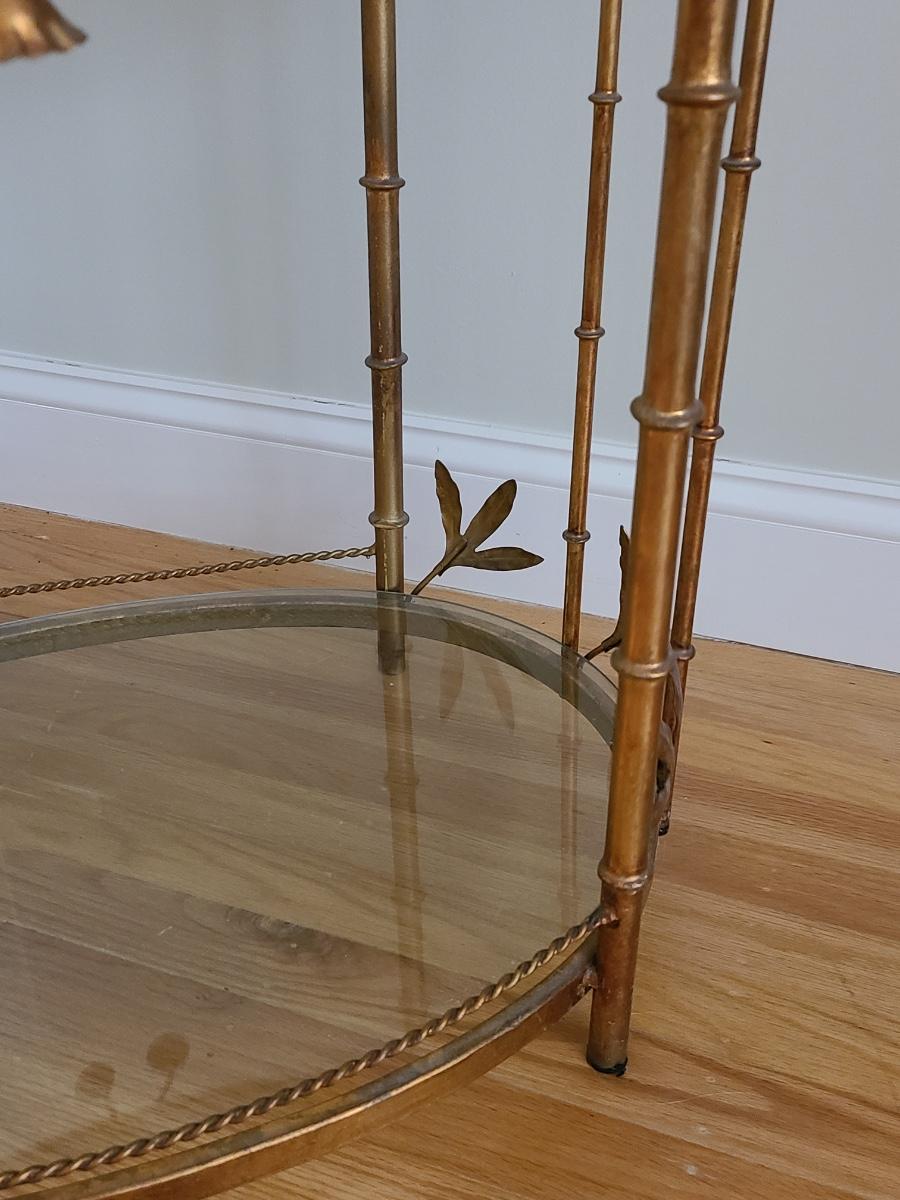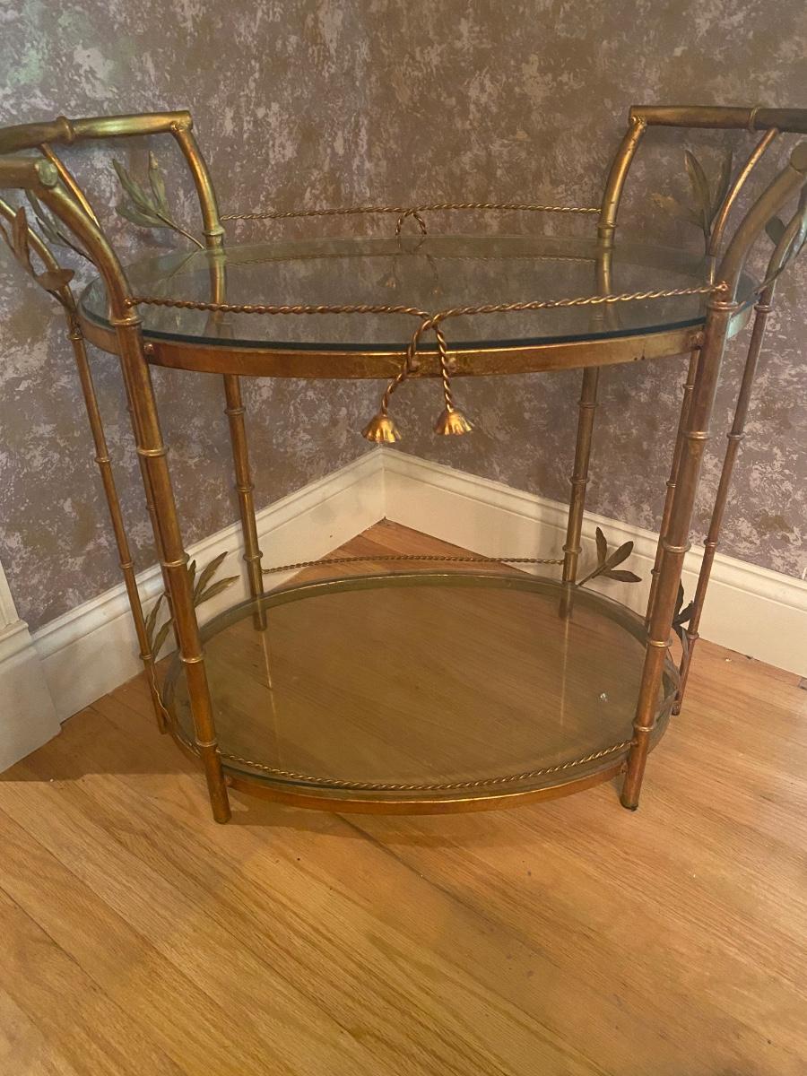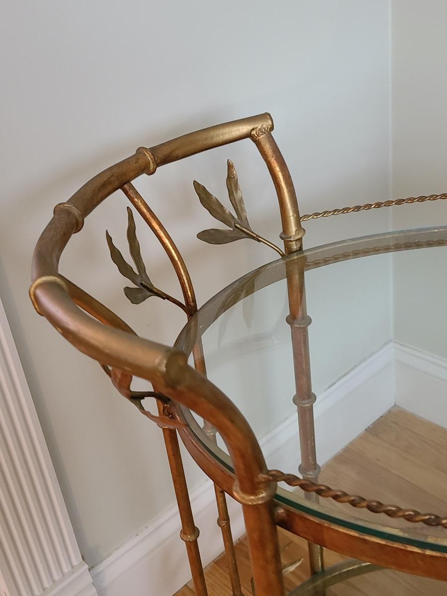 Vintage metal and glass bar cart, with a Hollywood Regency Style. Metal is golden color. This can be used as is, but also can be upcyled with mirrors for added flair! Cart measures 29”x 26”x16”. Please see all pictures as they are the best representation of the items. The pictures show condition, measurements if taken, and what is included in the lot. Due to the large amount that we photograph and the time frame, we are not always able to take measurements. All items unless noted, are pre-owned and have been used. If you purchased furniture, you must bring help. We do not allow one person to carry large furniture out on their own. Bring help, tools and a truck for the safety of our client’s homes, and your personal safety. Company policy. Thank you.