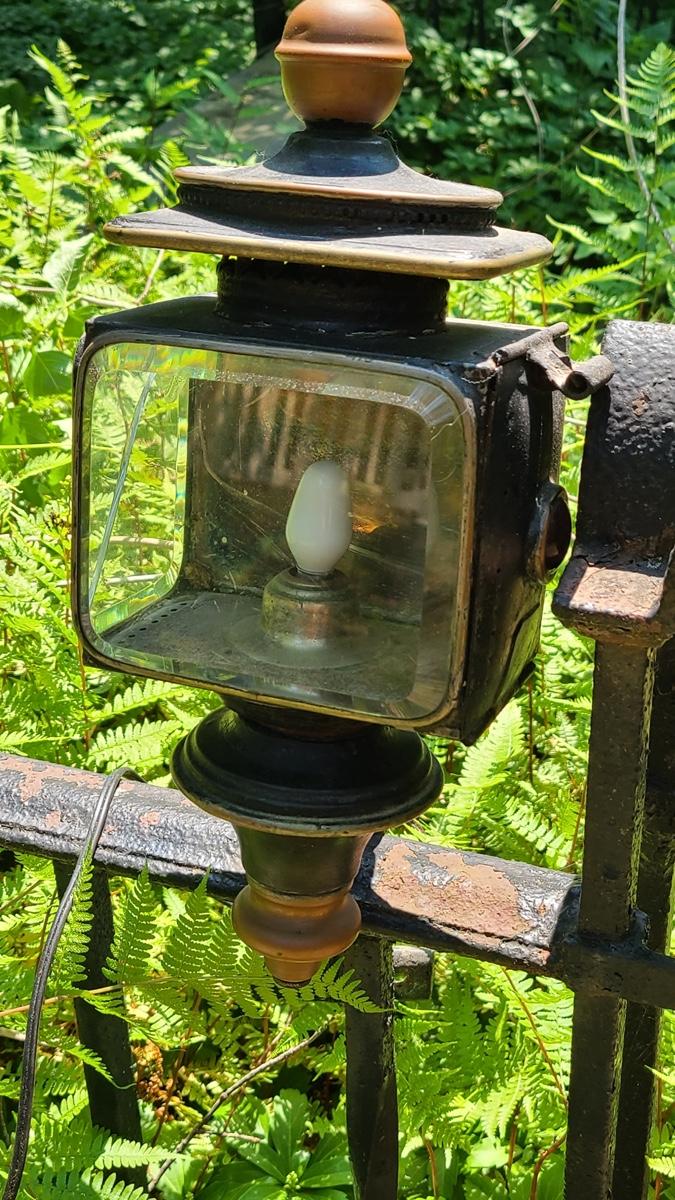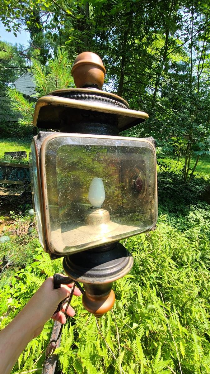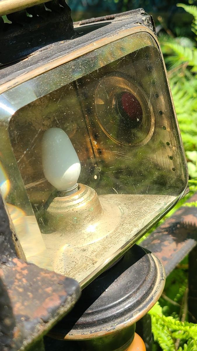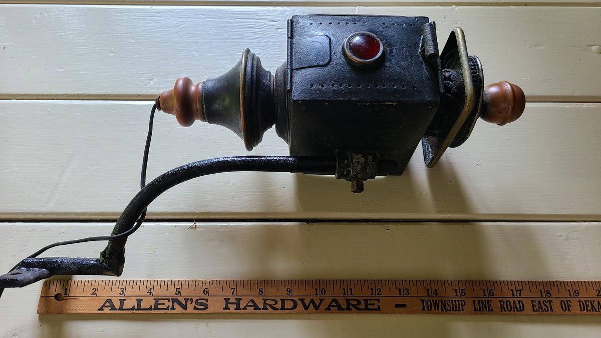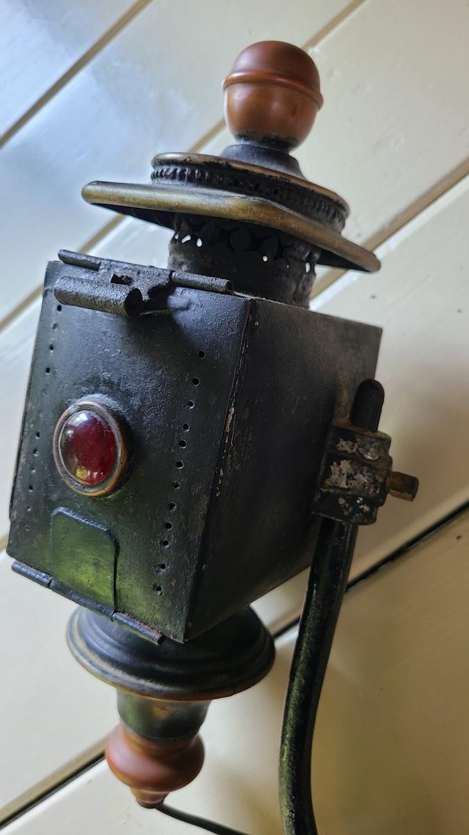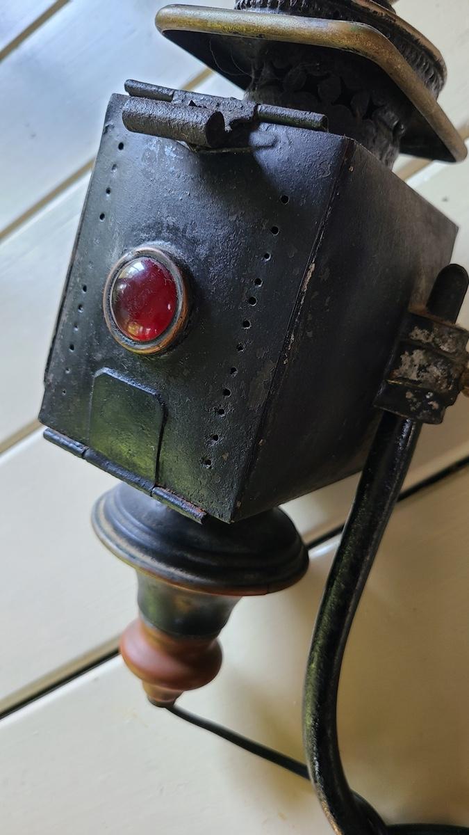 This is a such a unique piece of history. This would have been mounted on a carriage and it has the cast iron arm attached to mount to wall. This was wired to use in the home, and was mounted to a wood antique beam and cast a soft glow of light. It has original glass (side panel is broken but intact), side red glass, copper and black metal frame, and cast iron parts. Fun piece to own and a statement piece! Pictures are the best representation of the item in the lot, the condition of the items in the lot, and the size if measurements were taken. All items are sold as-is, since they are pre-owned and antiques. We are not experts and do our best to describe and pictures have been taken from every angle. Thank you for looking and have fun bidding.